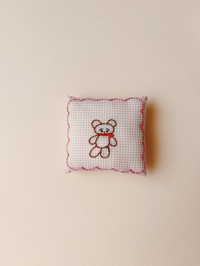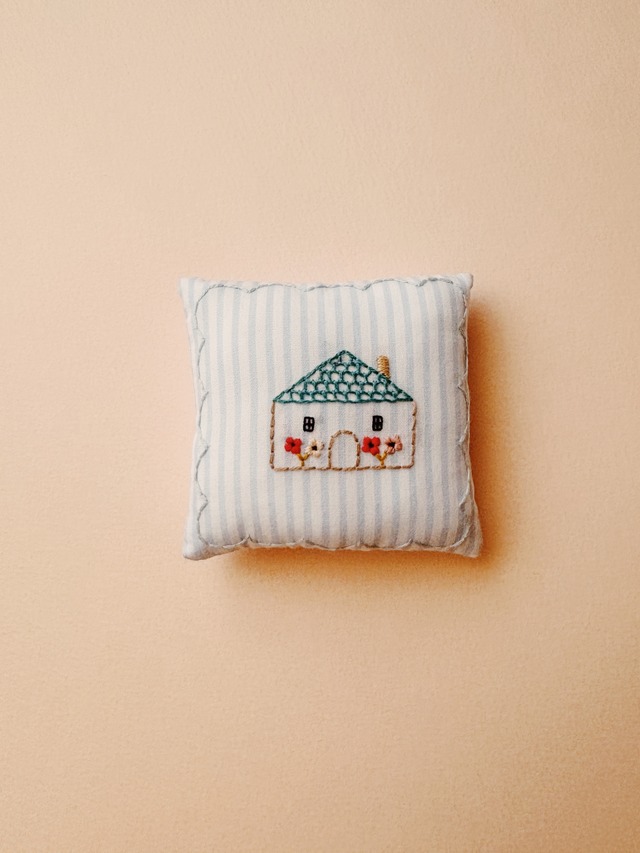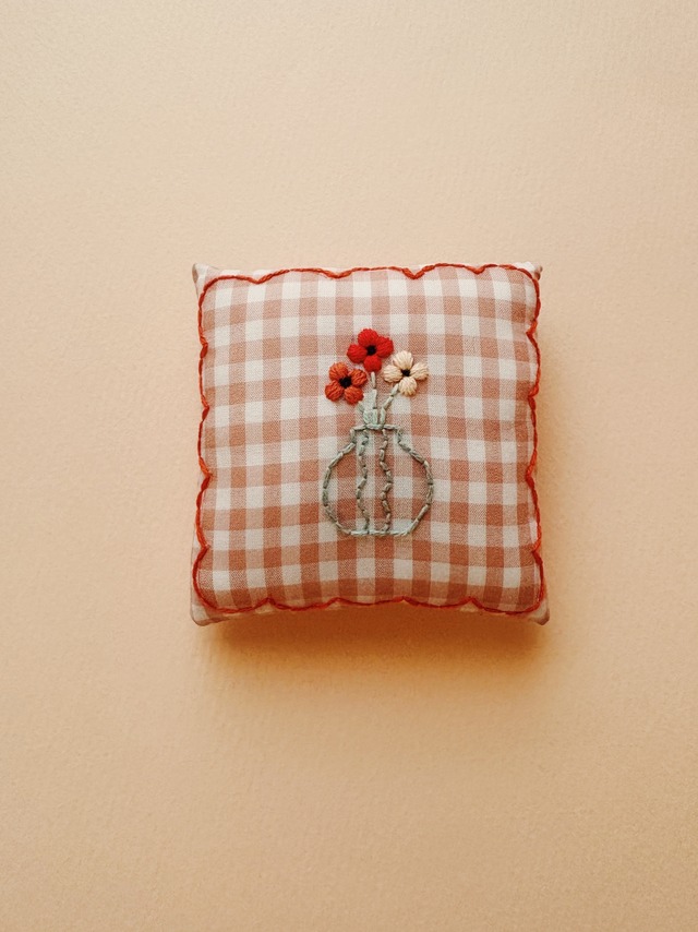 手刺繍の入った小さなピンクッション。刺繍やお裁縫をする時にお役に立てるといいなと思って作りました。持っているだけで針仕事が楽しくなるような、お道具です。これから刺繍を始めてみようかな、という方にもおすすめです! サイズ 約7cm x 7cm 素材 表 コットン100% 中のわた ポリエステル100% *お届けするのはピンクッションのみになります。撮影用のまち針やハサミ、その他の作品はついてきませんので、ご注意ください。 注• ピンクッションは全てアトリエにて、作家の手によってつくられています。同じ柄でも、ひとつひとつの表情が少しずつ違いますが、ご理解いただけますようお願いいたします。