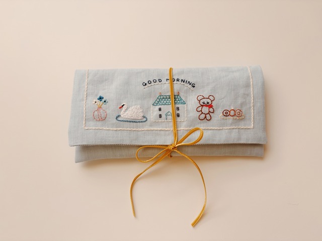 大切なものを入れる、可愛い刺繍のポーチがあったらいいなと思って作りました。 リボンを結んで、旅行鞄に入れたり、良い香りのサシェや石鹸を入れて引き出しに入れたり、 色々な楽しみ方ができます。お裁縫道具を入れるにも良いサイズだと思います。 上質なリネンを使用しているので、末長くお使いいただけると思います。 白鳥やお家、ドーナツなど、最近お気に入りのモチーフを色々入れてみました。 素材 表布 リネン100% 裏布 コットン100% サイズ 縦約10cm x 横約21cm 注•刺繍の作品は全てアトリエにて、作家の手によって作られています。ひとつひとつ刺繍が違い、一点ずつなので再入荷の予定はありません。お気に入りを見つけていただけたら嬉しいです。 *画像1枚目の作品のみの販売となります。他の作品や小物は撮影用となりますので、ご注意ください。 *ベルベットのリボンは、お洗濯には強くないので、洗濯機は使用しないでください。 洗いたい場合は、なるべくリボンを濡らさないようにして、布部分を優しく手洗いしてください。