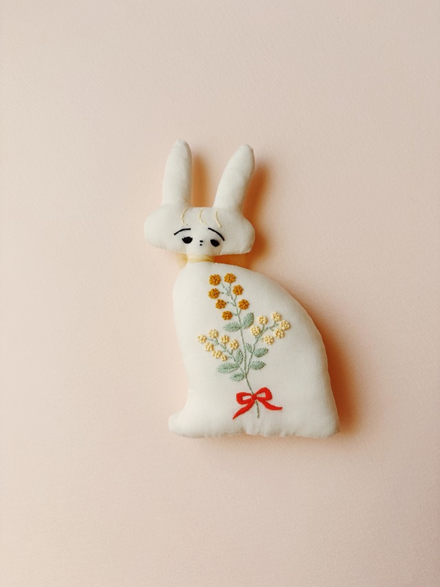 春をイメージした、ミモザのお花を刺繍してみました。まだ外が寒くても、黄色いお花を見ると、春の始まりを感じます。 お花と前髪の色にぴったりの色のリボンは、よく見ると少しキラキラとしたラメが入っていて綺麗です。 複数並べるとまたかわいいシリーズです。 サイズ たて 約14cm よこ 約8cm 素材 本体 コットン100% リボンの部分 ナイロン67% ポリウレタン33% 中わた ポリエステル100% 注•ぬいぐるみは全てアトリエにて、作家の手によって作られています。ひとつひとつ刺繍が違い、一点ずつなので再入荷の予定はありません。お気に入りを見つけていただけたら嬉しいです。