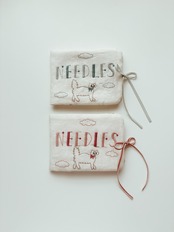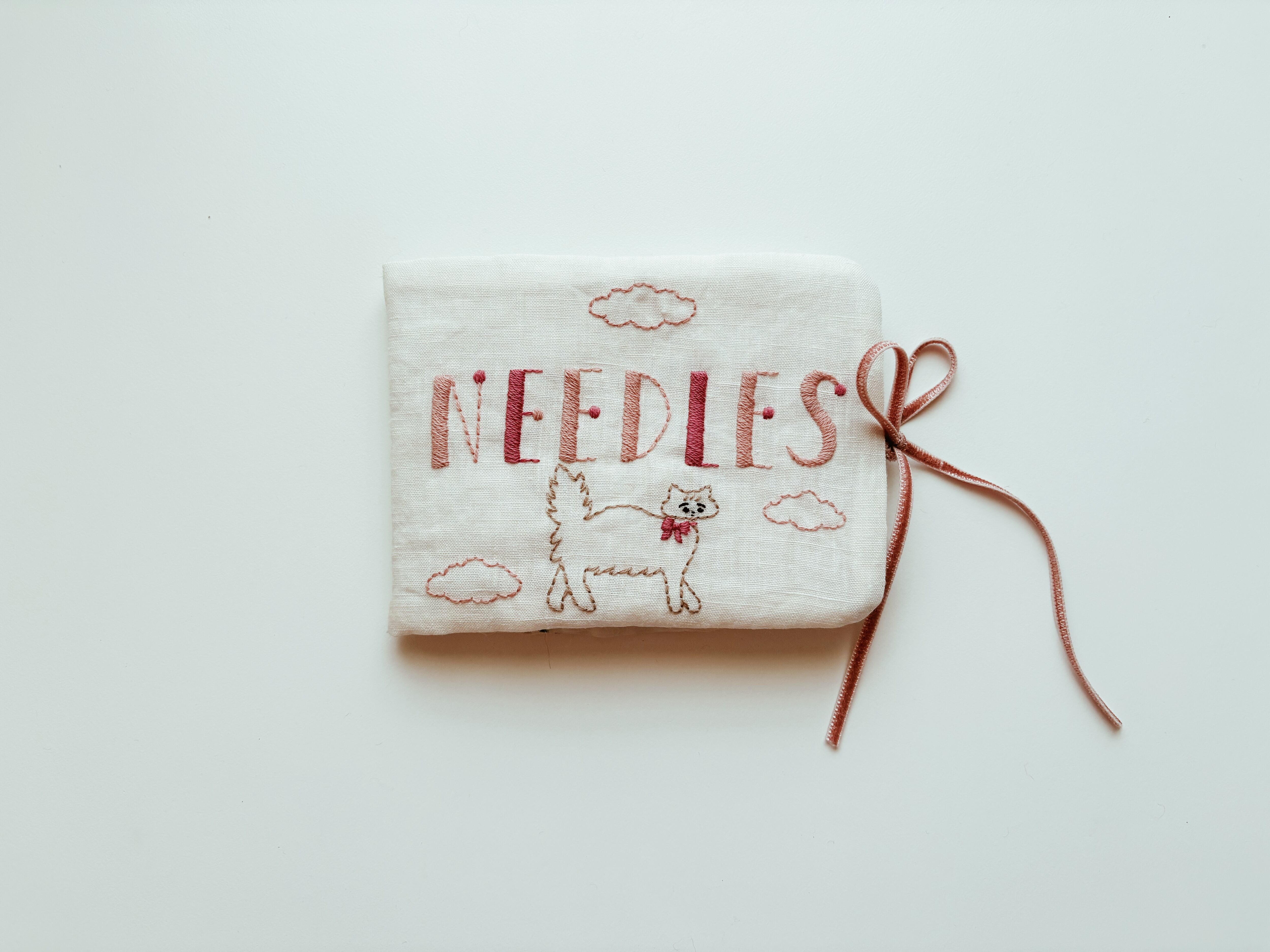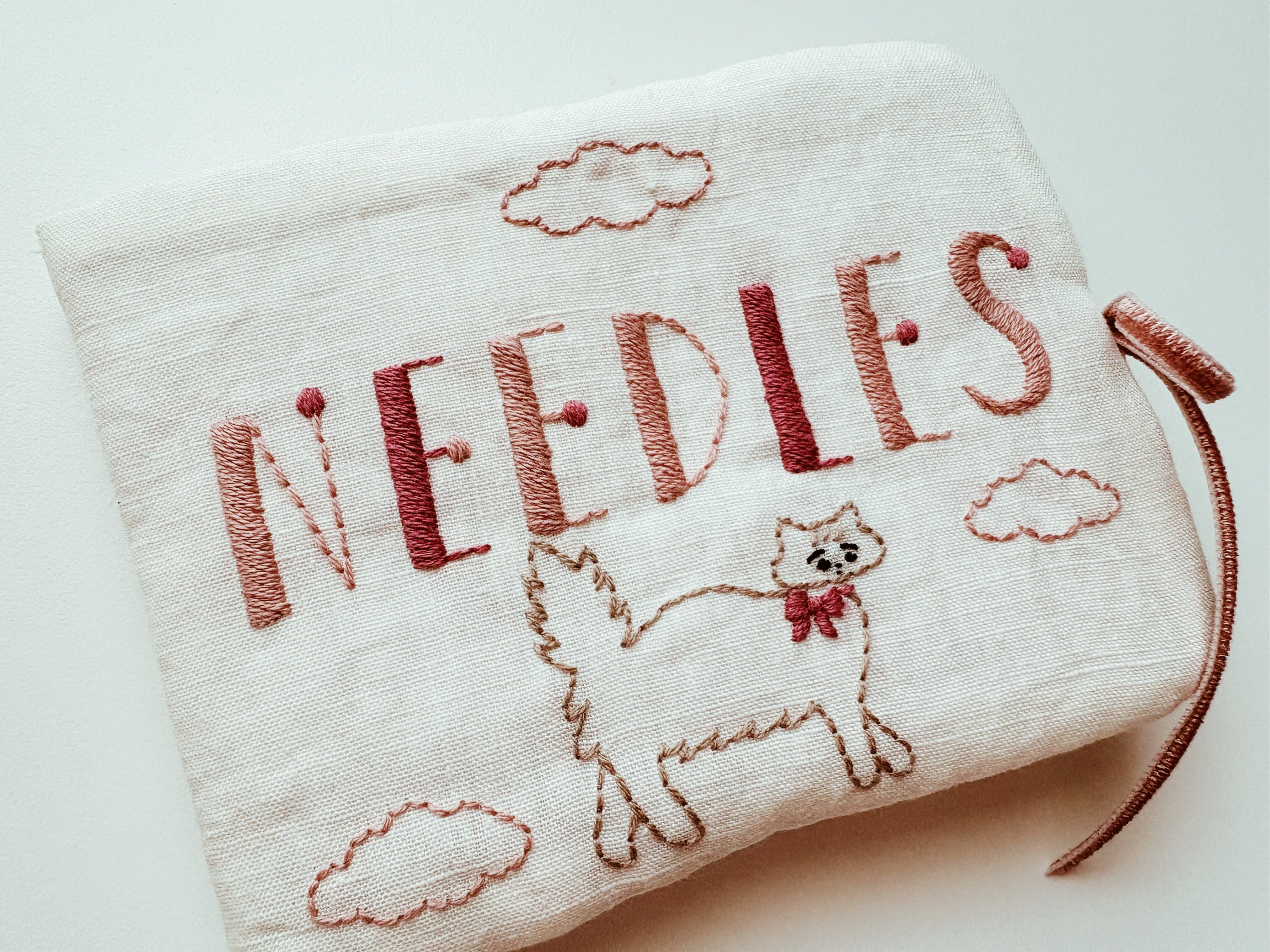 刺繍のレッスンなど、お出かけ先で針を使う時や、おうちで手元に一軍の針を揃えたい時にあったらいいなと思ってかわいいニードルケースを作りました。サテンステッチで刺したNEEDLESの文字と、空を歩くねこの柄は今回の新作の図案です。