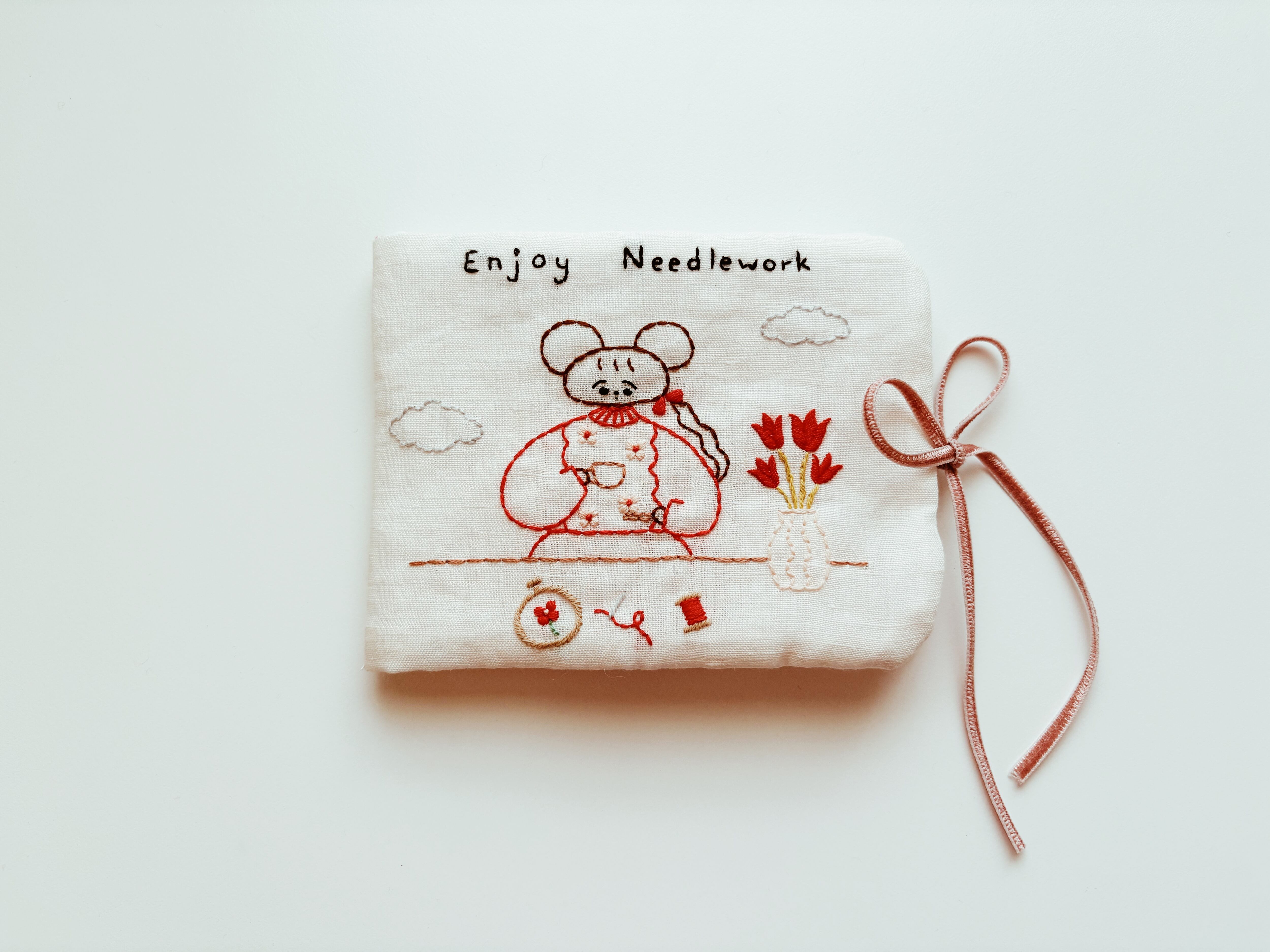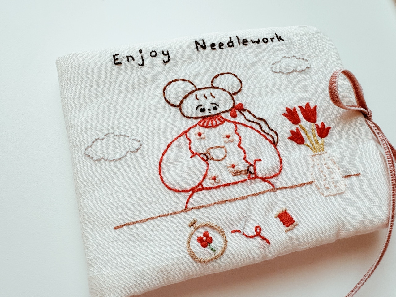 刺繍のレッスンなど、お出かけ先で針を使う時や、おうちで手元に一軍の針を揃えたい時にあったらいいなと思ってかわいいニードルケースを作りました。空の下でお茶を飲みながら刺繍をする女の子の柄は、今回の新作の図案です。
