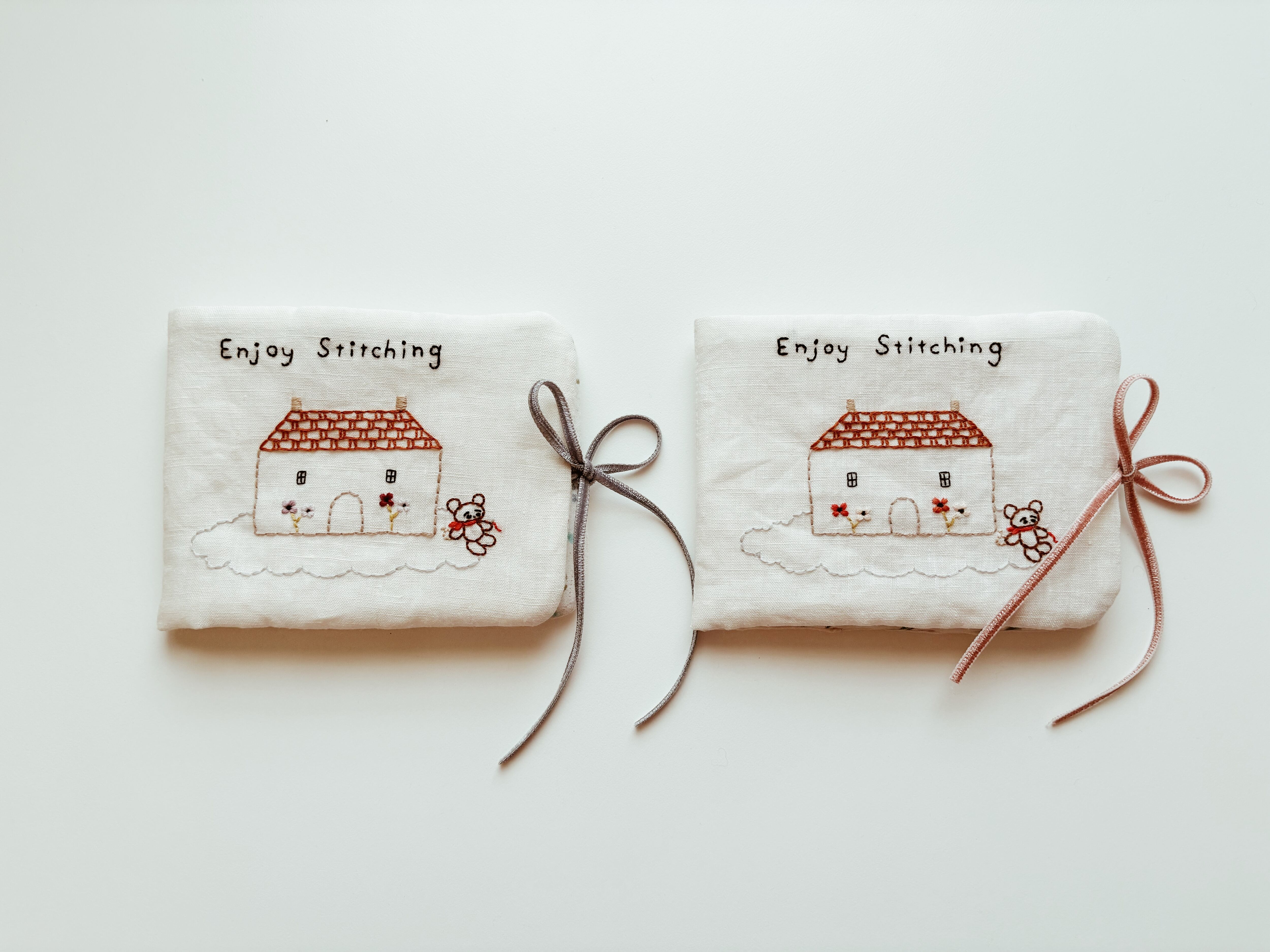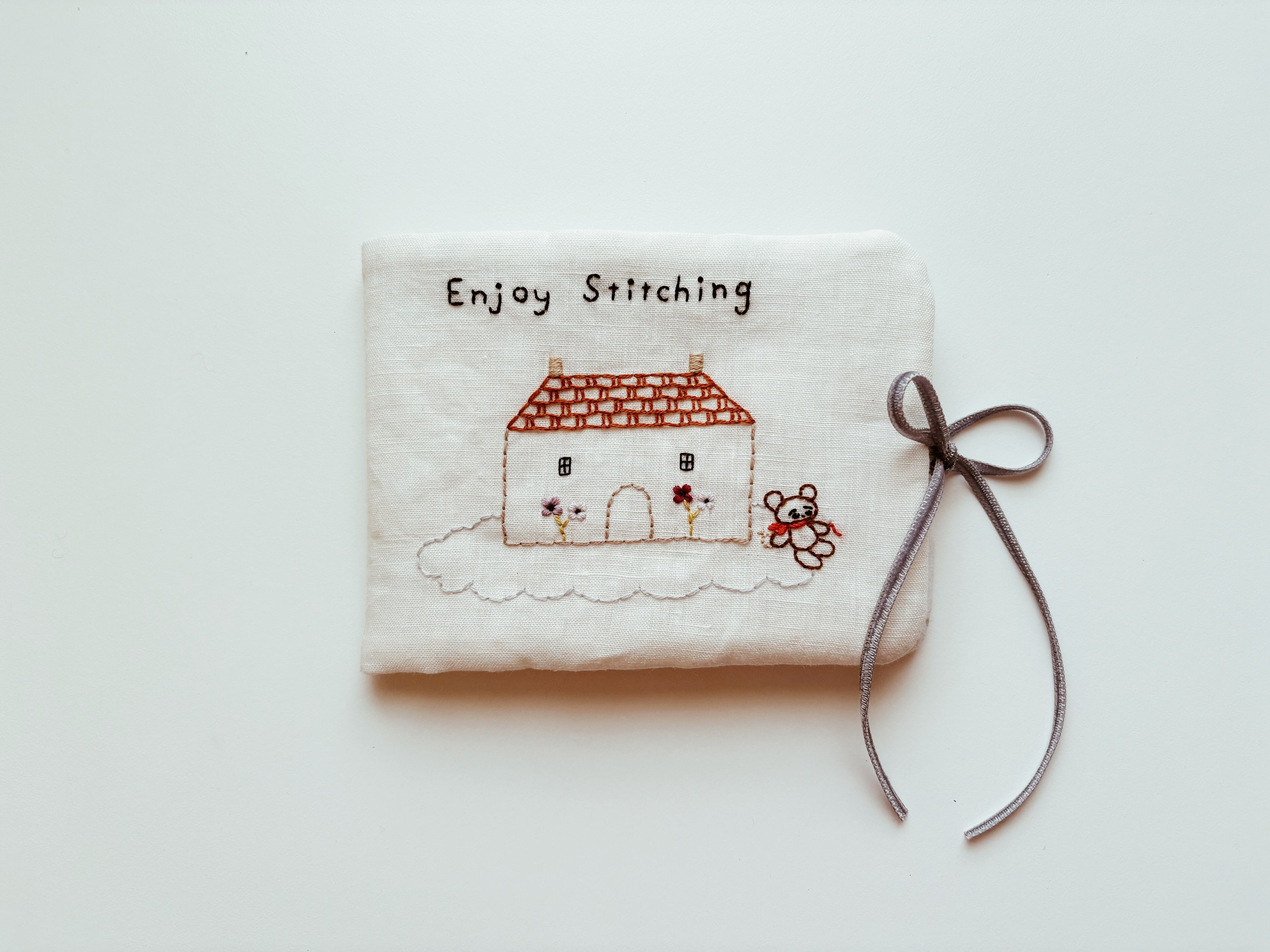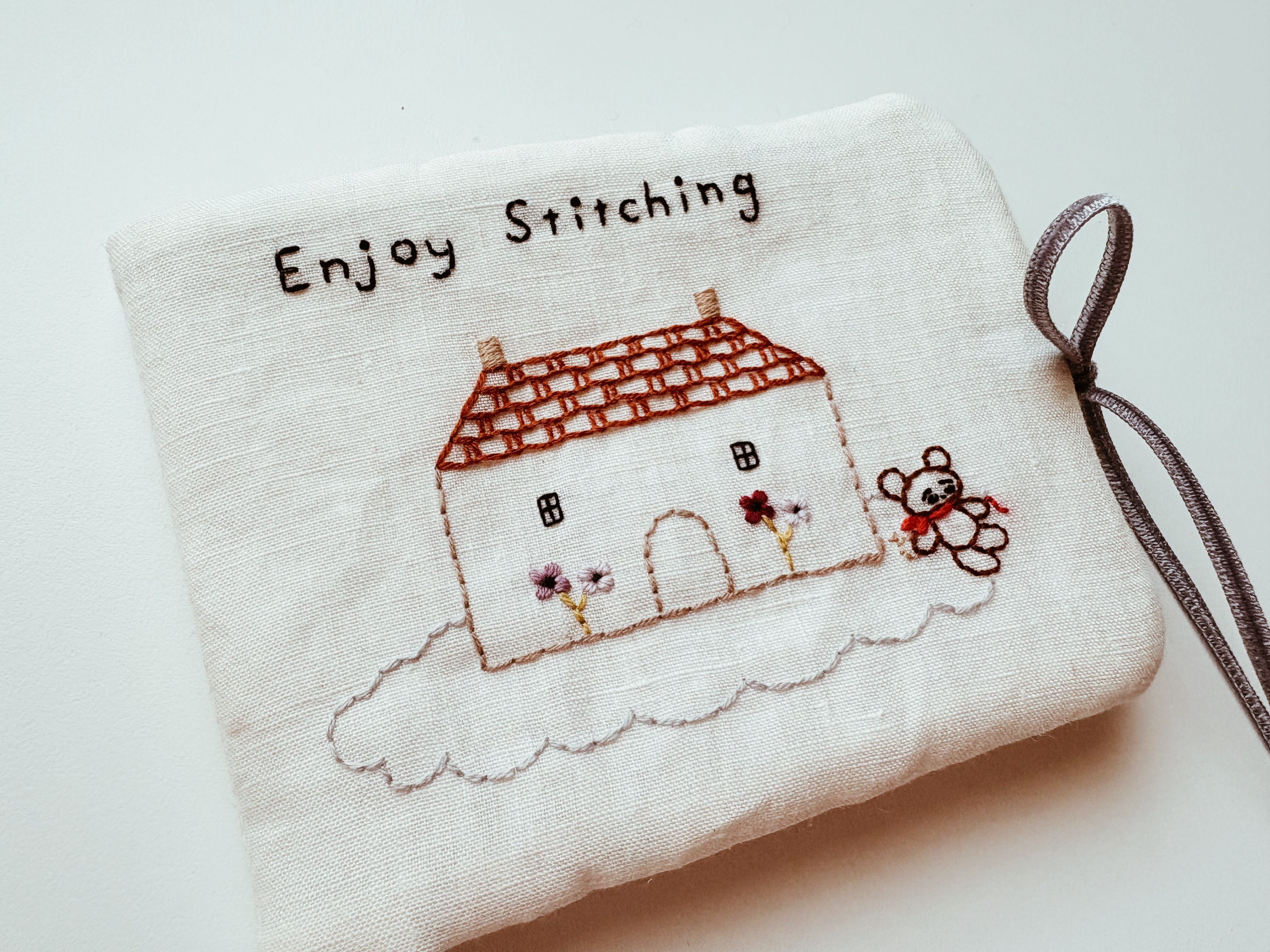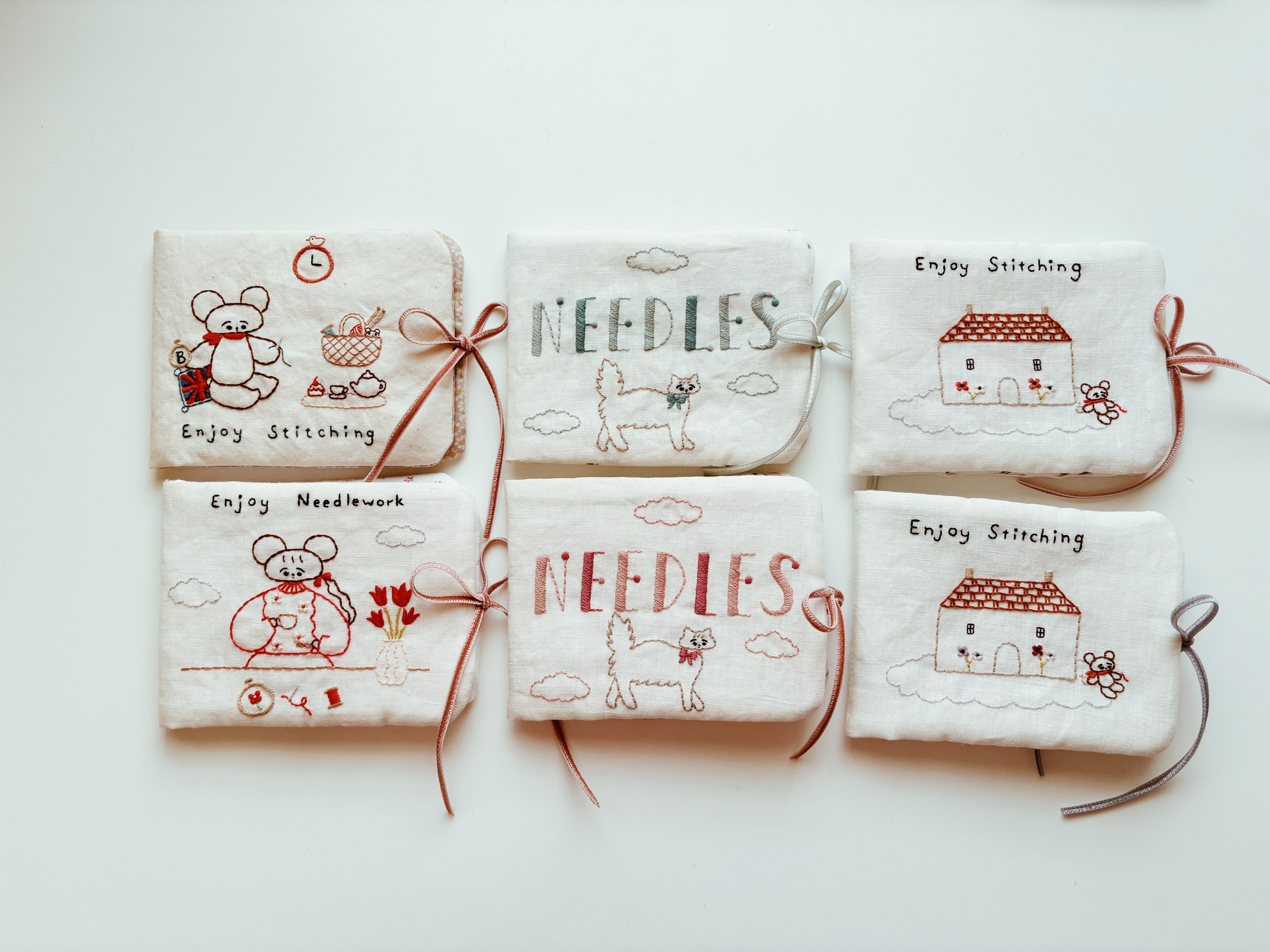 刺繍のレッスンなど、お出かけ先で針を使う時や、おうちで手元に一軍の針を揃えたい時にあったらいいなと思ってかわいいニードルケースを作りました。雲に浮かぶお家のそばで、刺繍をするくまさんの柄は、今回の新作の柄です。