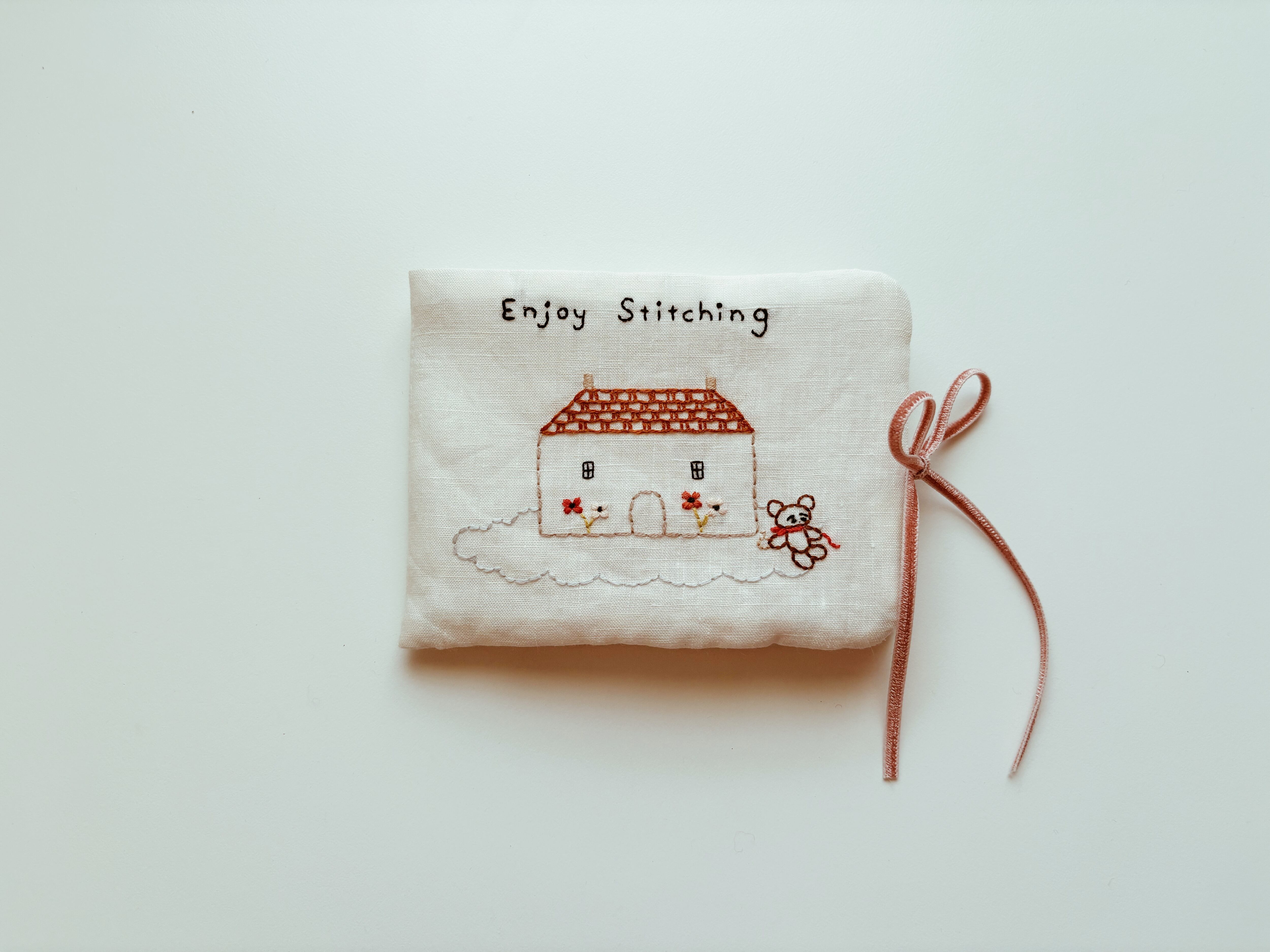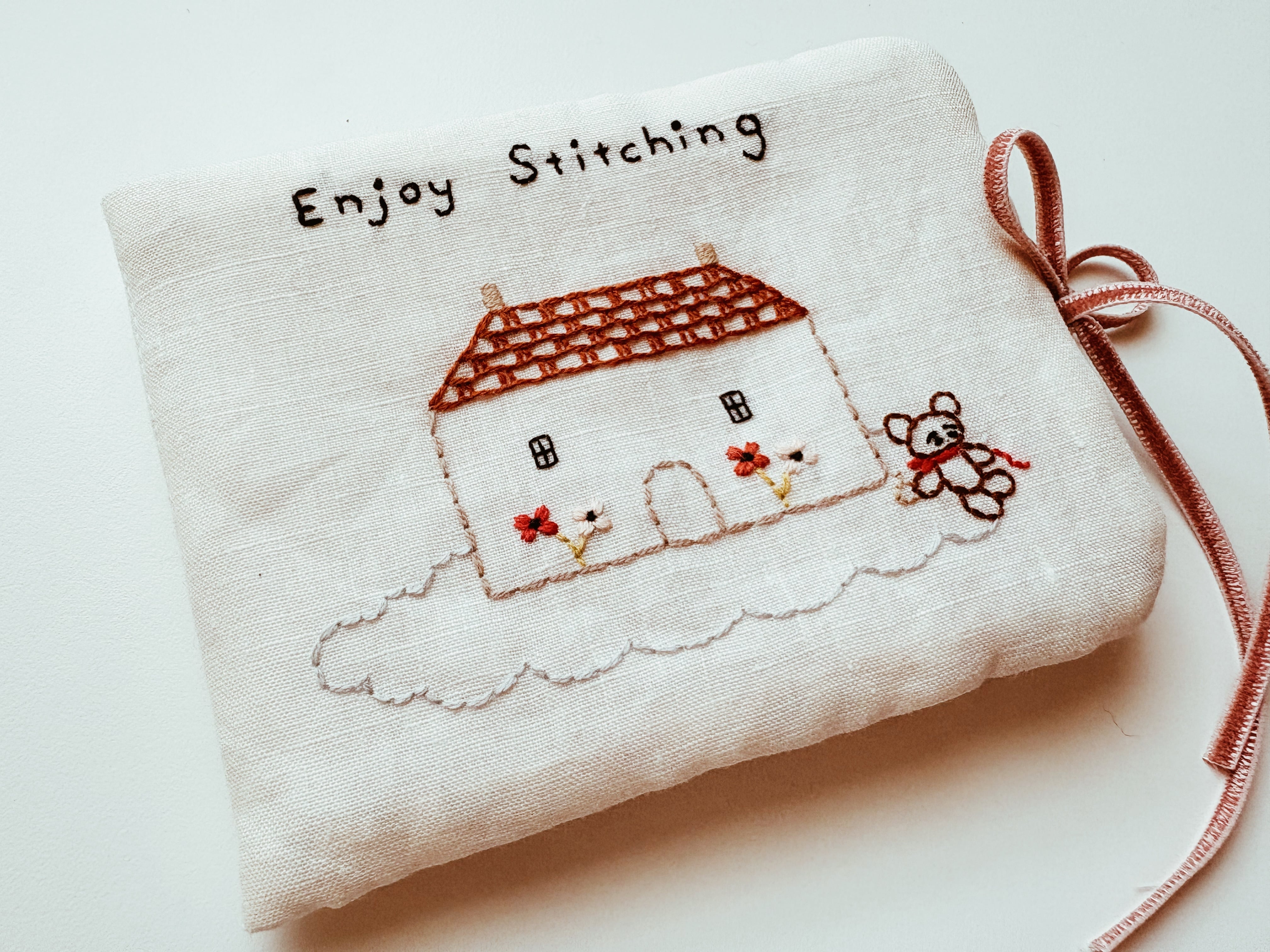 刺繍のレッスンなど、お出かけ先で針を使う時や、おうちで手元に一軍の針を揃えたい時にあったらいいなと思ってかわいいニードルケースを作りました。雲に浮かぶお家のそばで、刺繍をするくまさんの柄は、今回の新作の柄です。