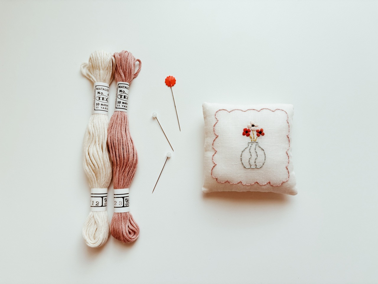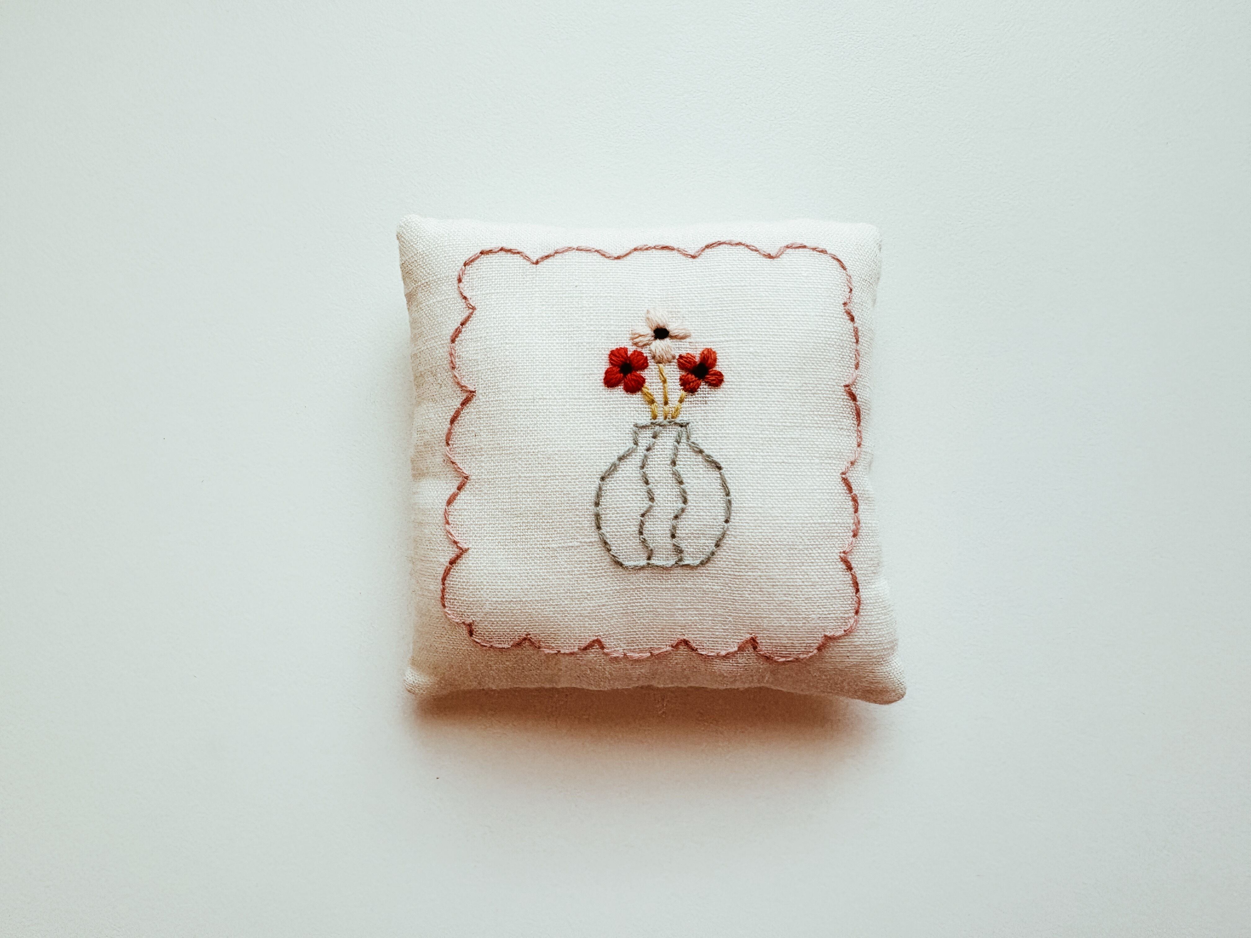 手刺繍の入った小さなピンクッション。刺繍やお裁縫をする時にお役に立てるといいなと思って作りました。持っているだけで針仕事が楽しくなるような、お道具です。この春から刺繍を始めてみようかな、という方にもおすすめです!