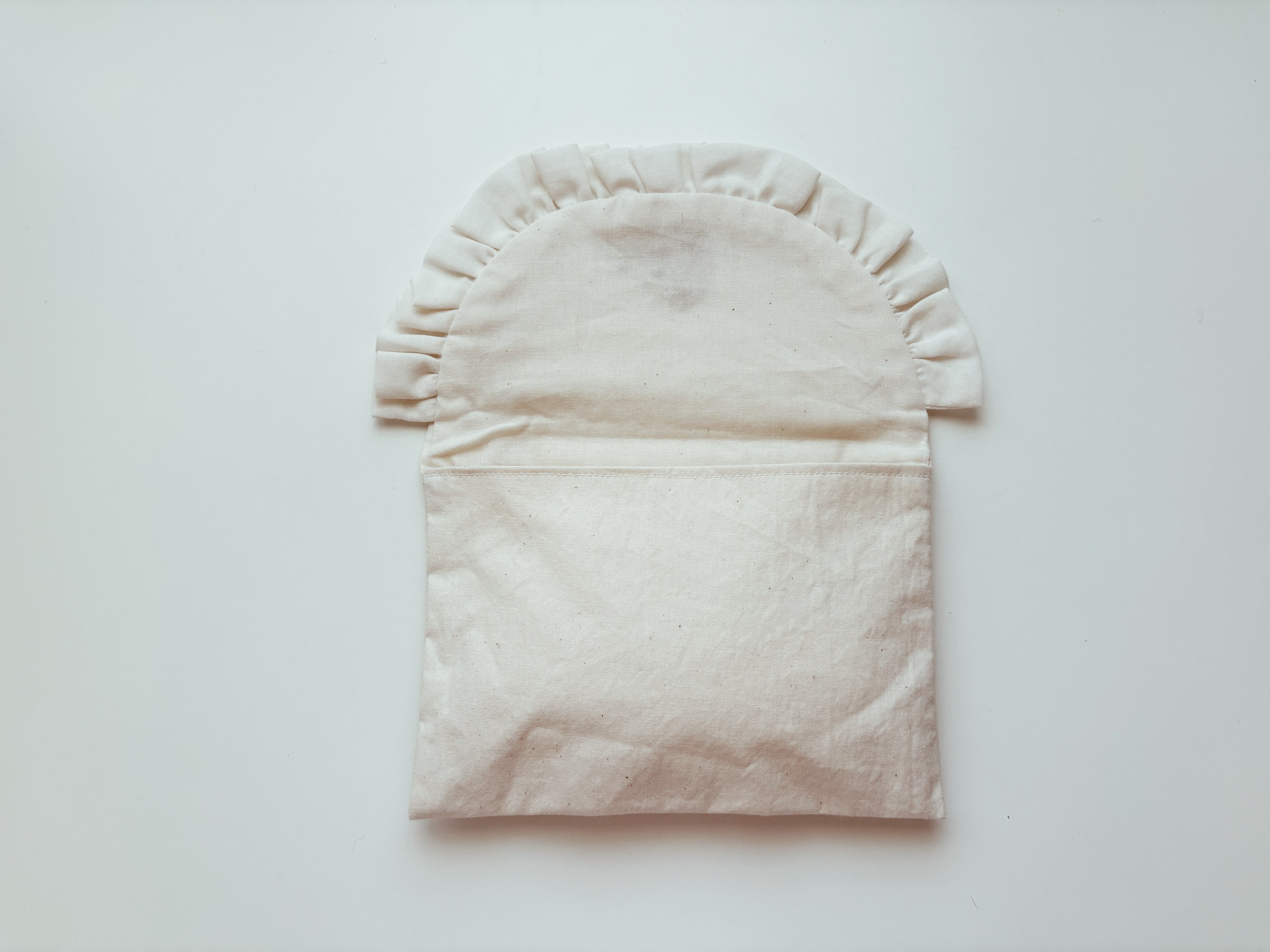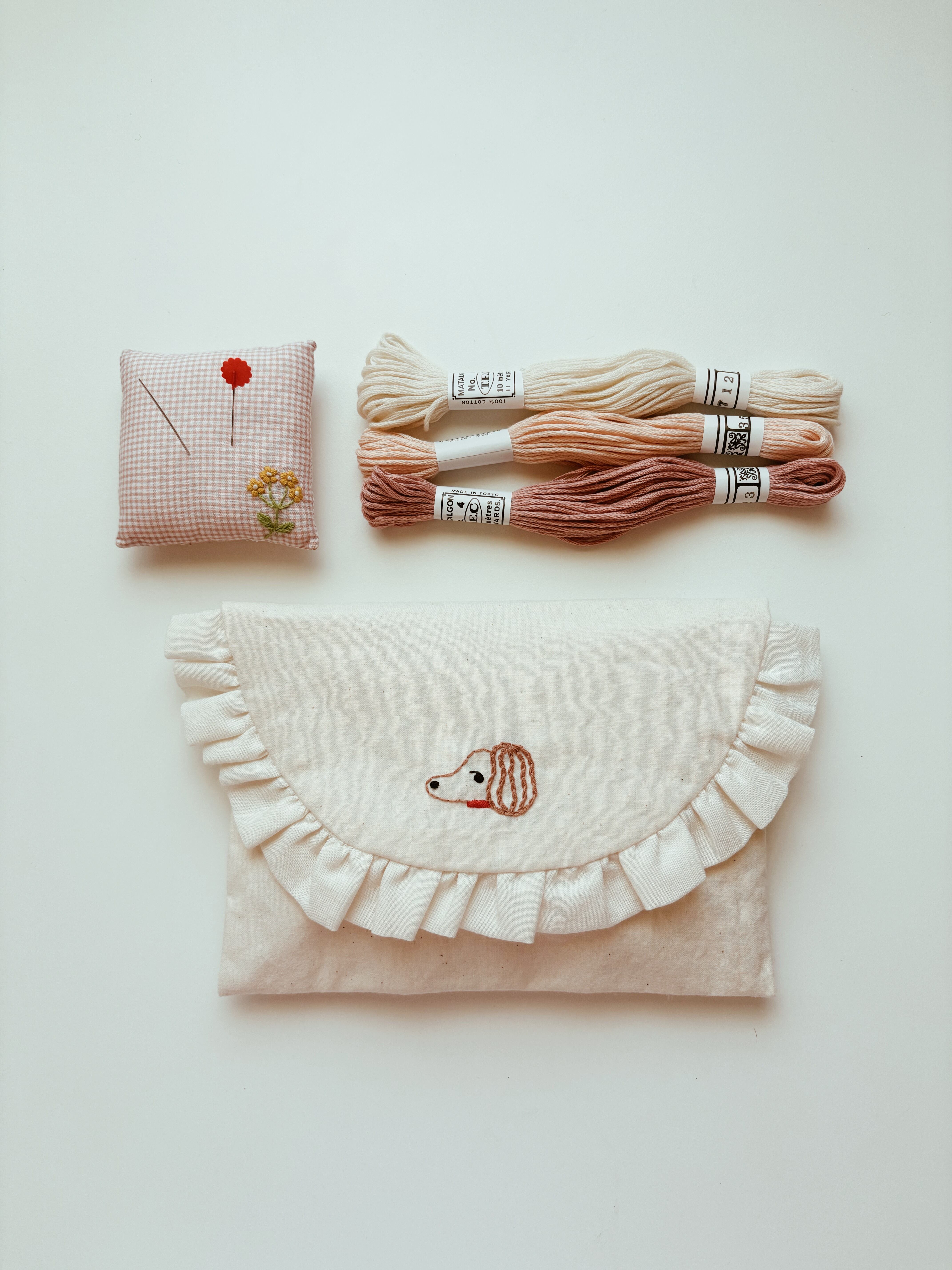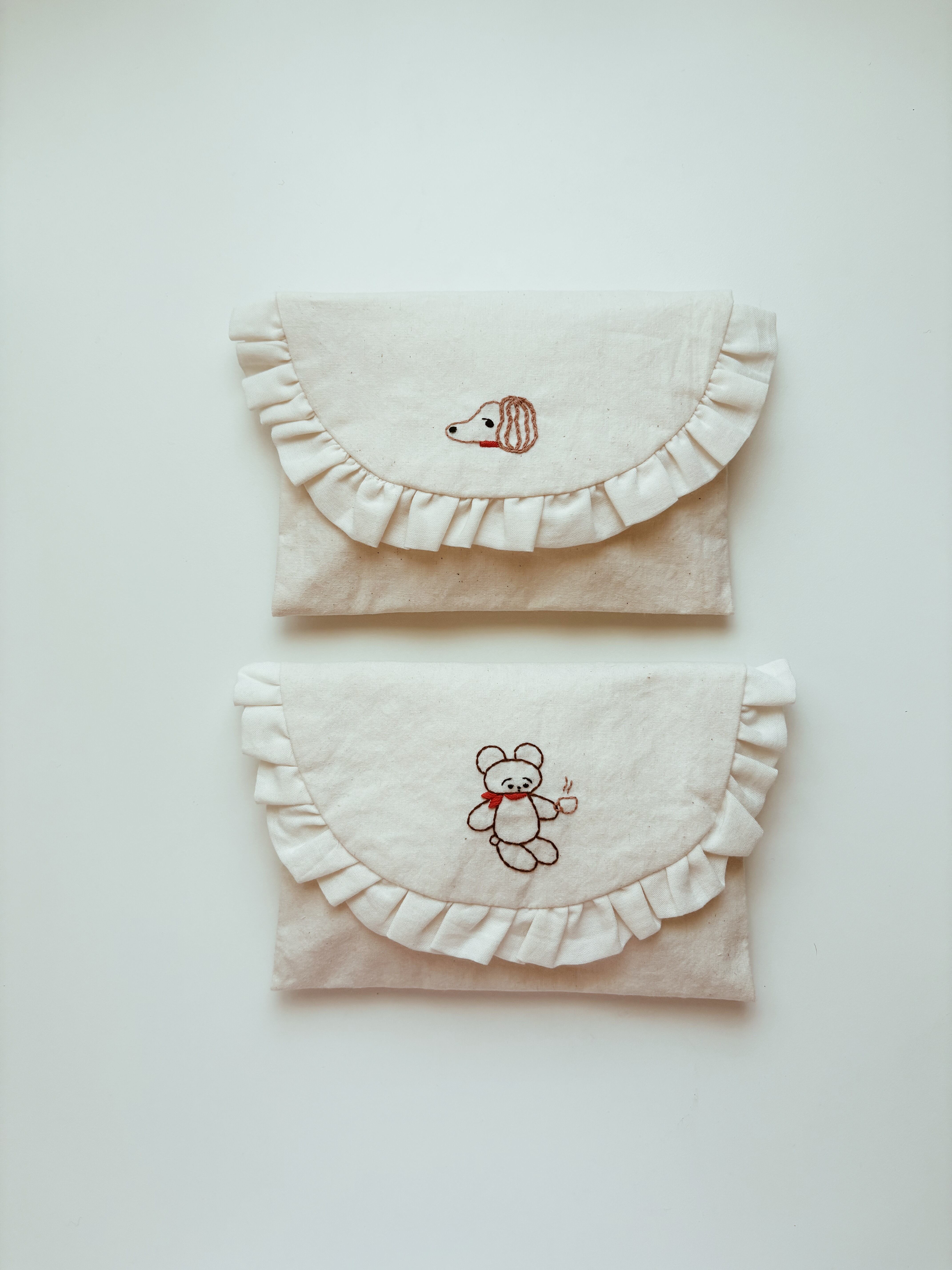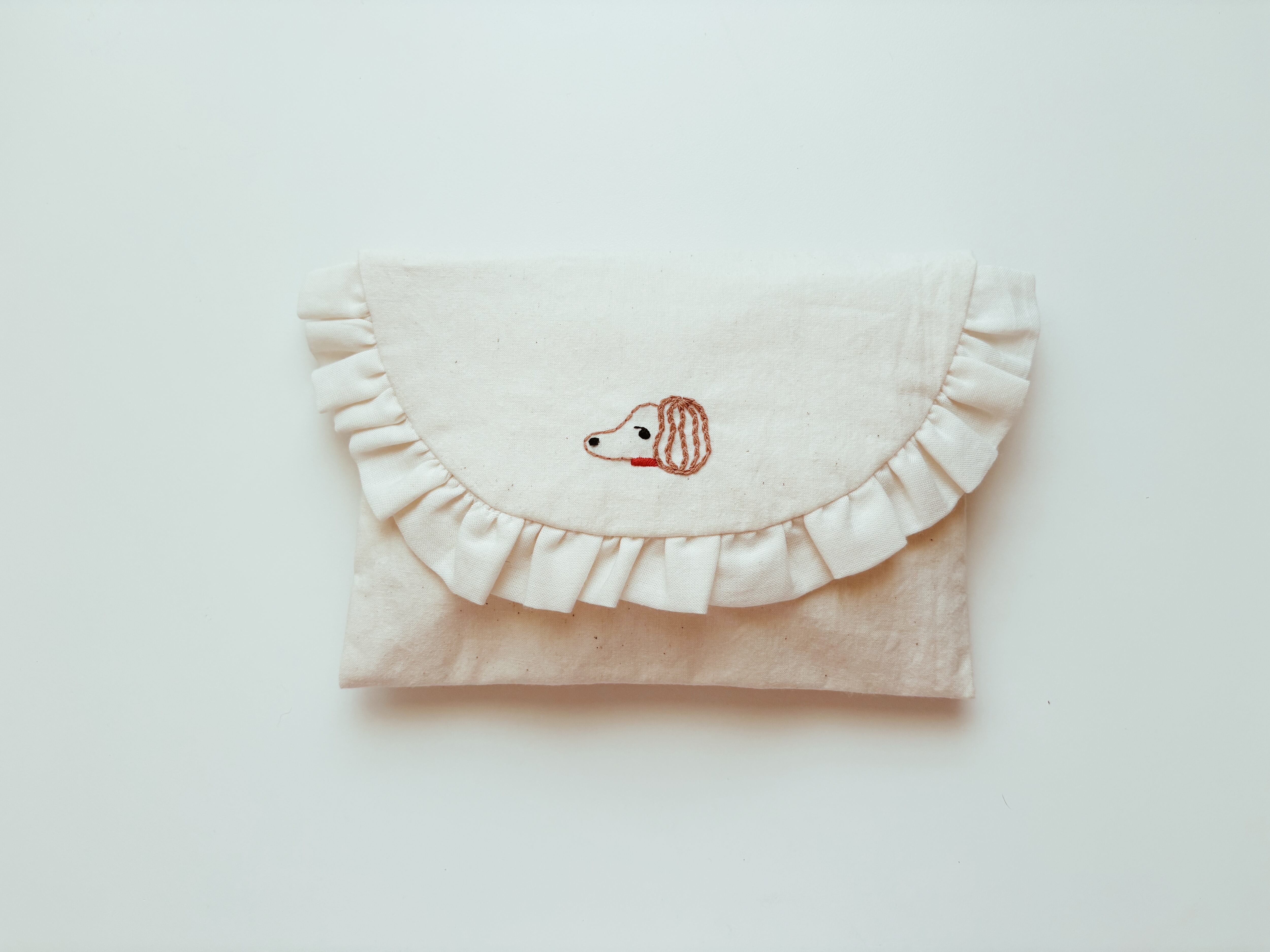 可愛い犬の刺繍が施されたフリル付きの小さなバッグです。おうちに飾ったり、バッグの中の小さなものの収納や、刺繍道具を入れたりするのにも良さそうです。