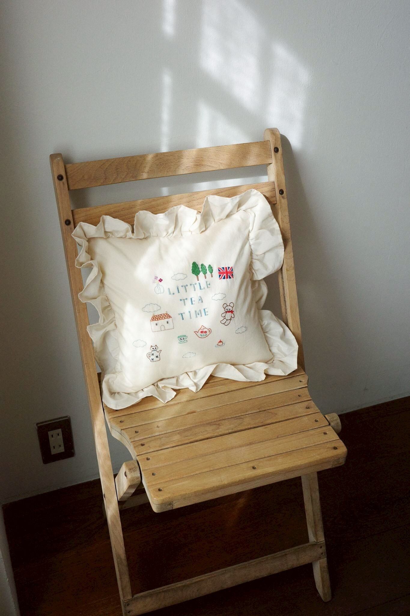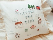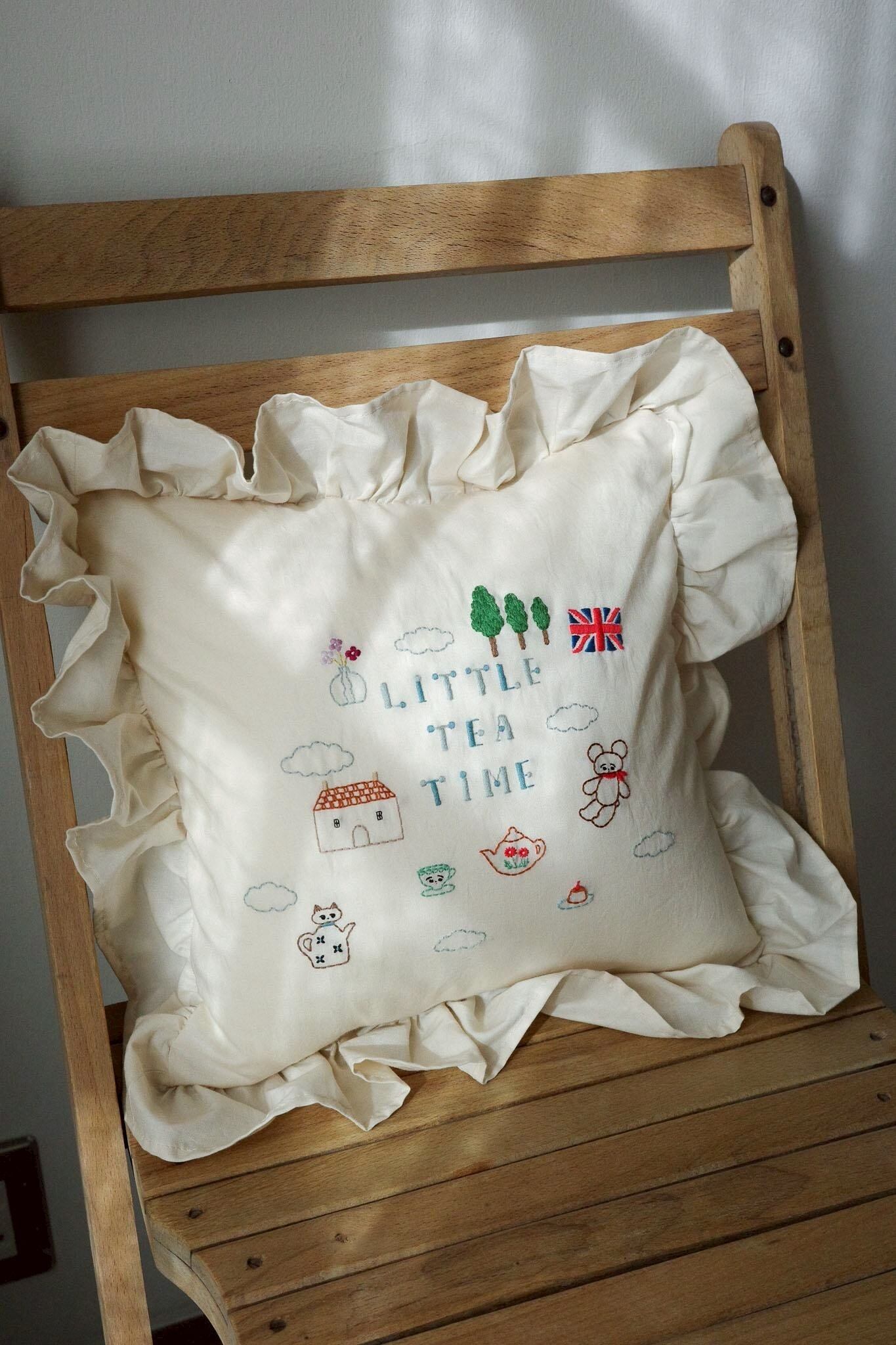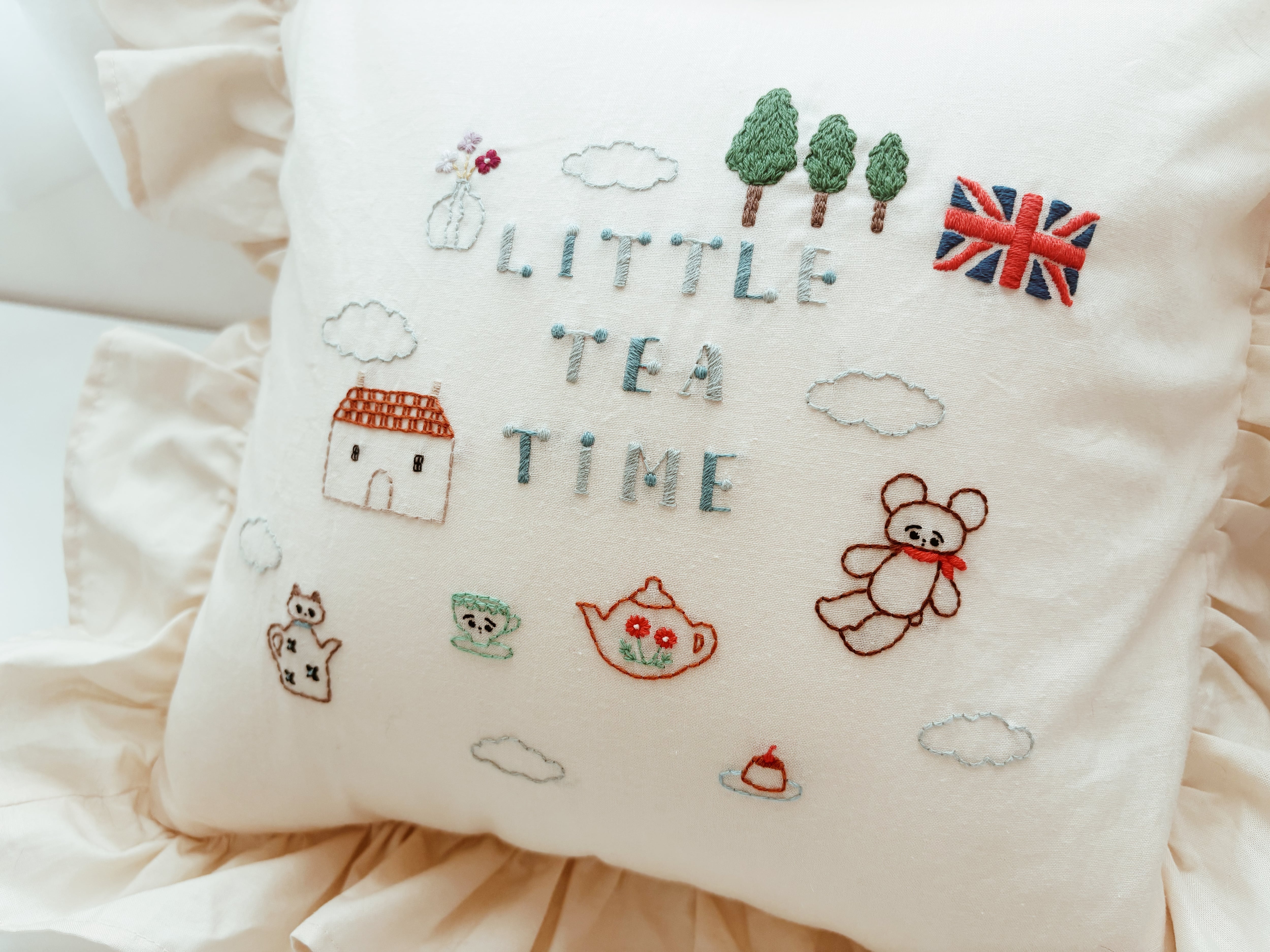 Little tea timeをテーマに、テディベアやお家、ティーポットなど、イギリスを連想させるモチーフを刺繍にしています。