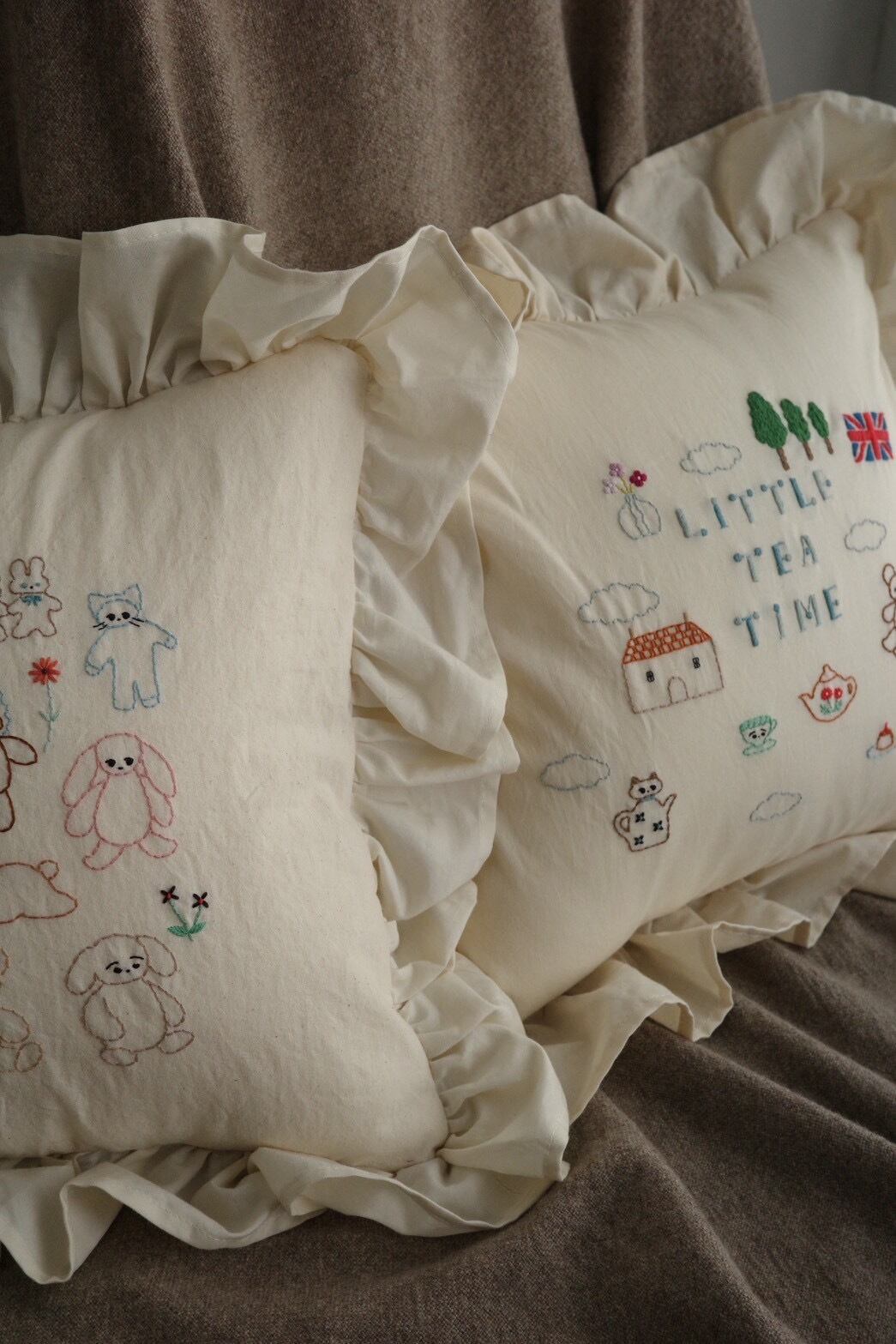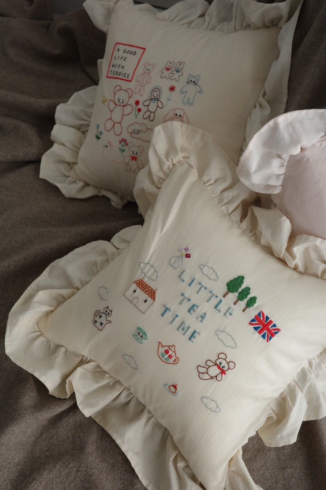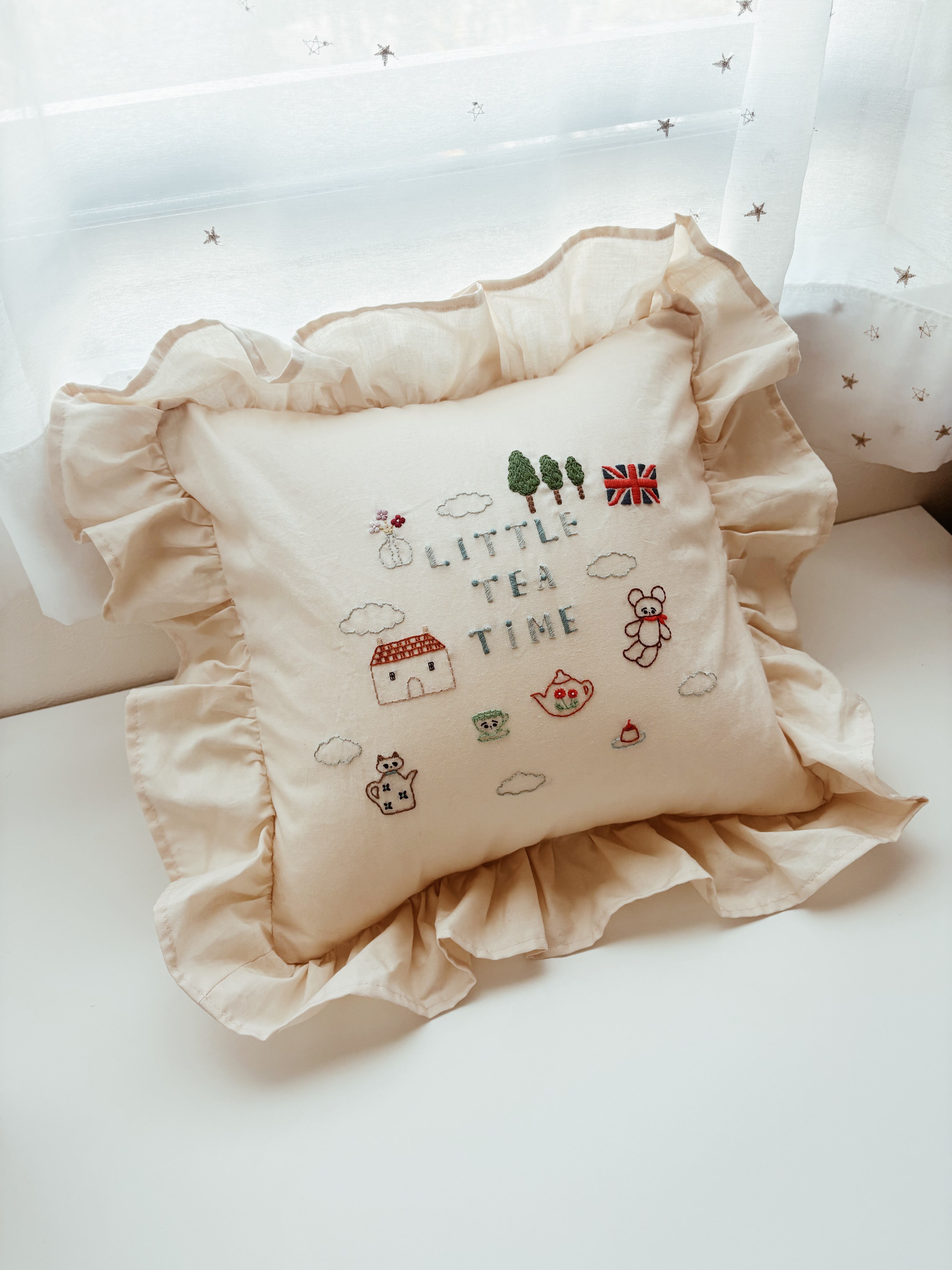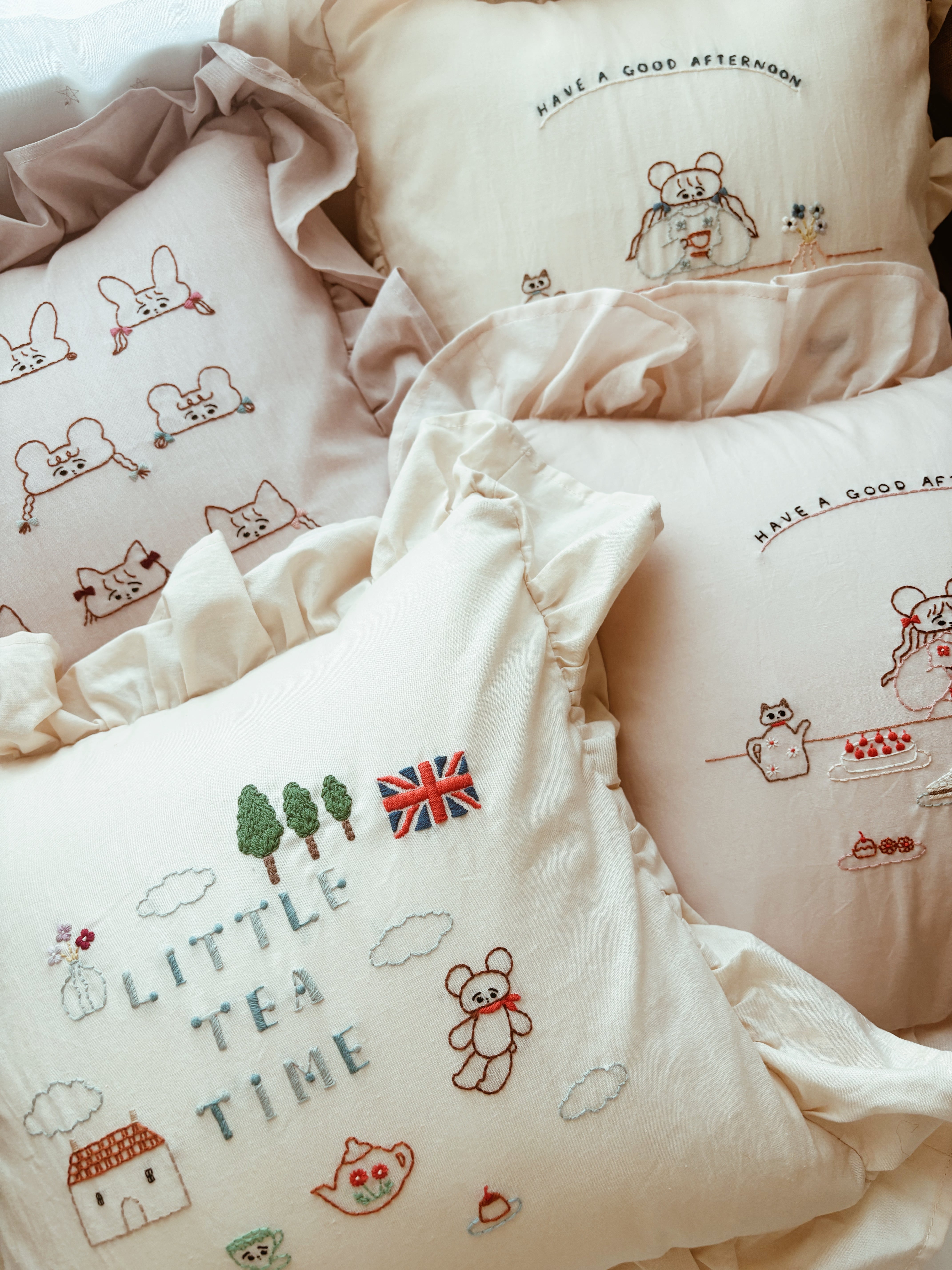 Little tea timeをテーマに、テディベアやお家、ティーポットなど、イギリスを連想させるモチーフを刺繍にしています。