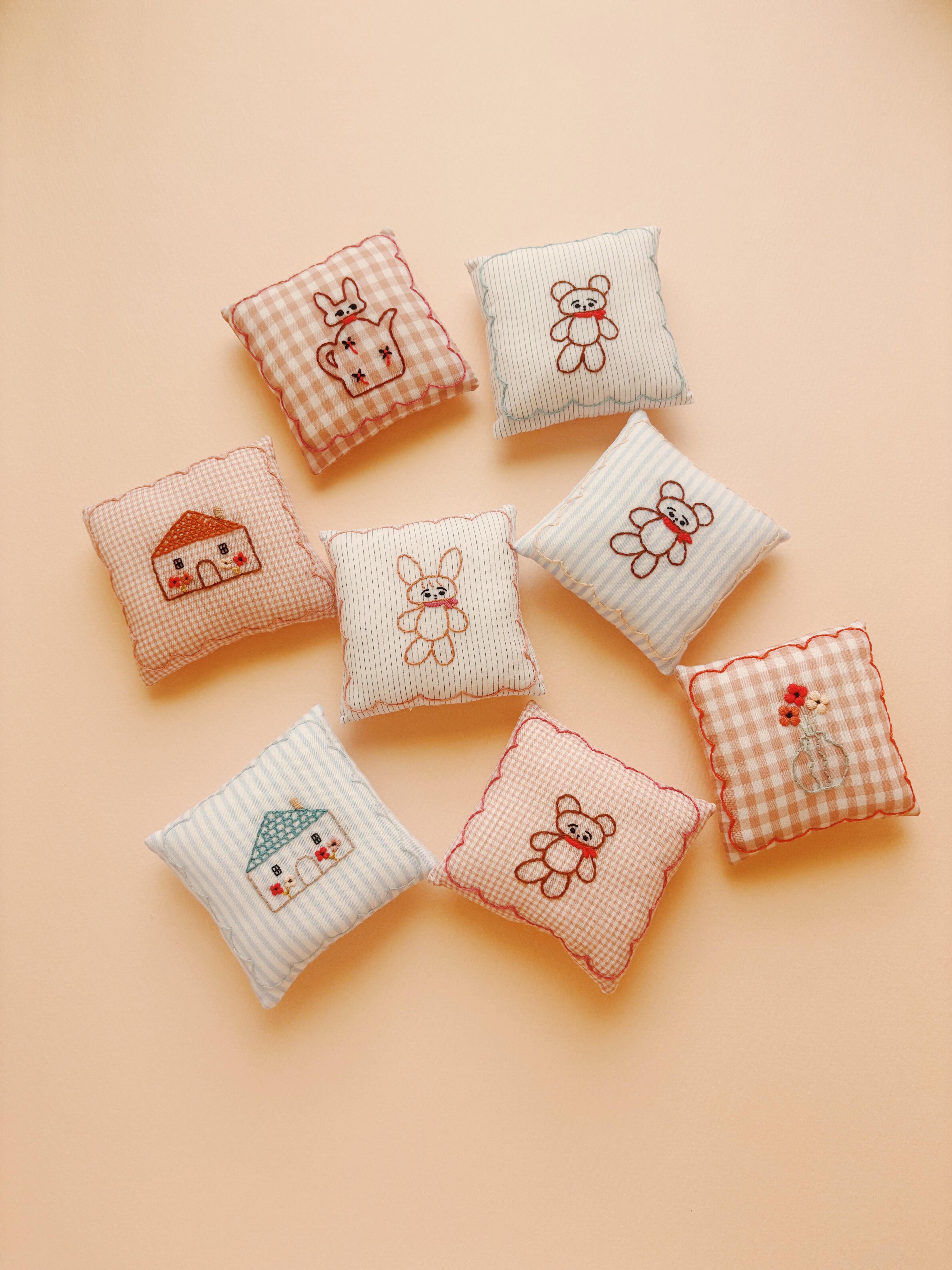手刺繍の入った小さなピンクッション。刺繍やお裁縫をする時にお役に立てるといいなと思って作りました。持っているだけで針仕事が楽しくなるような、お道具です。これから刺繍を始めてみようかな、という方にもおすすめです!