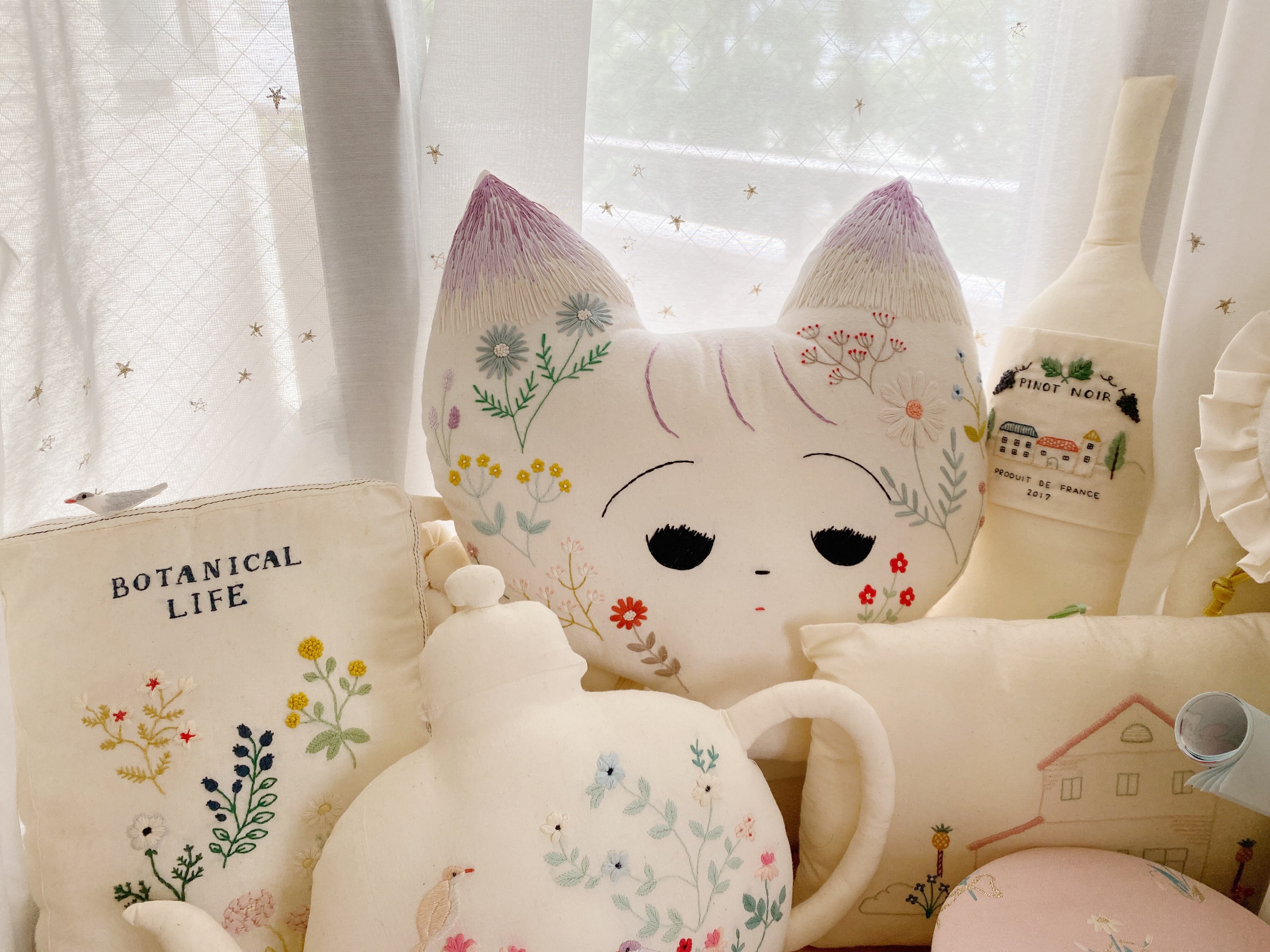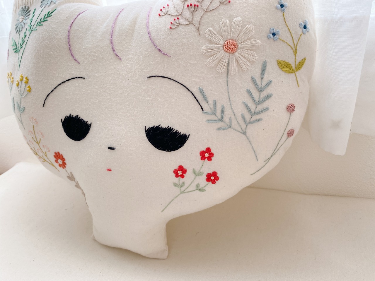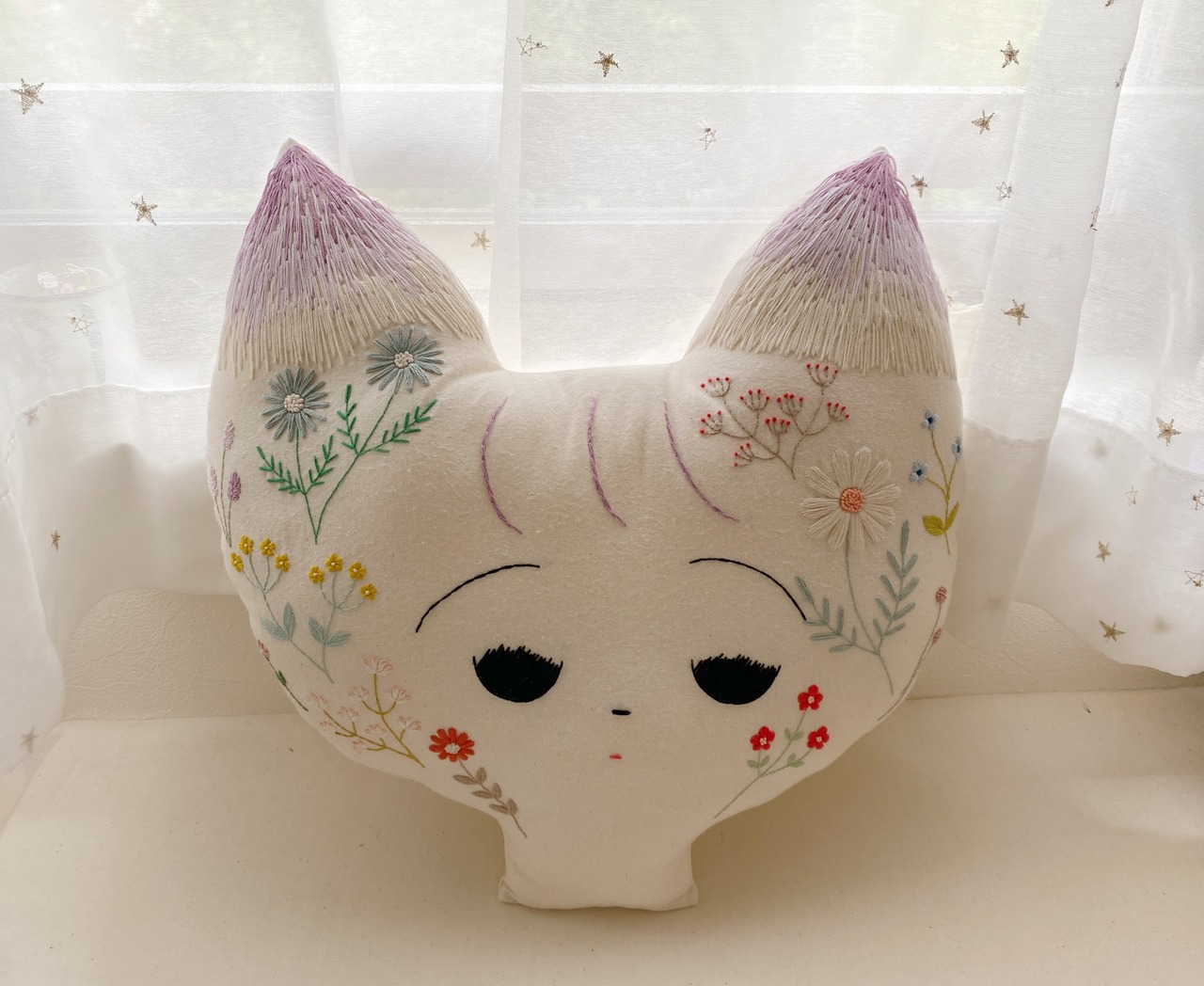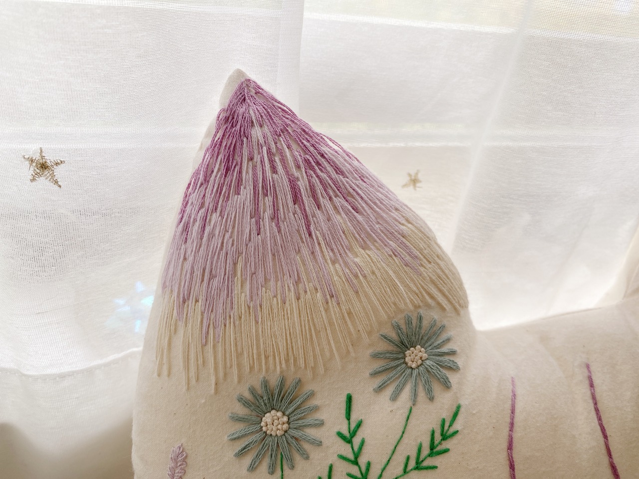 いつもよりもっと時間をかけて、じっくり大きなものが作りたくて、ずっとやってみたかった、刺繍糸でグラデーションになるように3色の糸を使って縫って、すみれ色の耳のねこを作りました