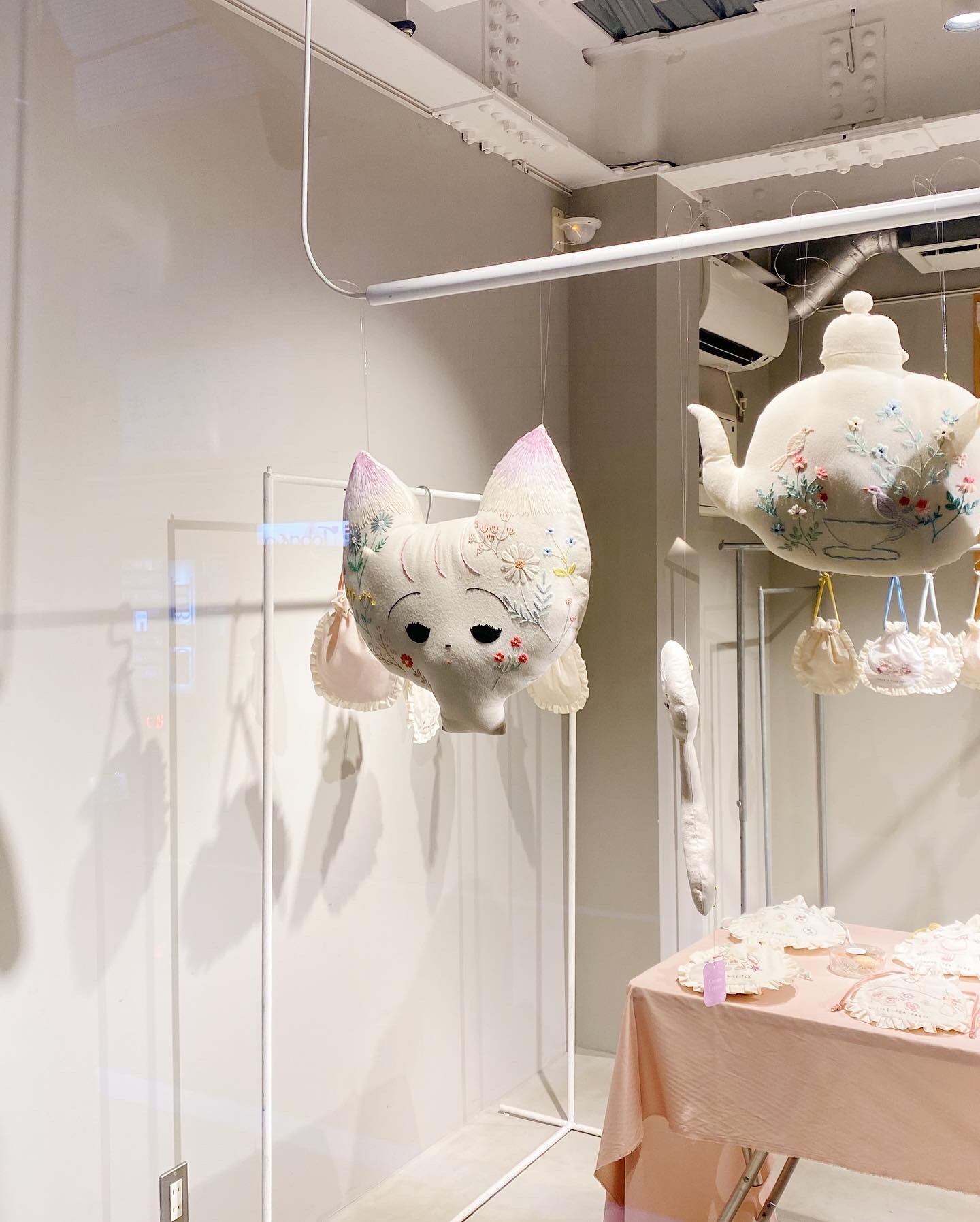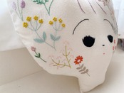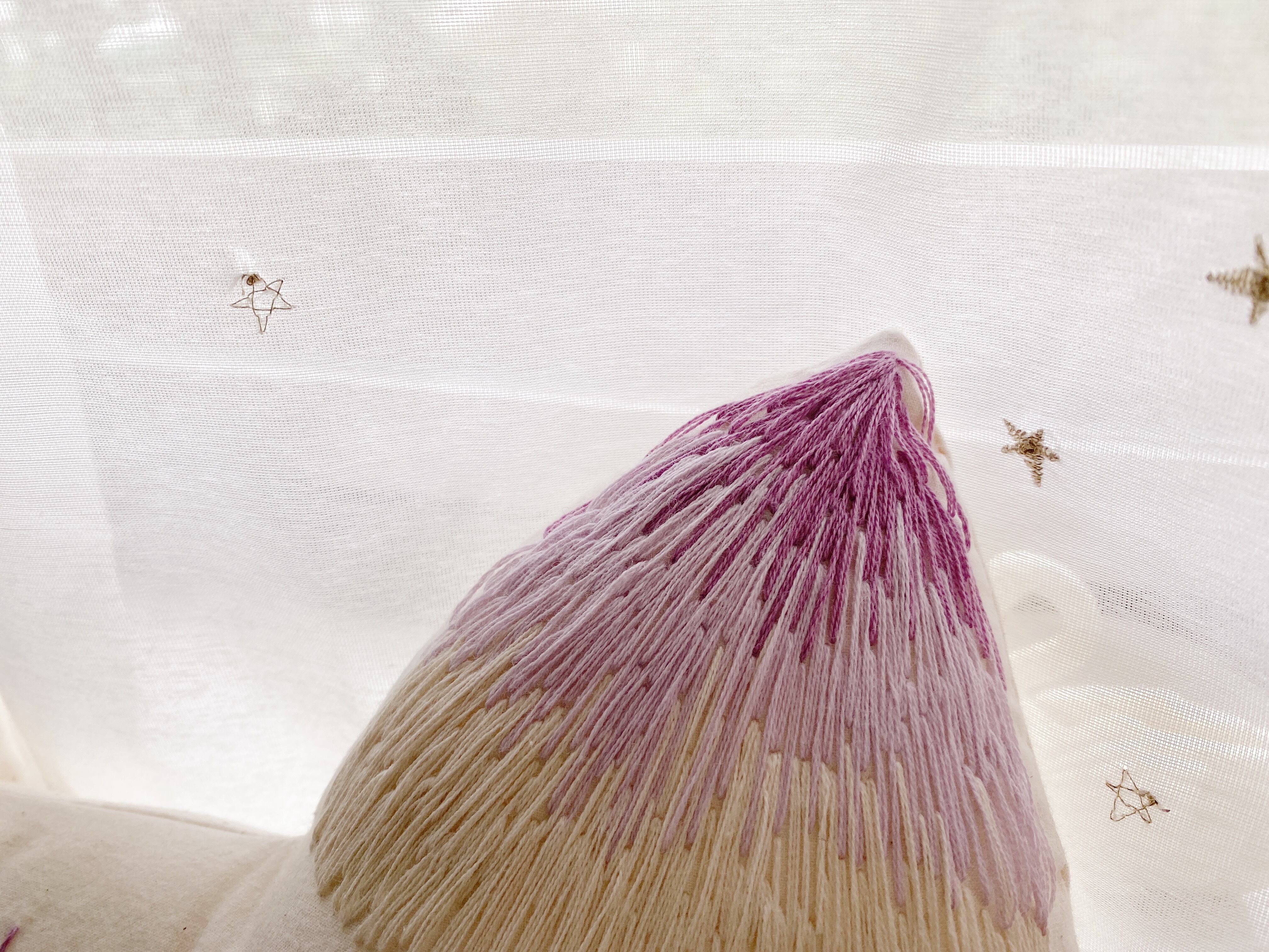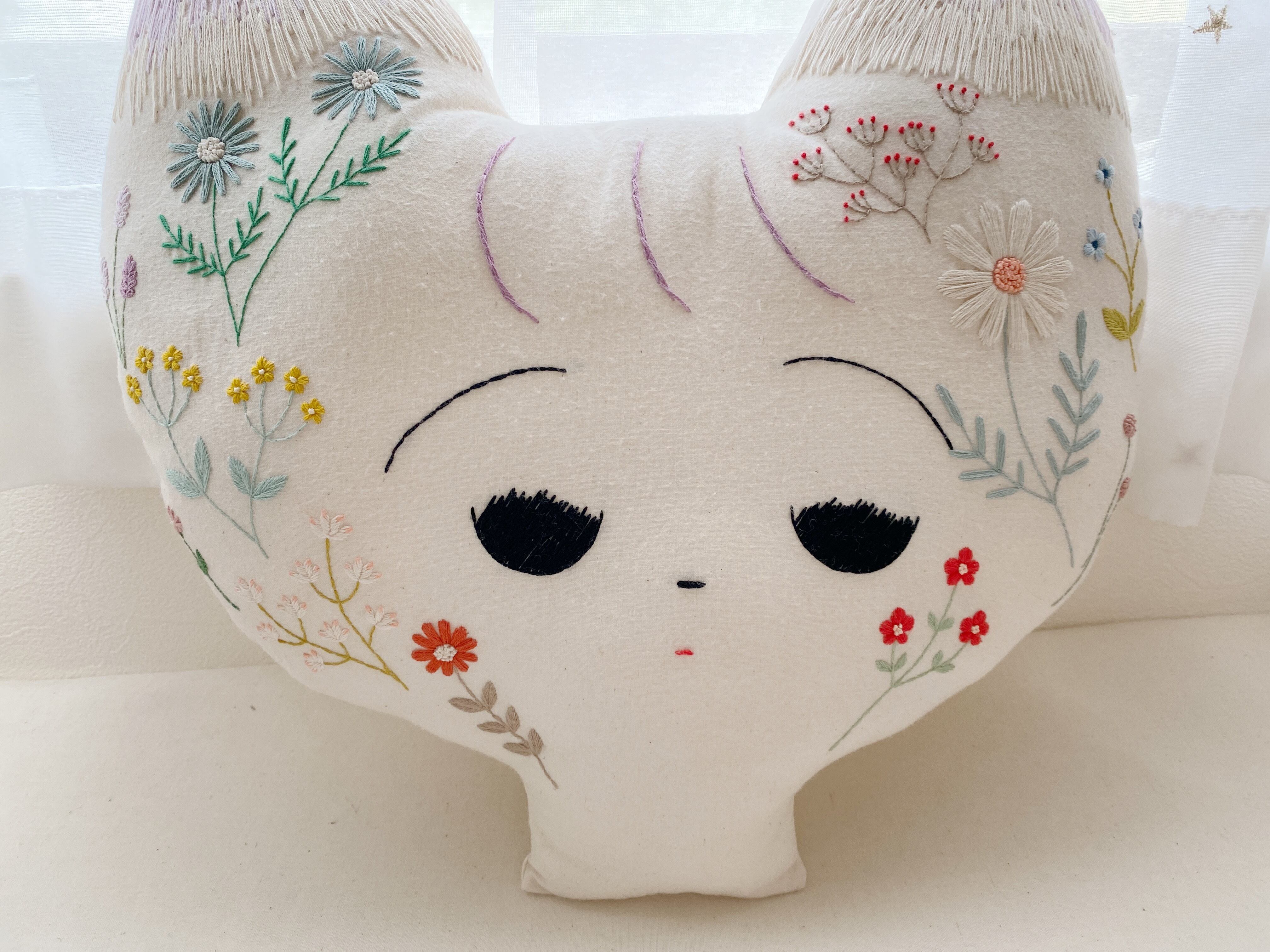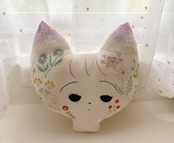 いつもよりもっと時間をかけて、じっくり大きなものが作りたくて、ずっとやってみたかった、刺繍糸でグラデーションになるように3色の糸を使って縫って、すみれ色の耳のねこを作りました