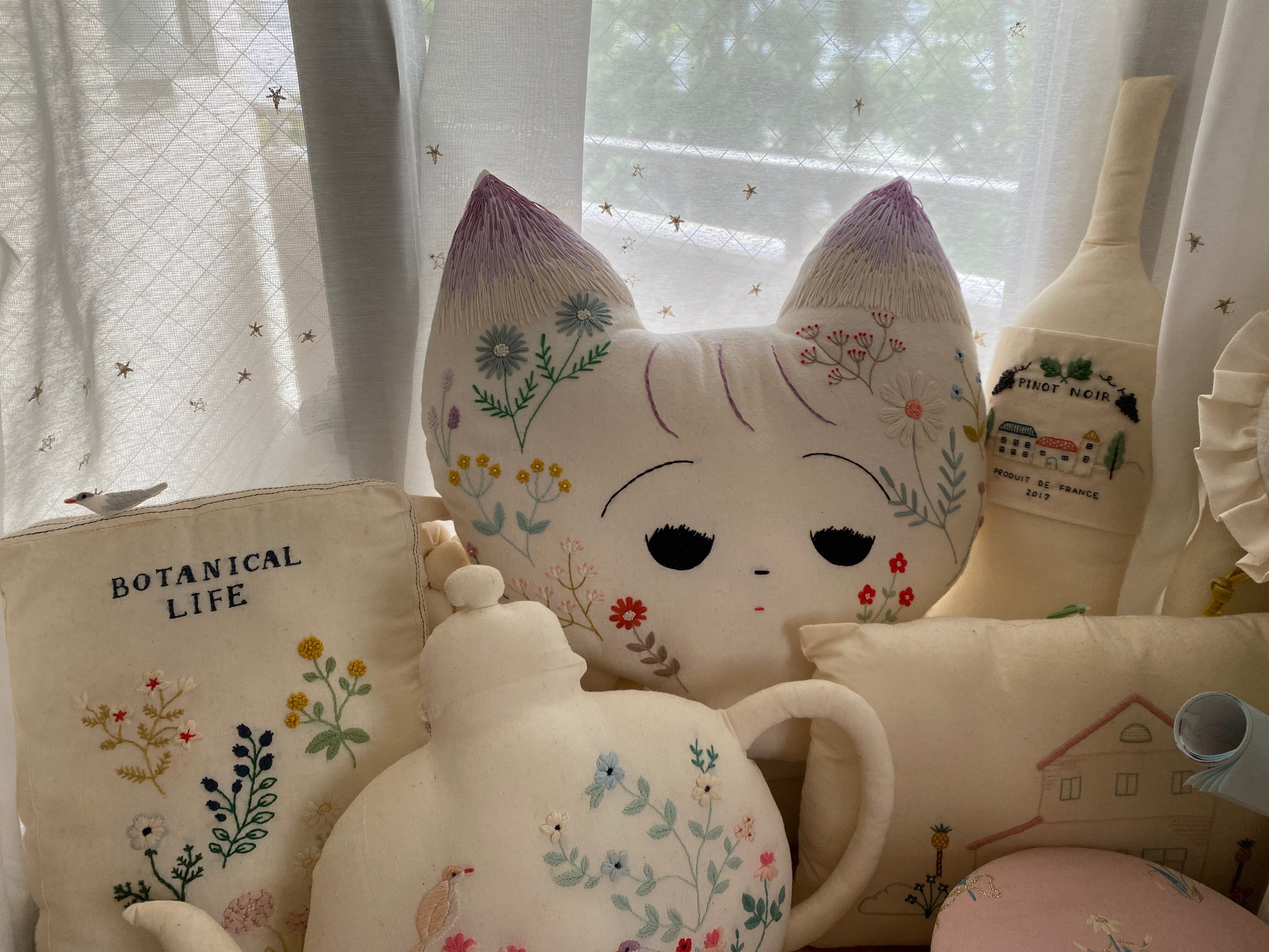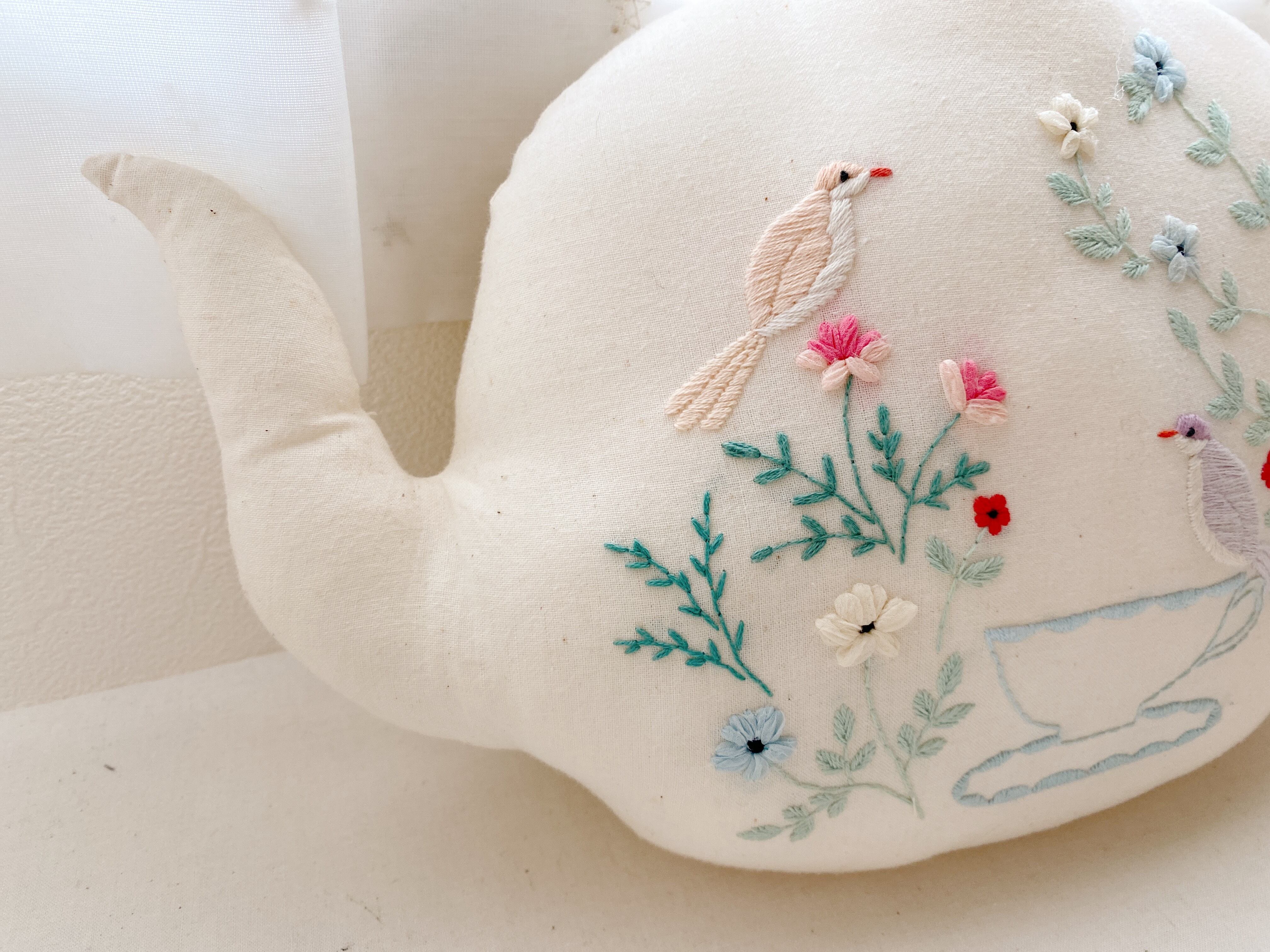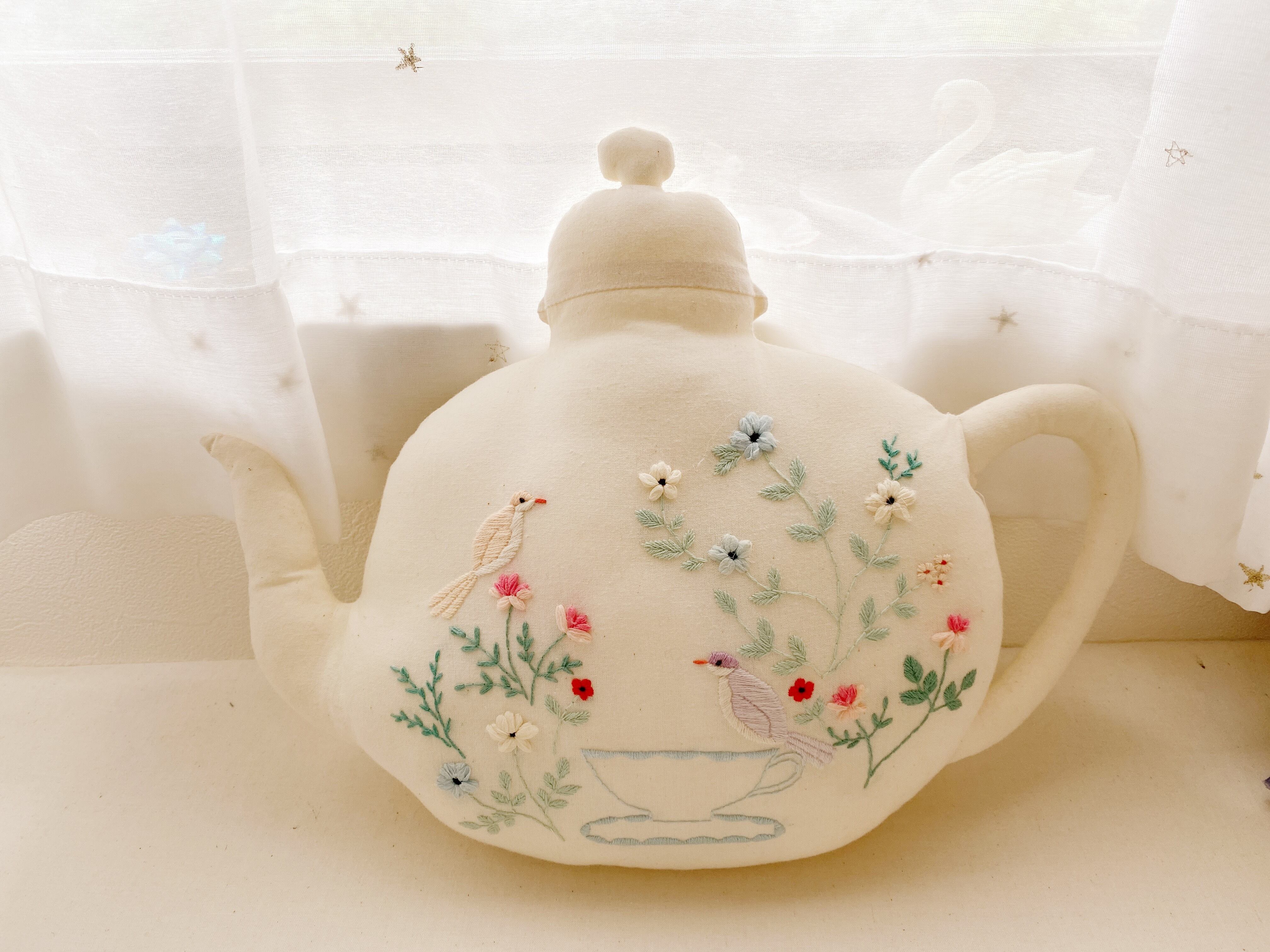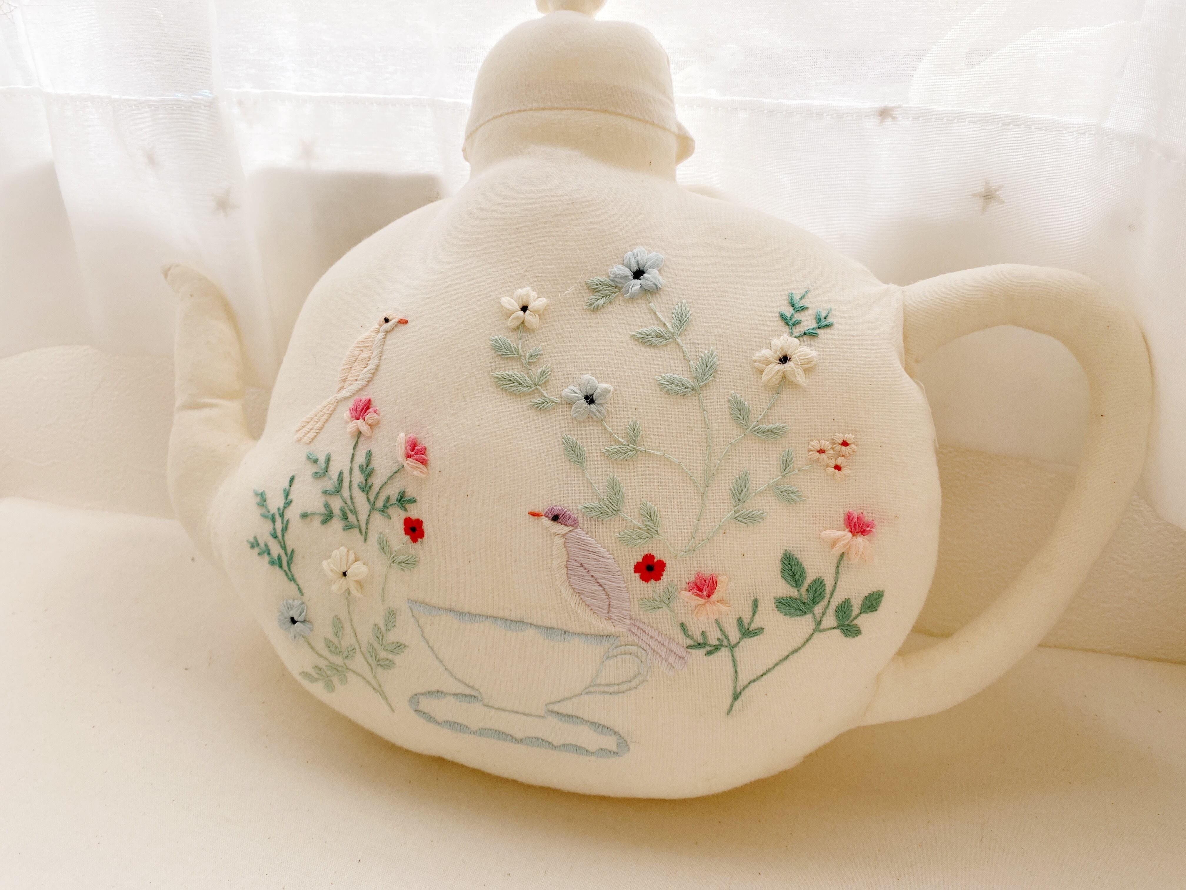 コロンとしたティーポットの中に、鳥が2羽。シノワズリのような雰囲気にしたくて、きれいな色で鳥とお花を刺繍しました。お花はシルクシフォンの布を裂いたものを、リボン刺繍のように針に通して刺していて、立体感があります。
