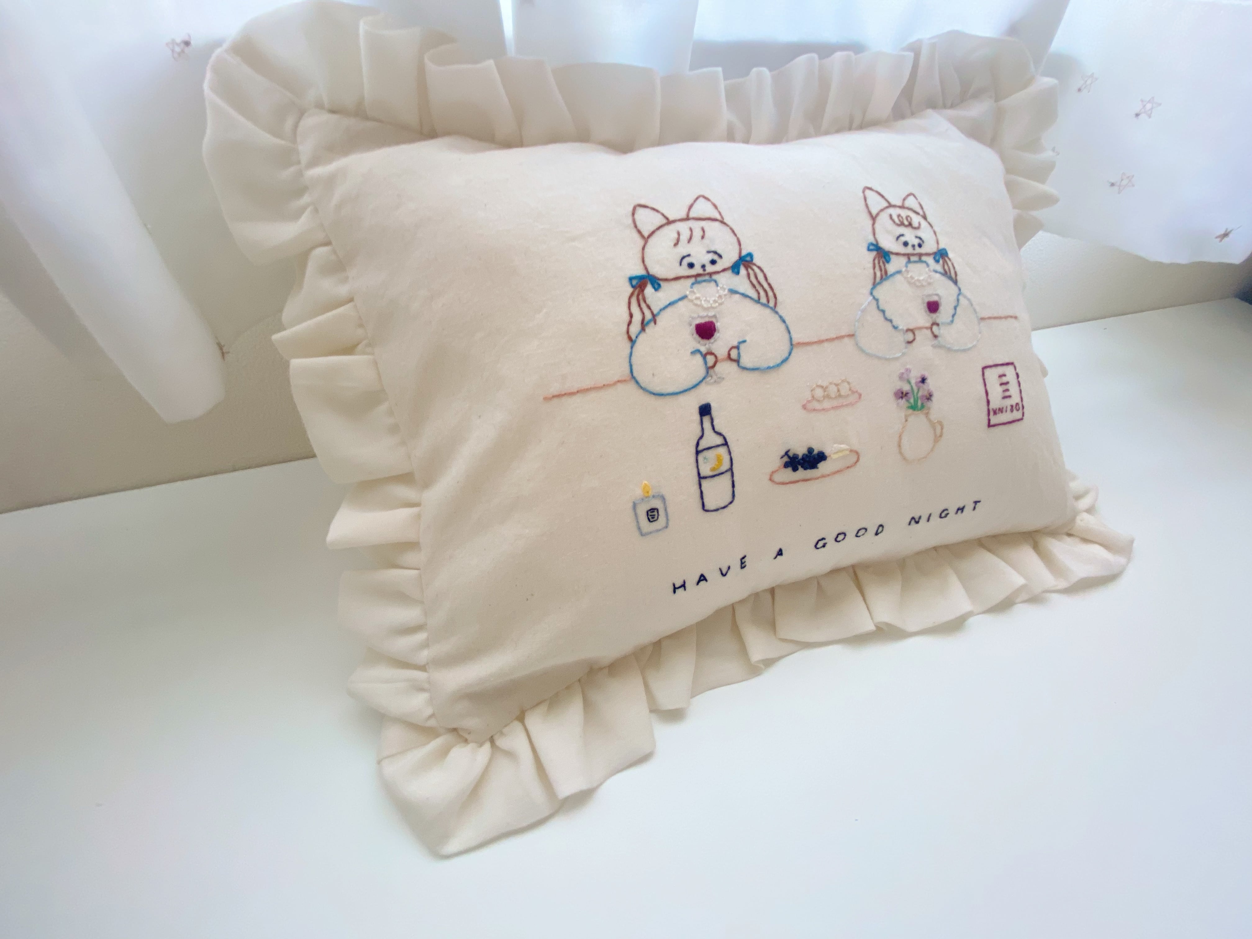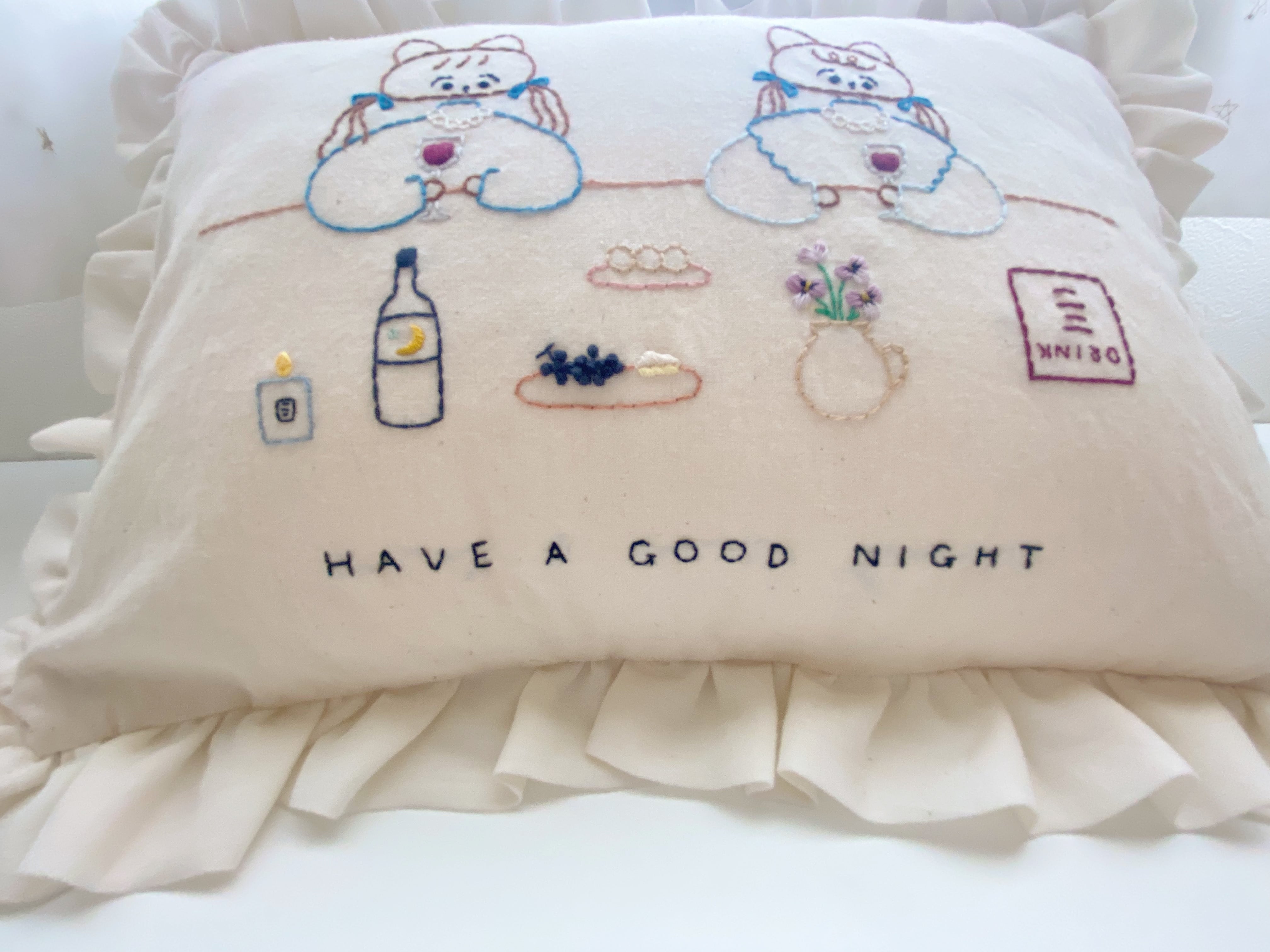 HAVE A GOOD NIGHTは、好きなワインを飲みながら、友達や家族とゆっくりする時間を思って刺繍しました。ああでもないこうでもないと言いながら友達とおしゃべりする時間は、小さな幸せです。いくら時間があっても、あっという間に過ぎてしまう、そんな儚い時間でもあります。