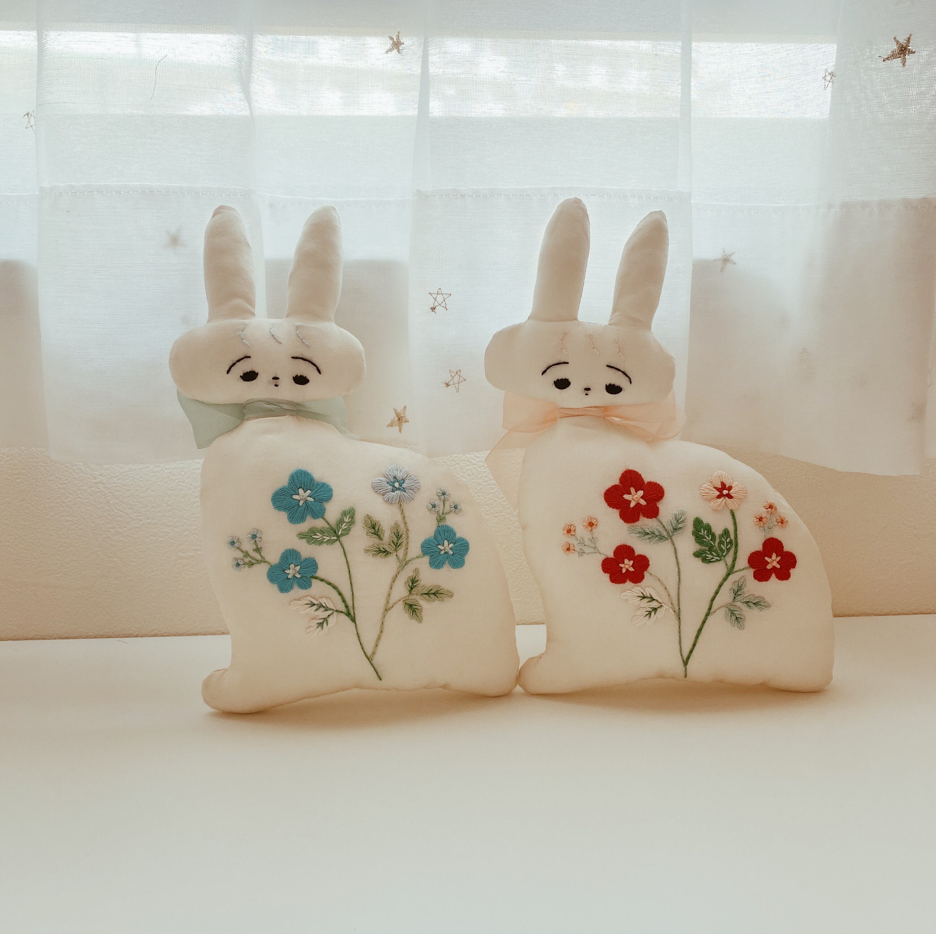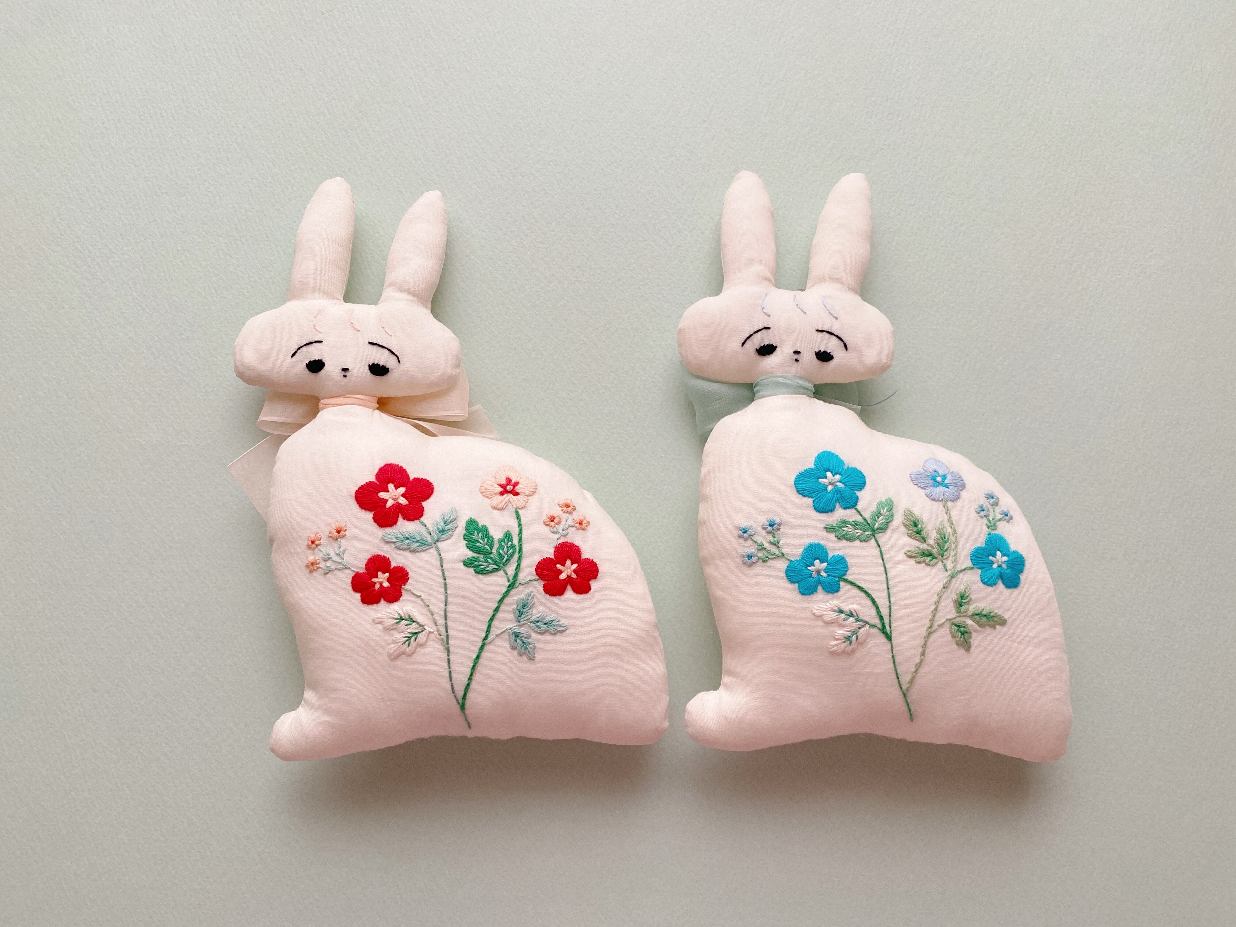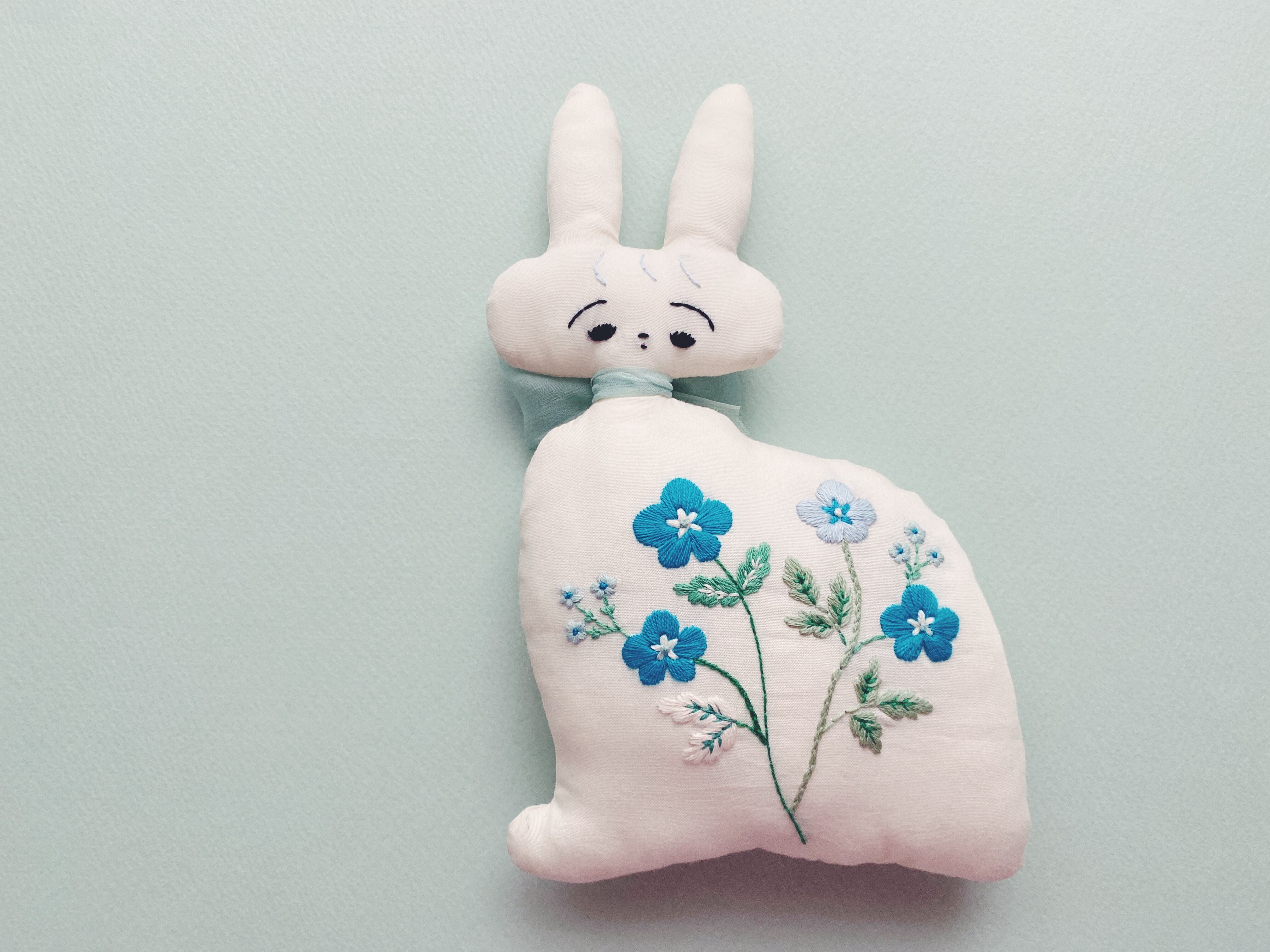 華やかなブルーで、イチゴのお花のイメージの刺繍をしてみました。前髪とリボンもやわらかいブルーで合わせて、おしゃれなうさぎさんになっています。
