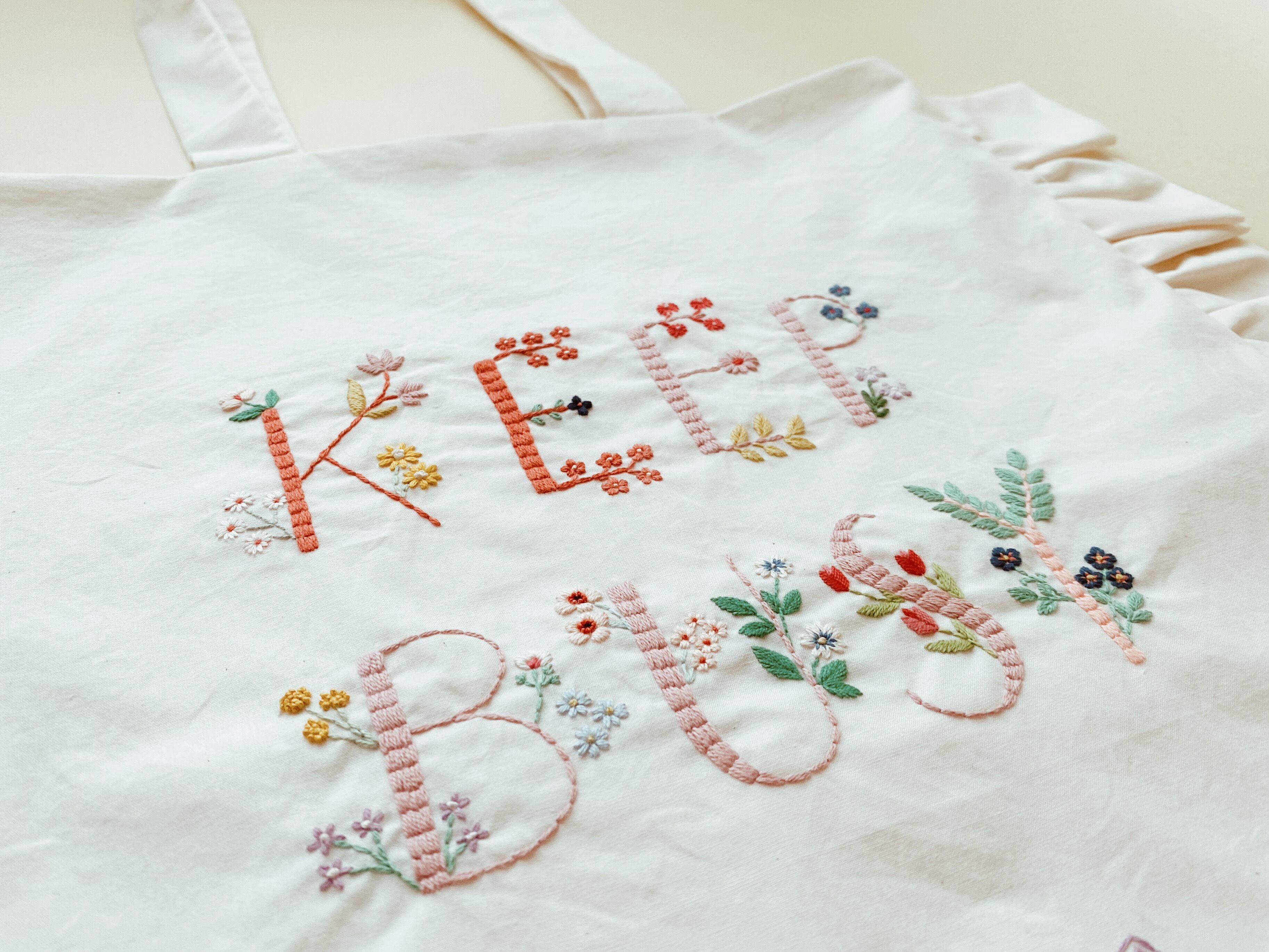 文字の刺繍に、沢山のお花を咲かせてみました。