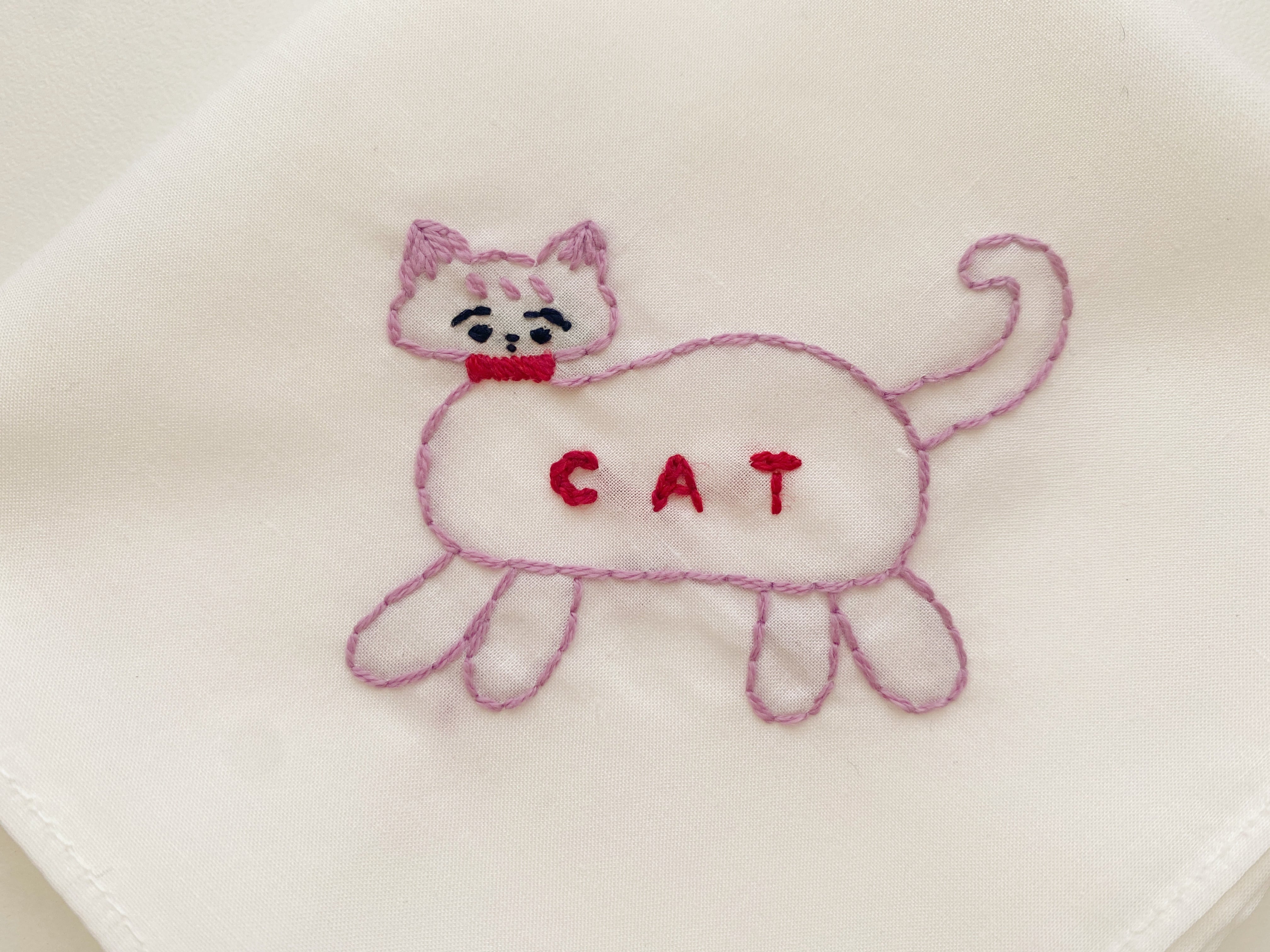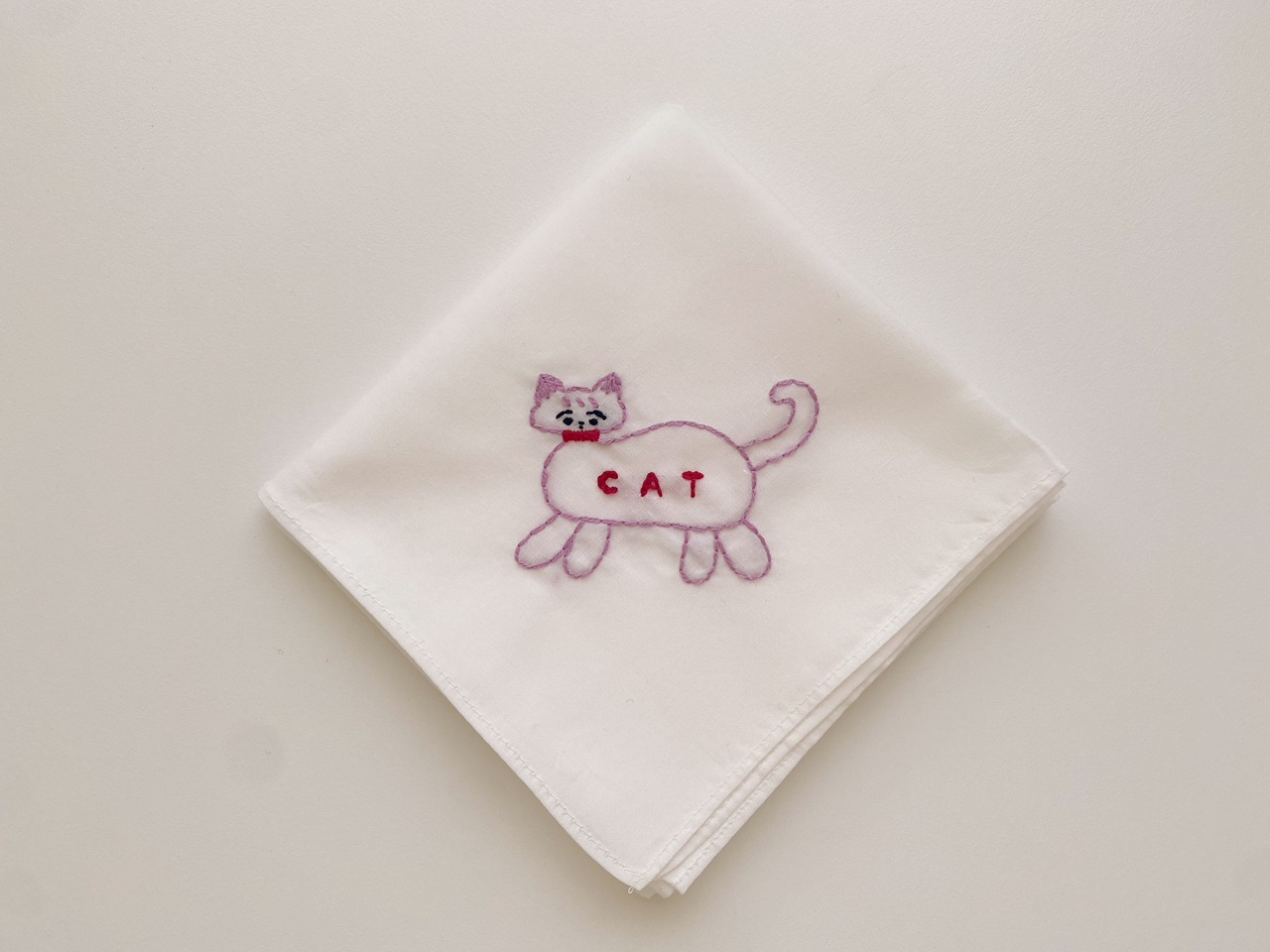 ねこ好きさんにおすすめの、CATのハンカチーフ。赤い首輪とチェーンステッチを使って刺繍したCATの文字がポイントです。