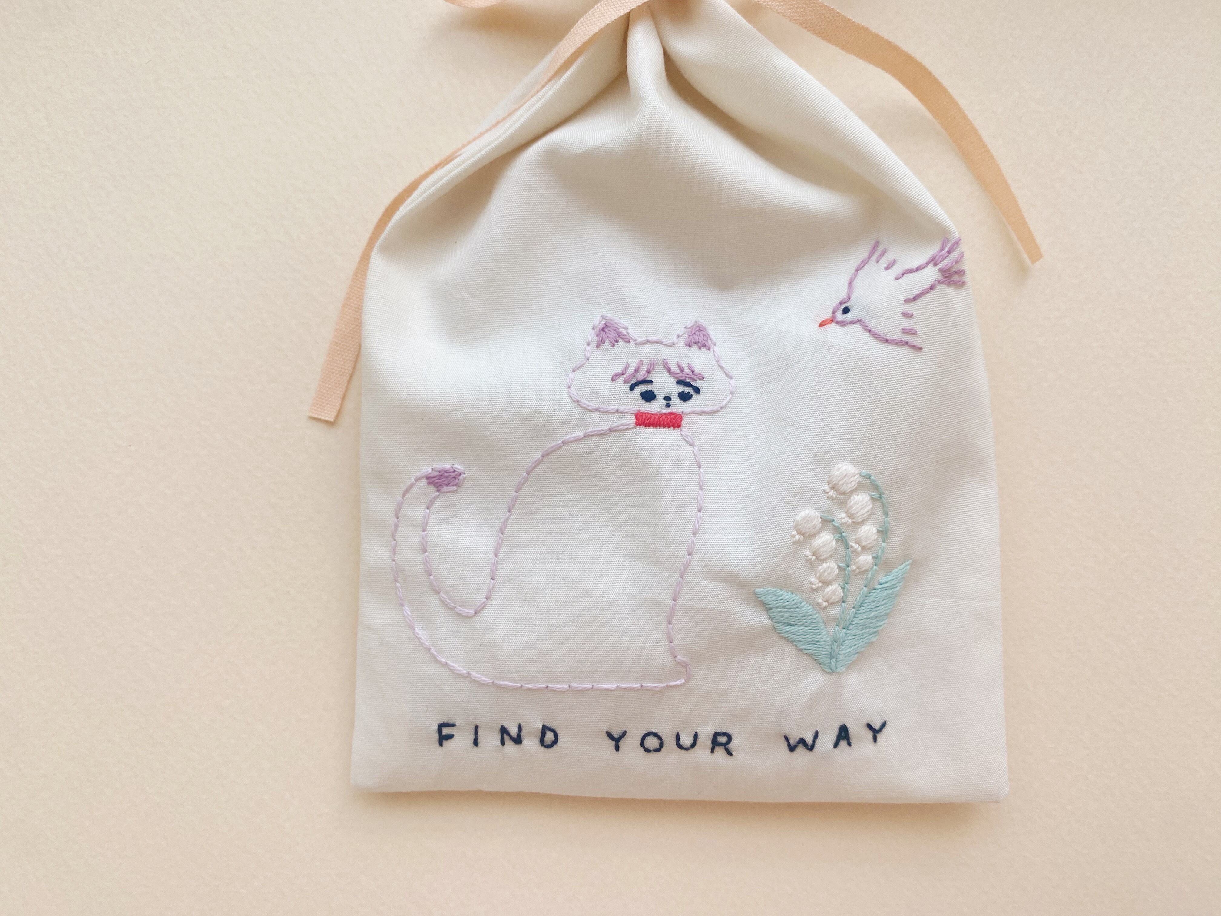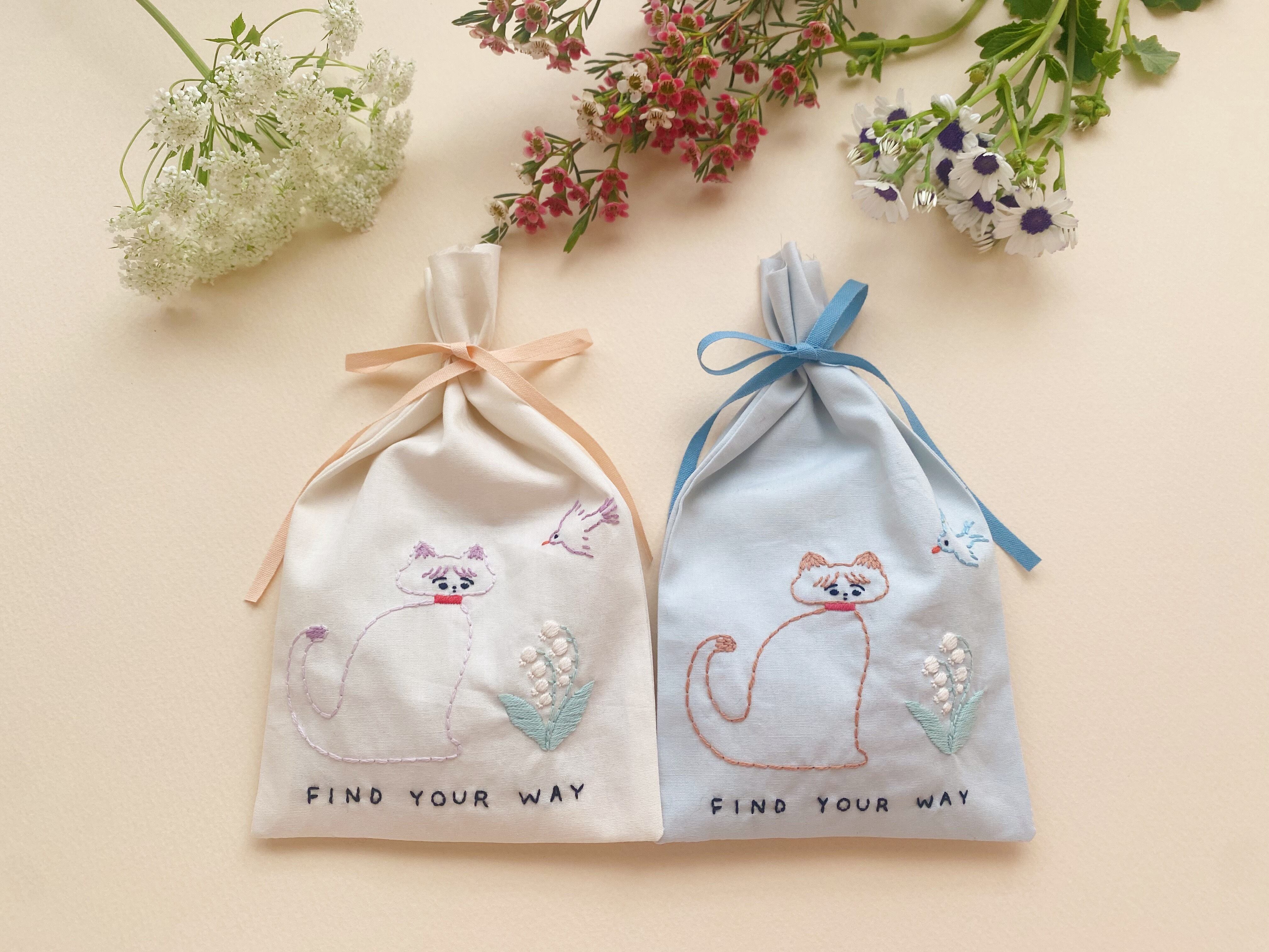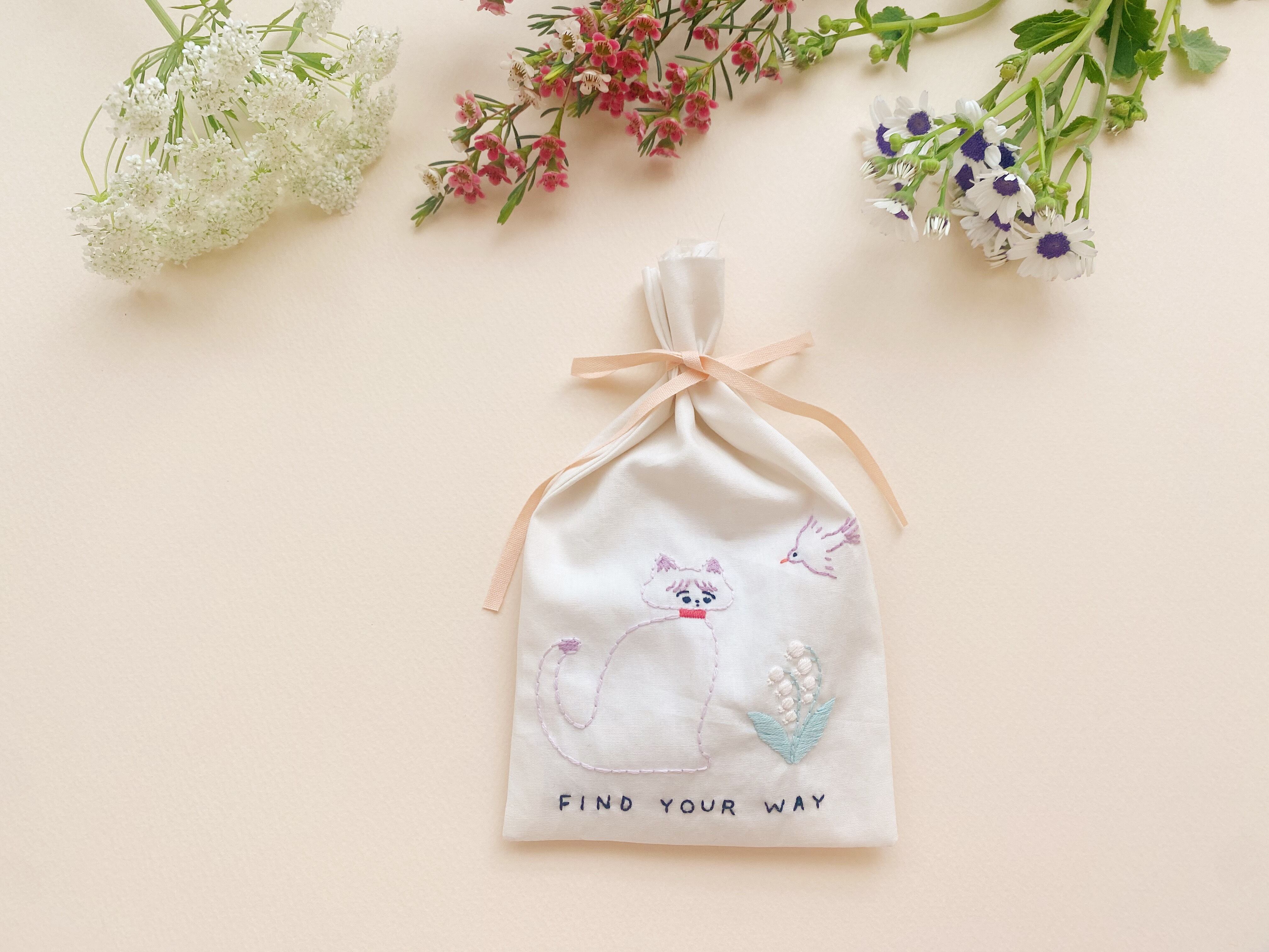 すずらんと佇む、ねこの刺繍のサシェ です。
