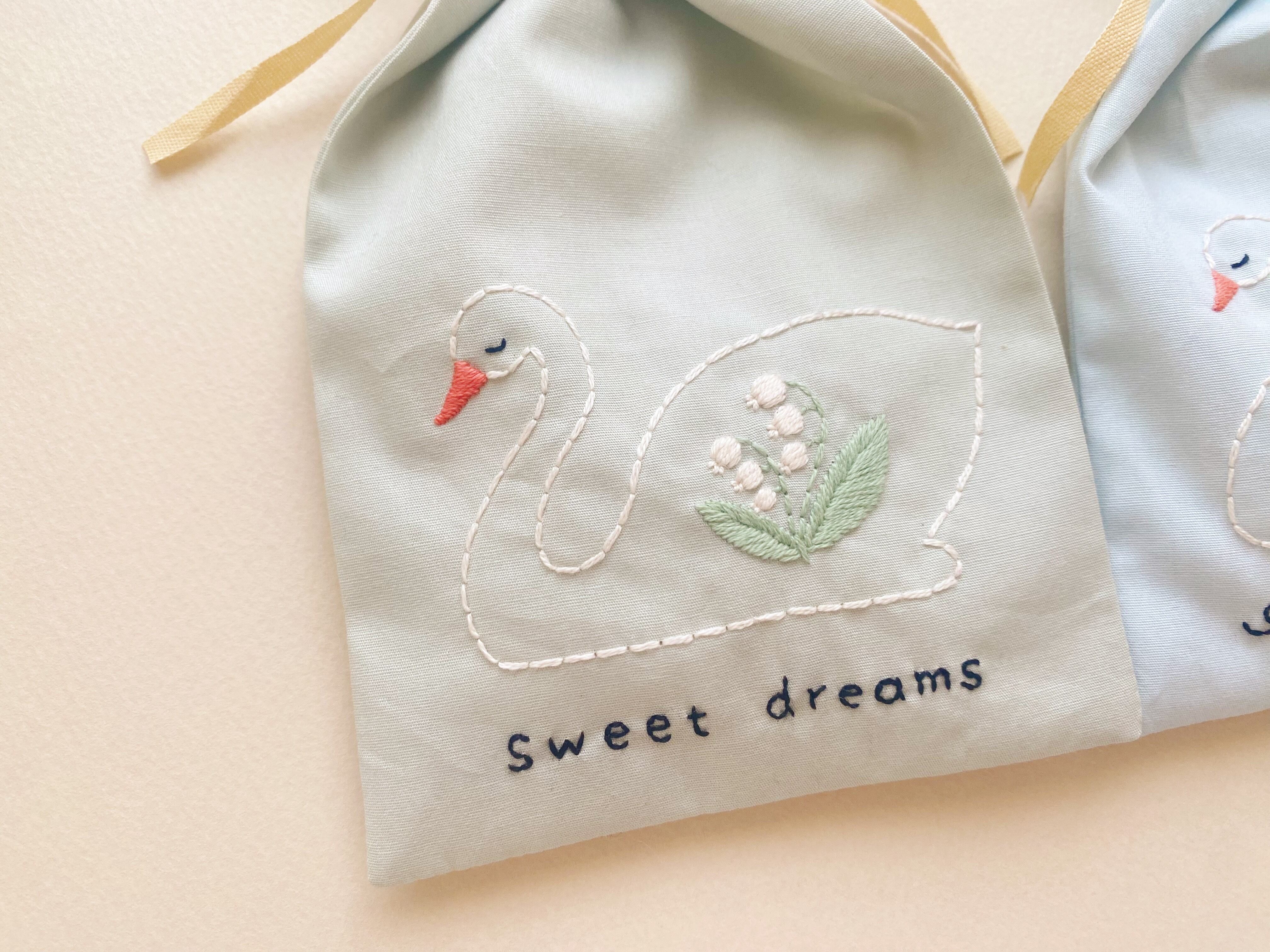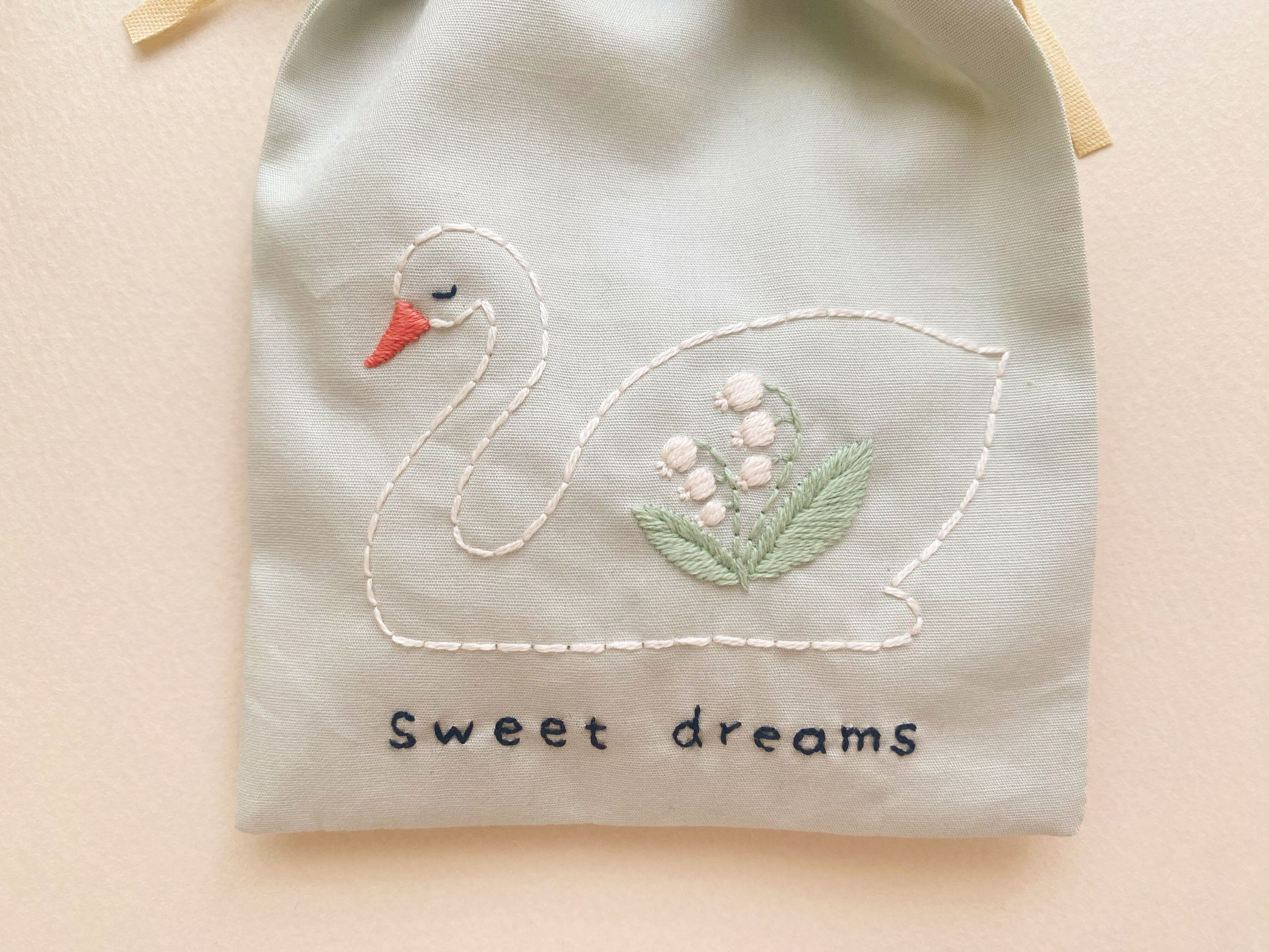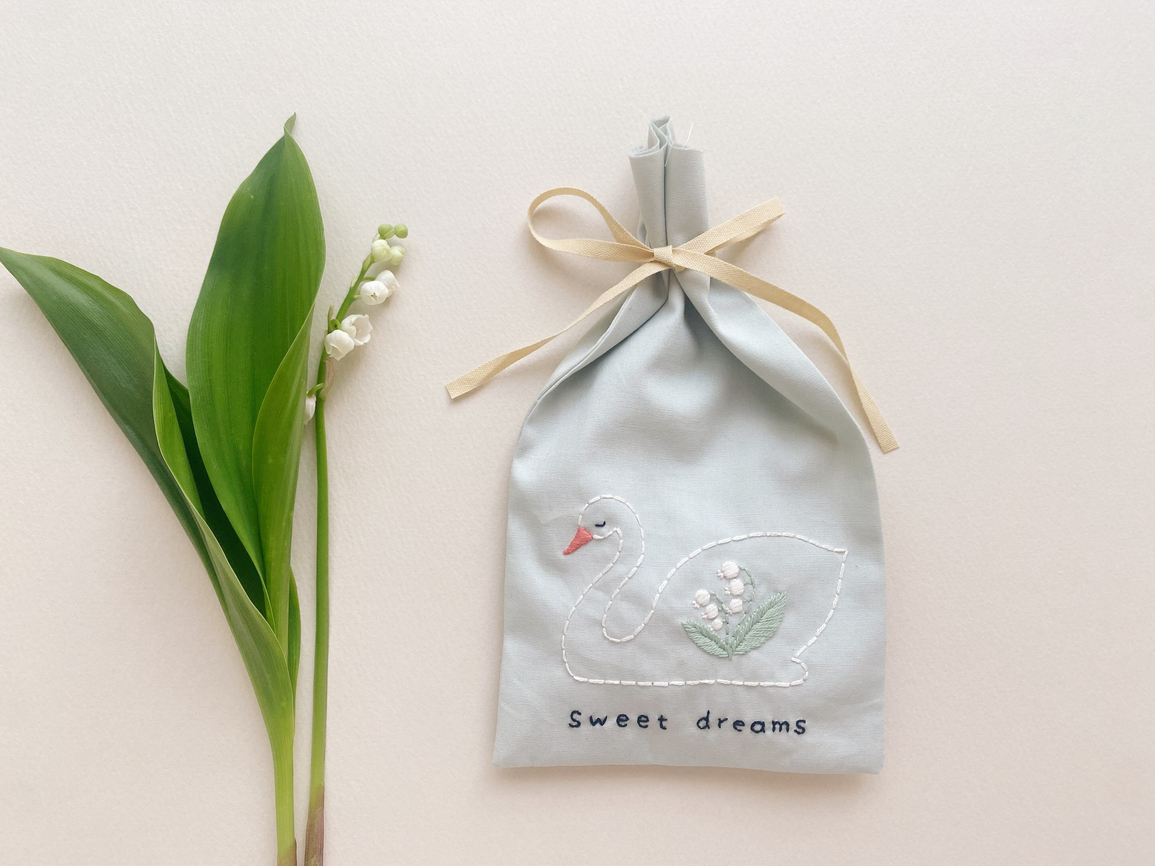 身体にすずらんの刺繍の入った、スワンのサシェ です。