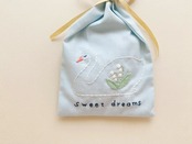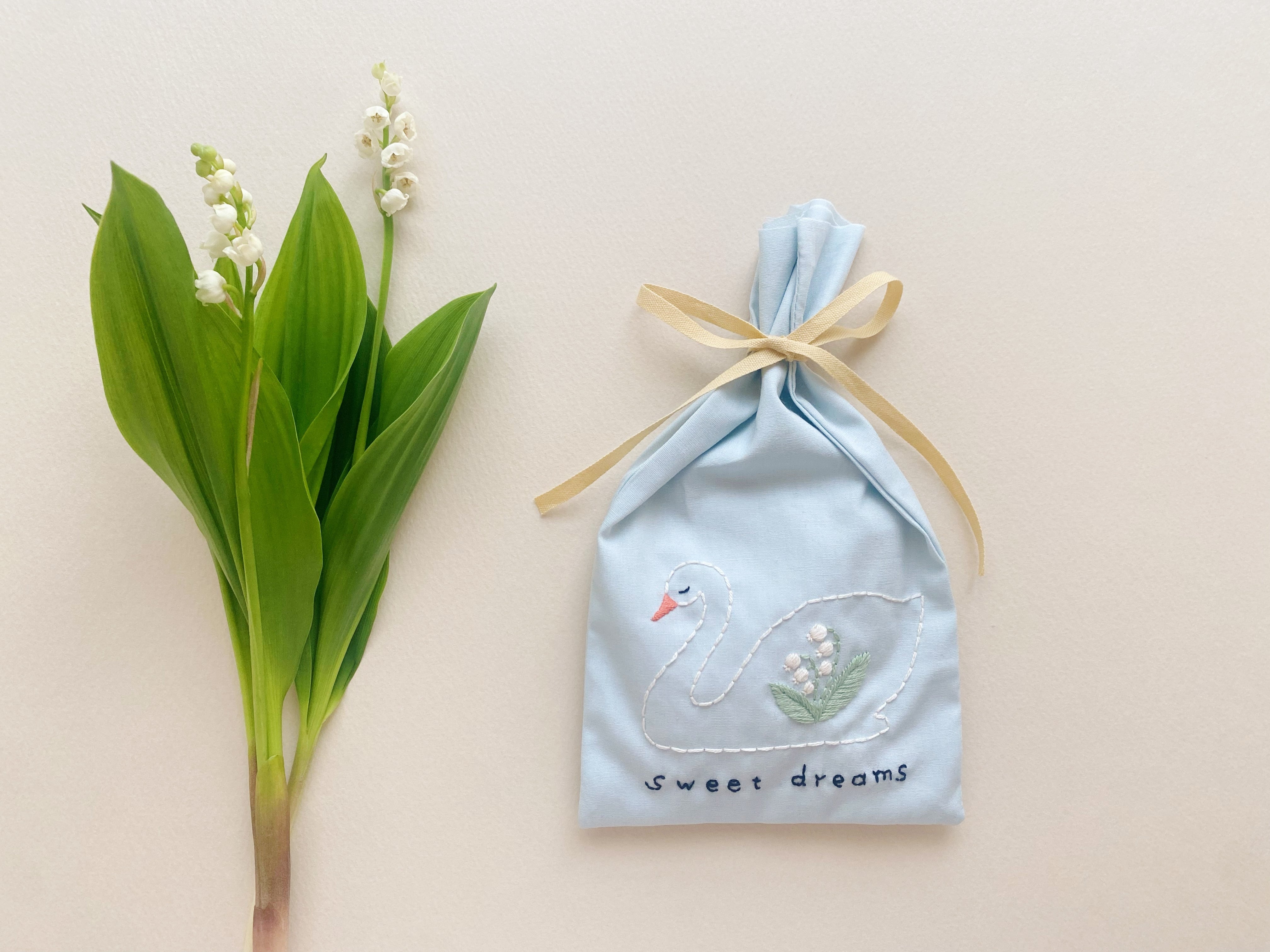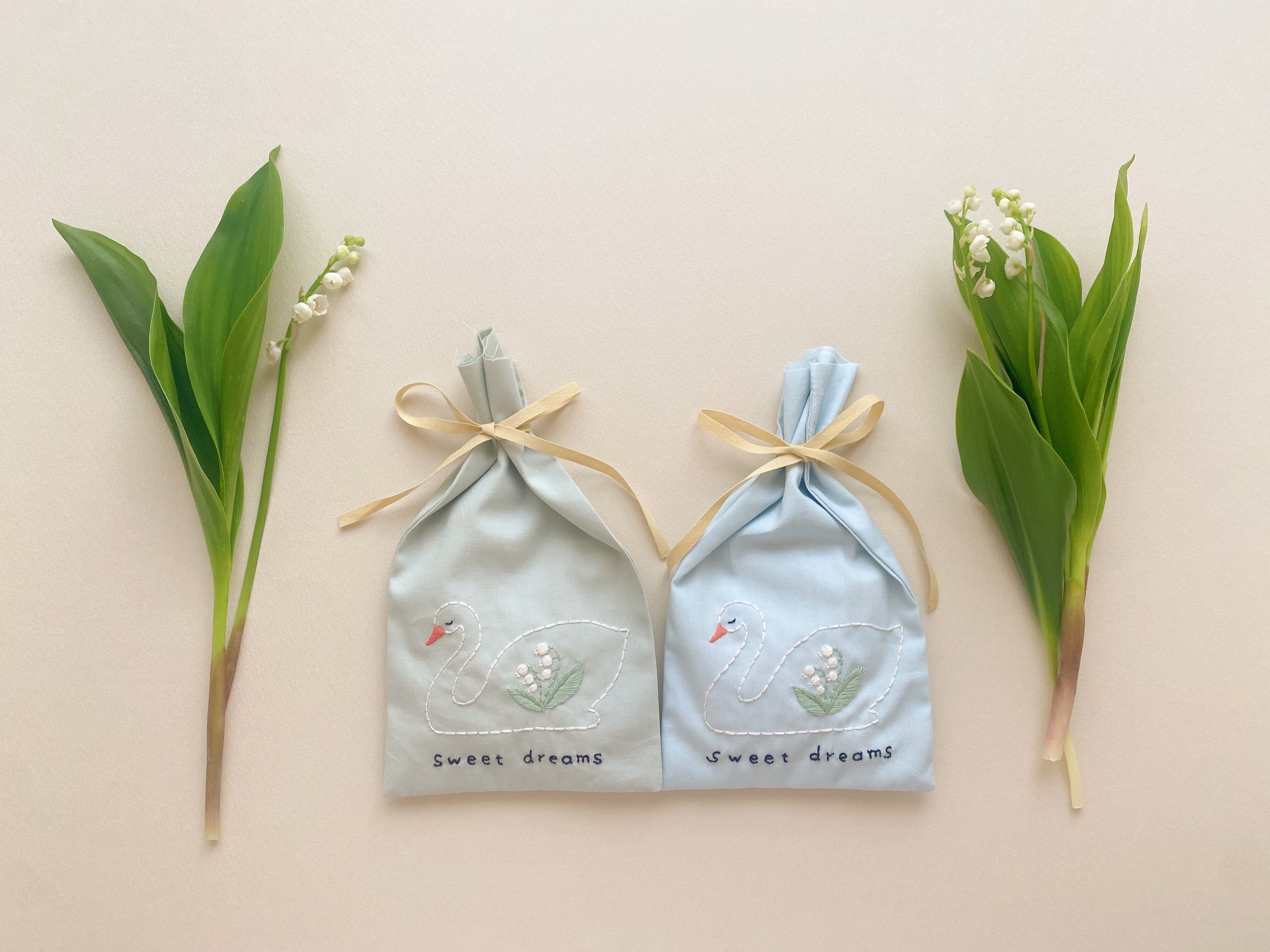 身体にすずらんの刺繍の入った、スワンのサシェ です。