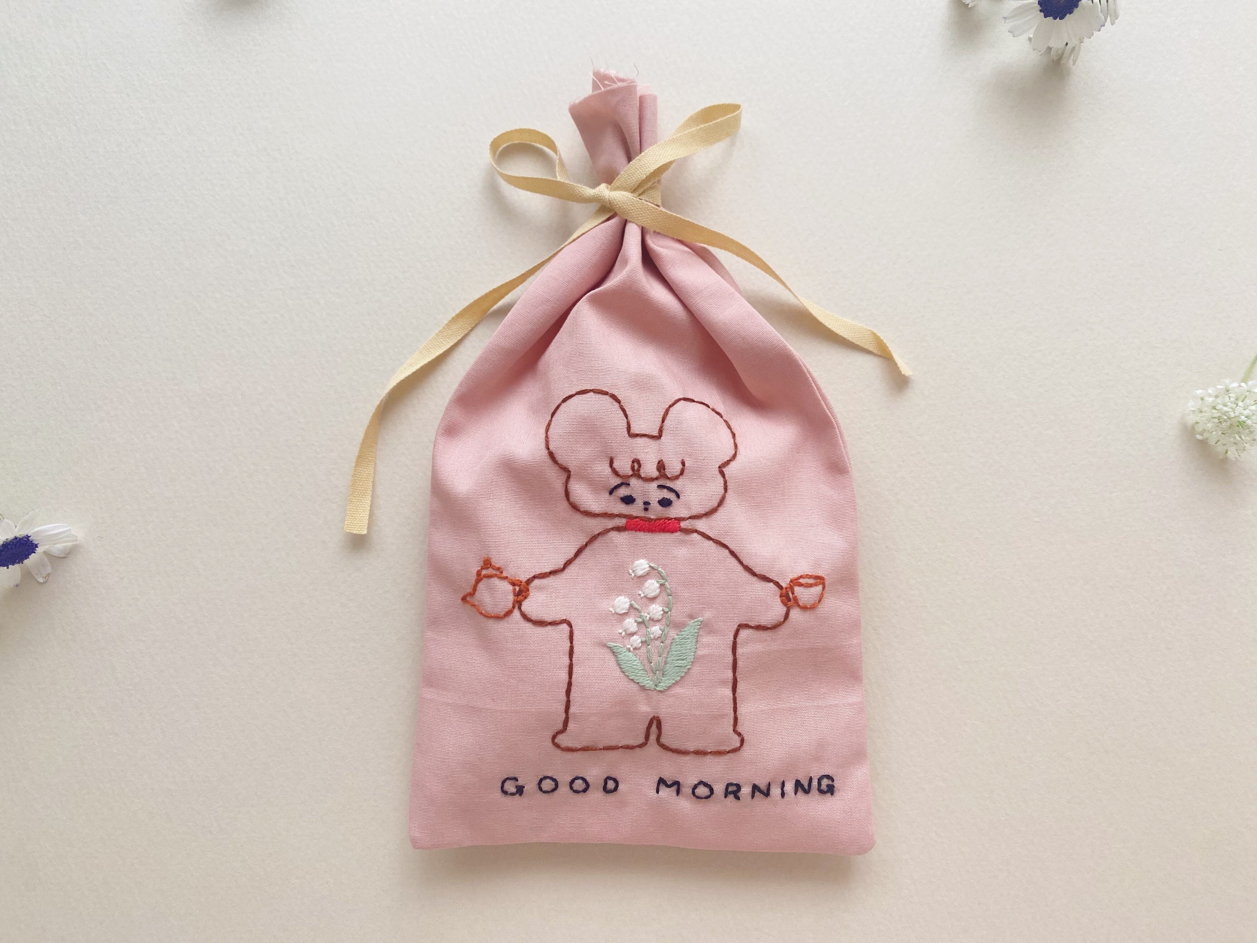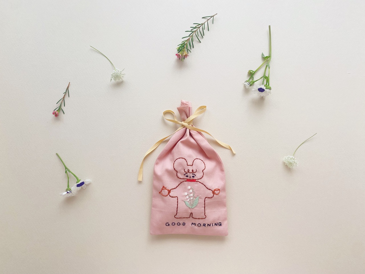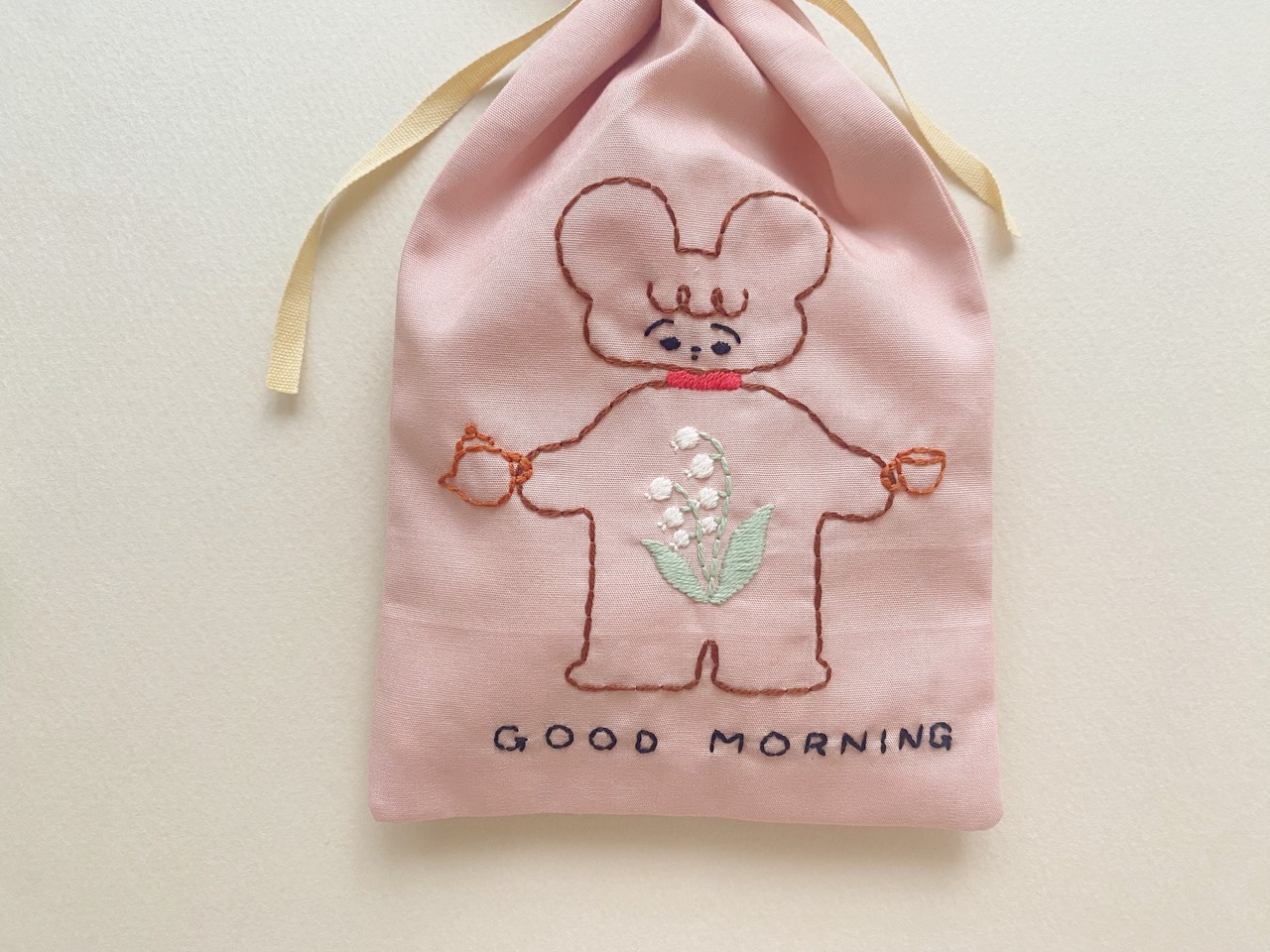 ティーポットとカップを持った、すずらん柄のくまさんのサシェ です。