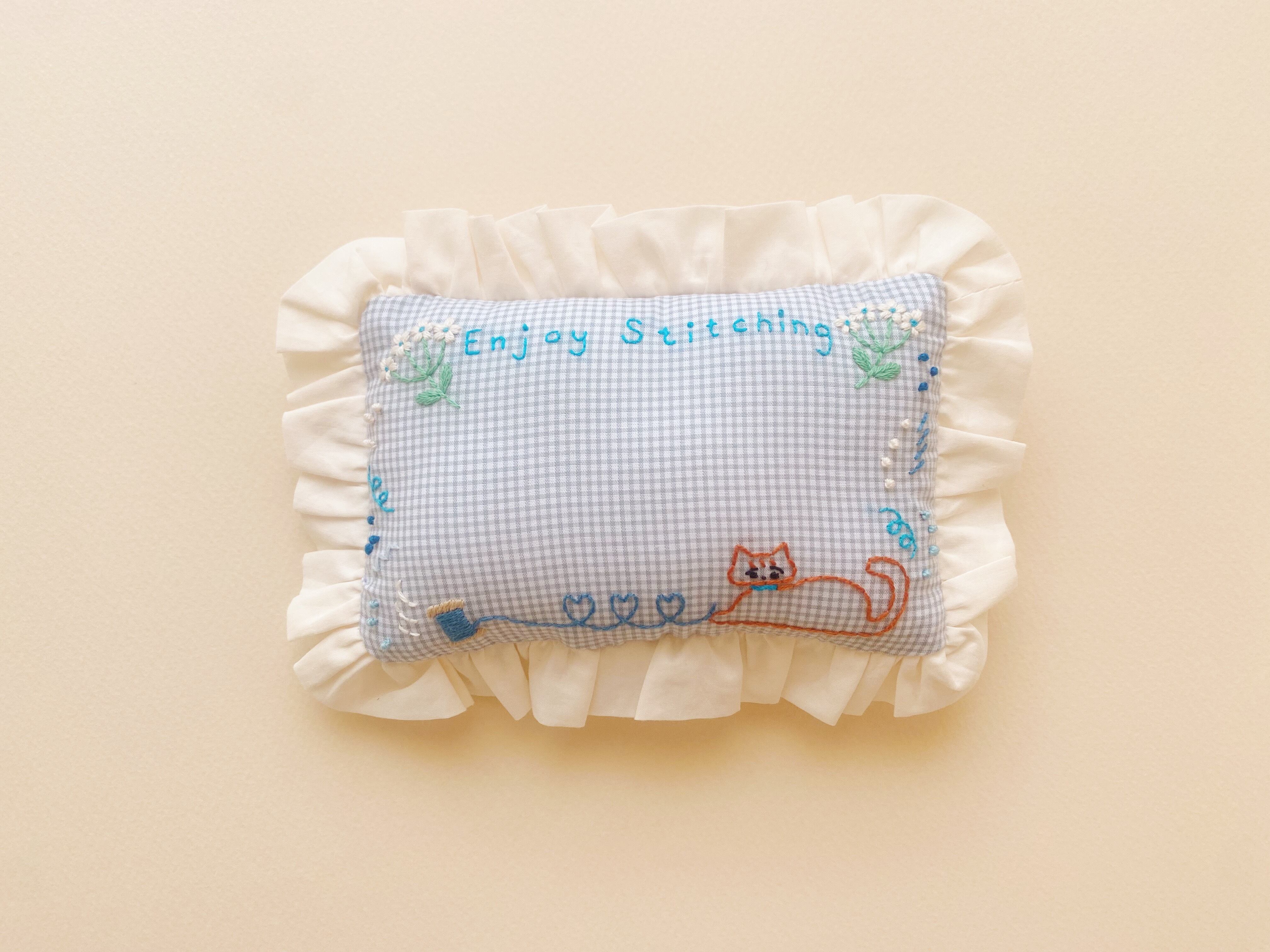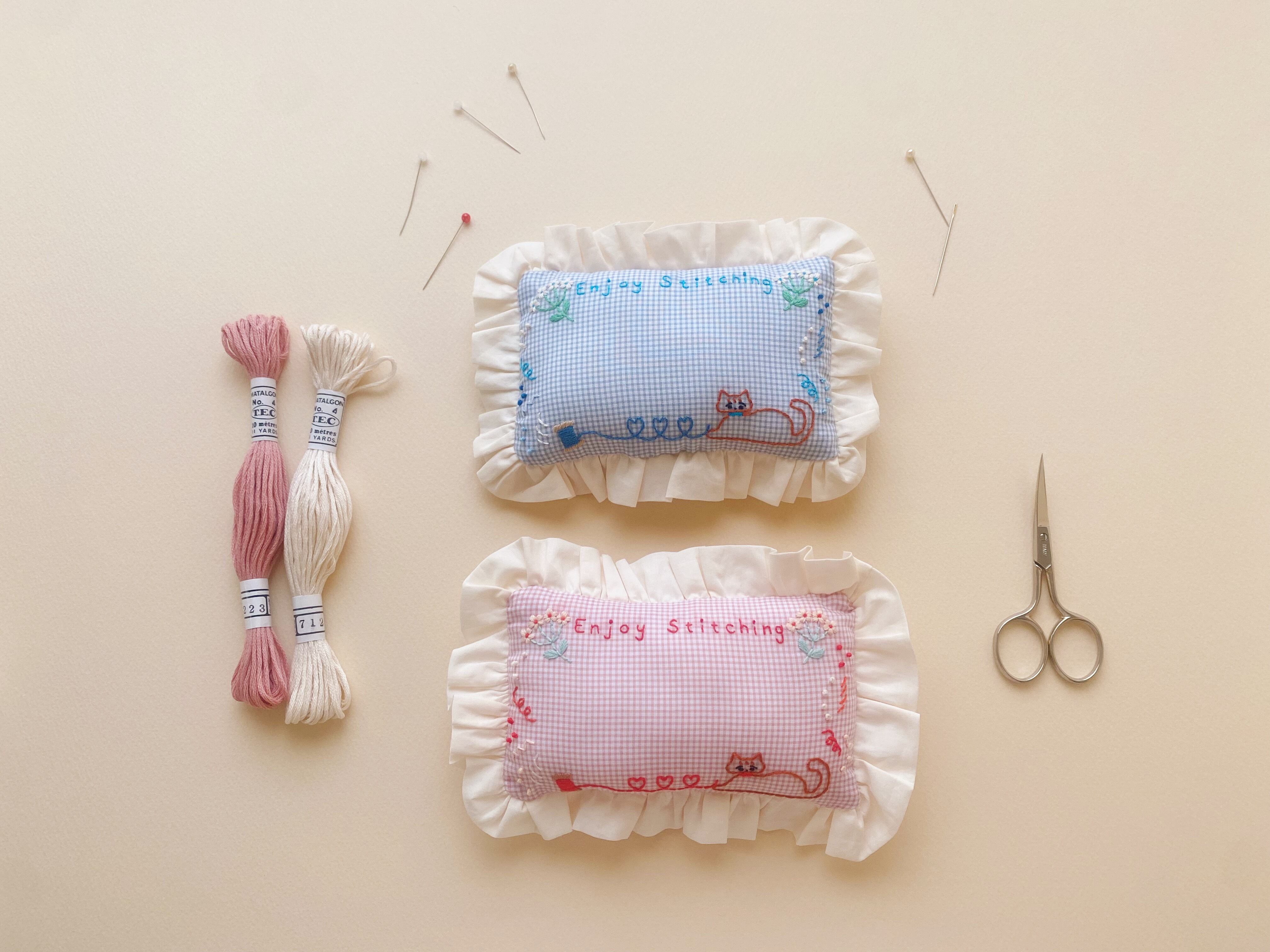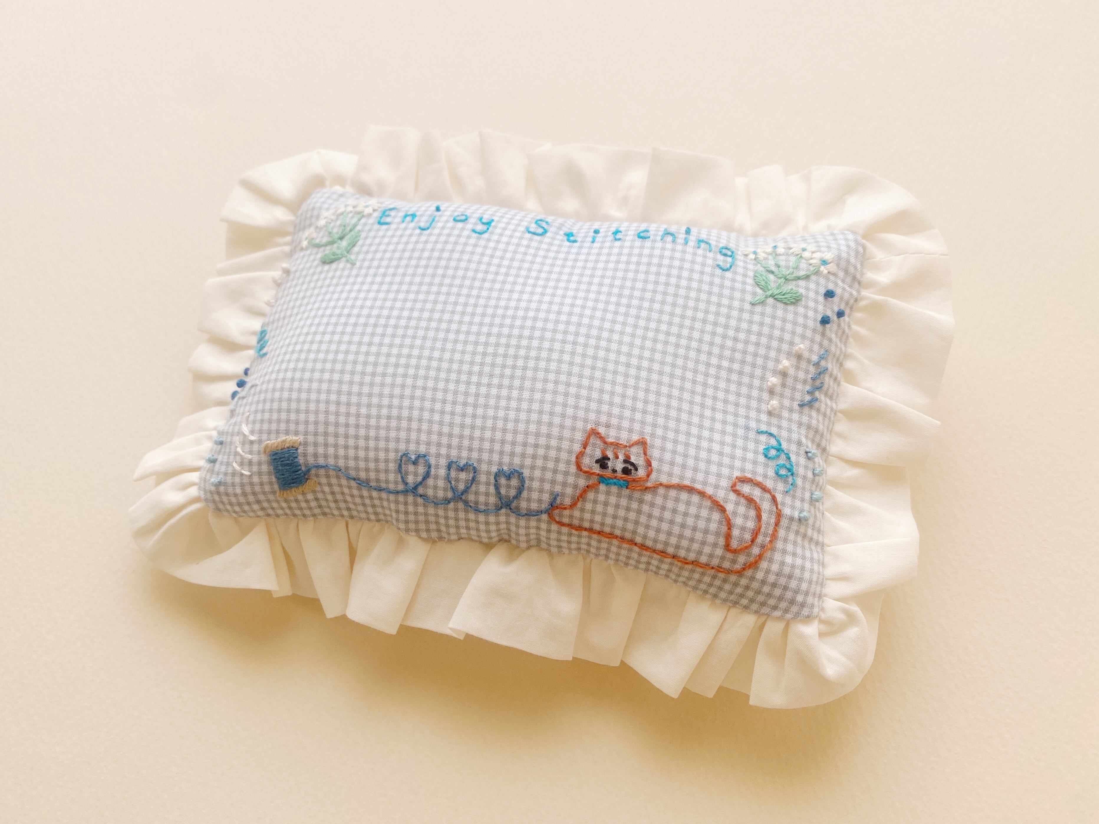 刺繍のねこさんと、フリルがかわいい、たっぷり針を刺さる大きめのピンクッション。これからの刺繍、お裁縫シーズンにお役に立てるといいなと思って作りました。持っているだけで針仕事が楽しくなるような、お道具です。
