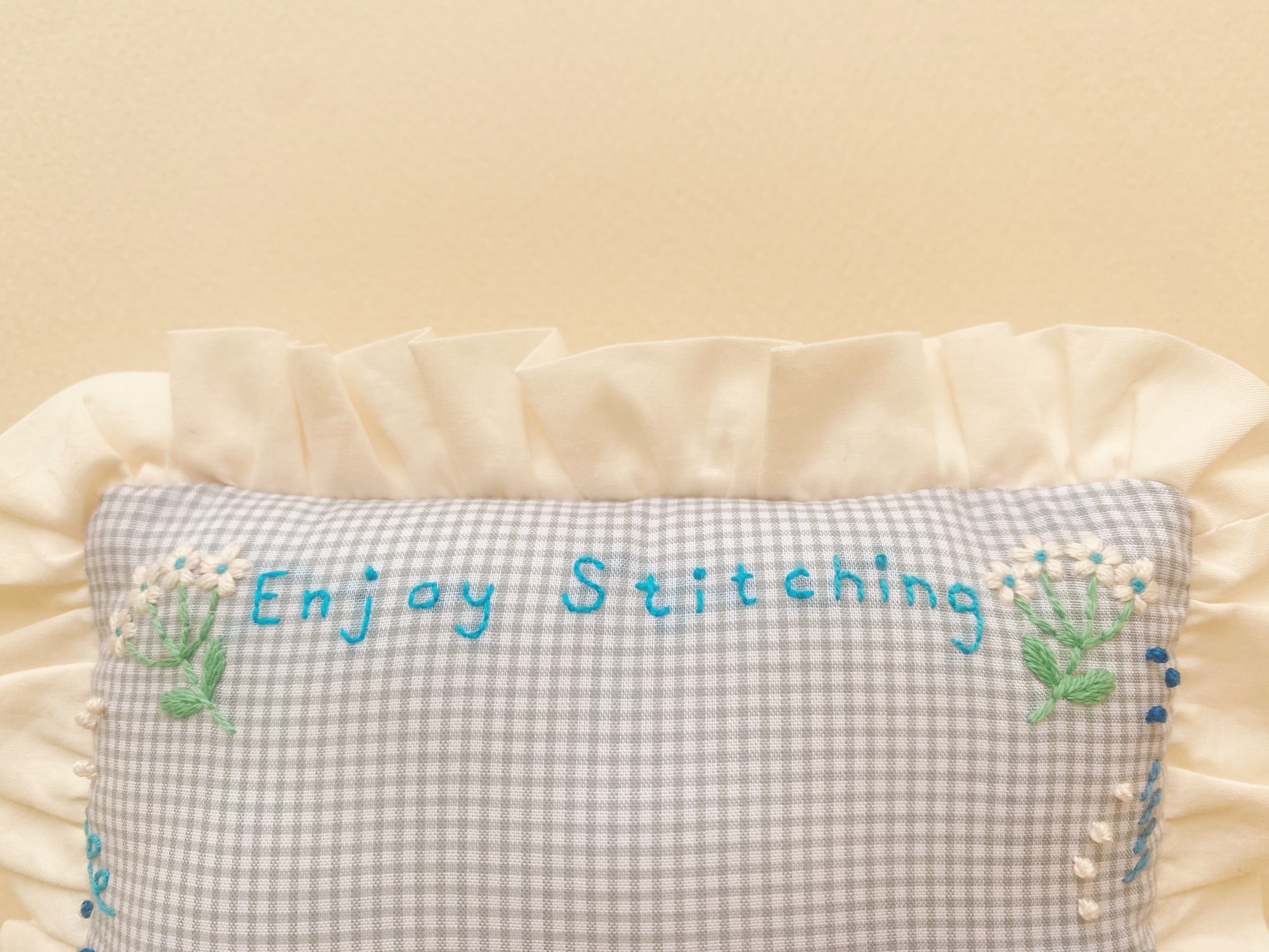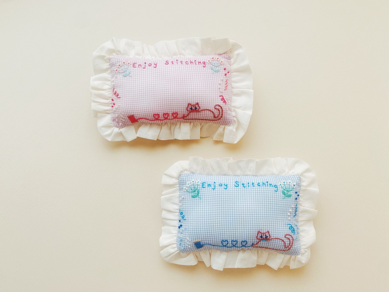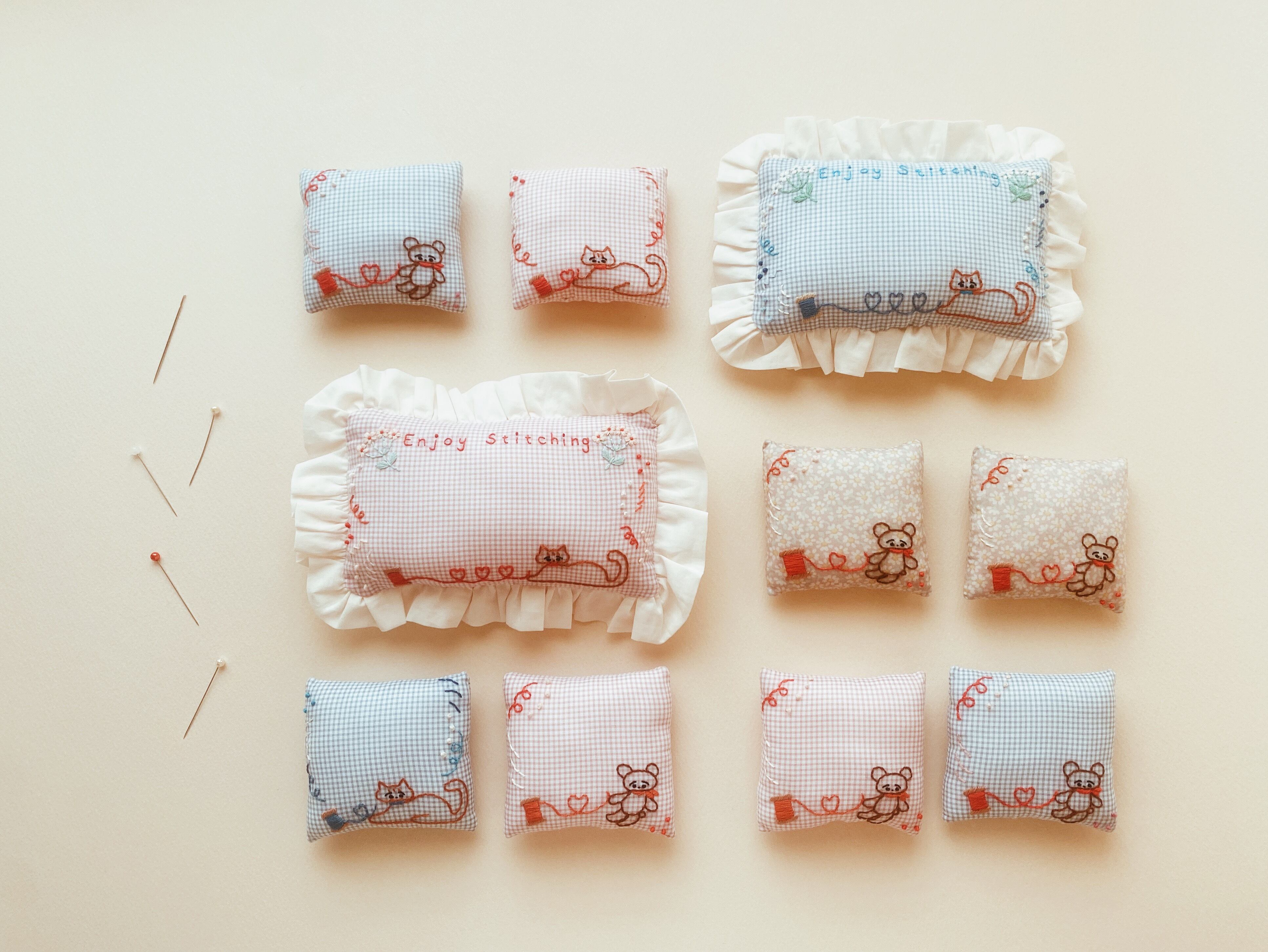 刺繍のねこさんと、フリルがかわいい、たっぷり針を刺さる大きめのピンクッション。これからの刺繍、お裁縫シーズンにお役に立てるといいなと思って作りました。持っているだけで針仕事が楽しくなるような、お道具です。