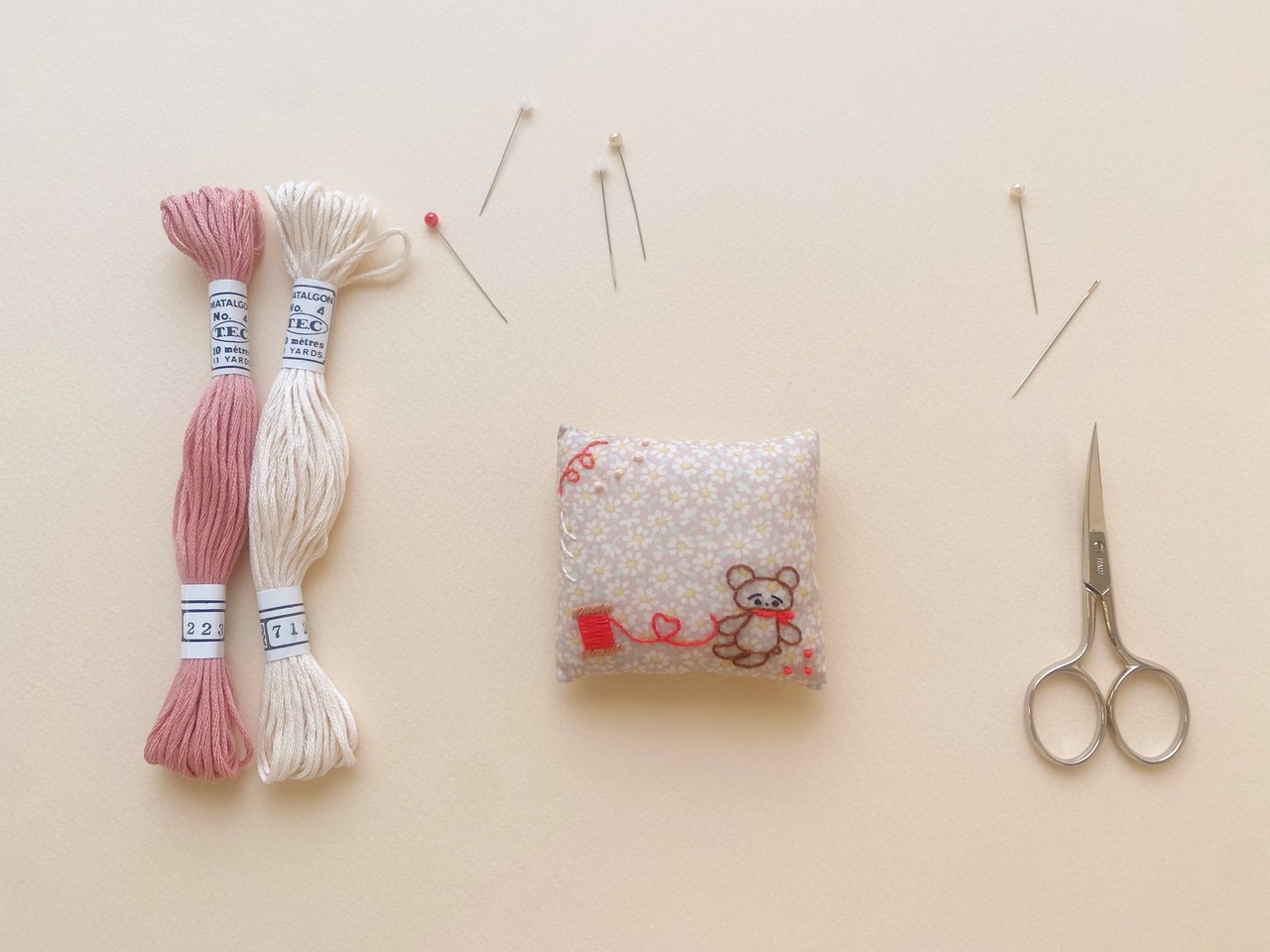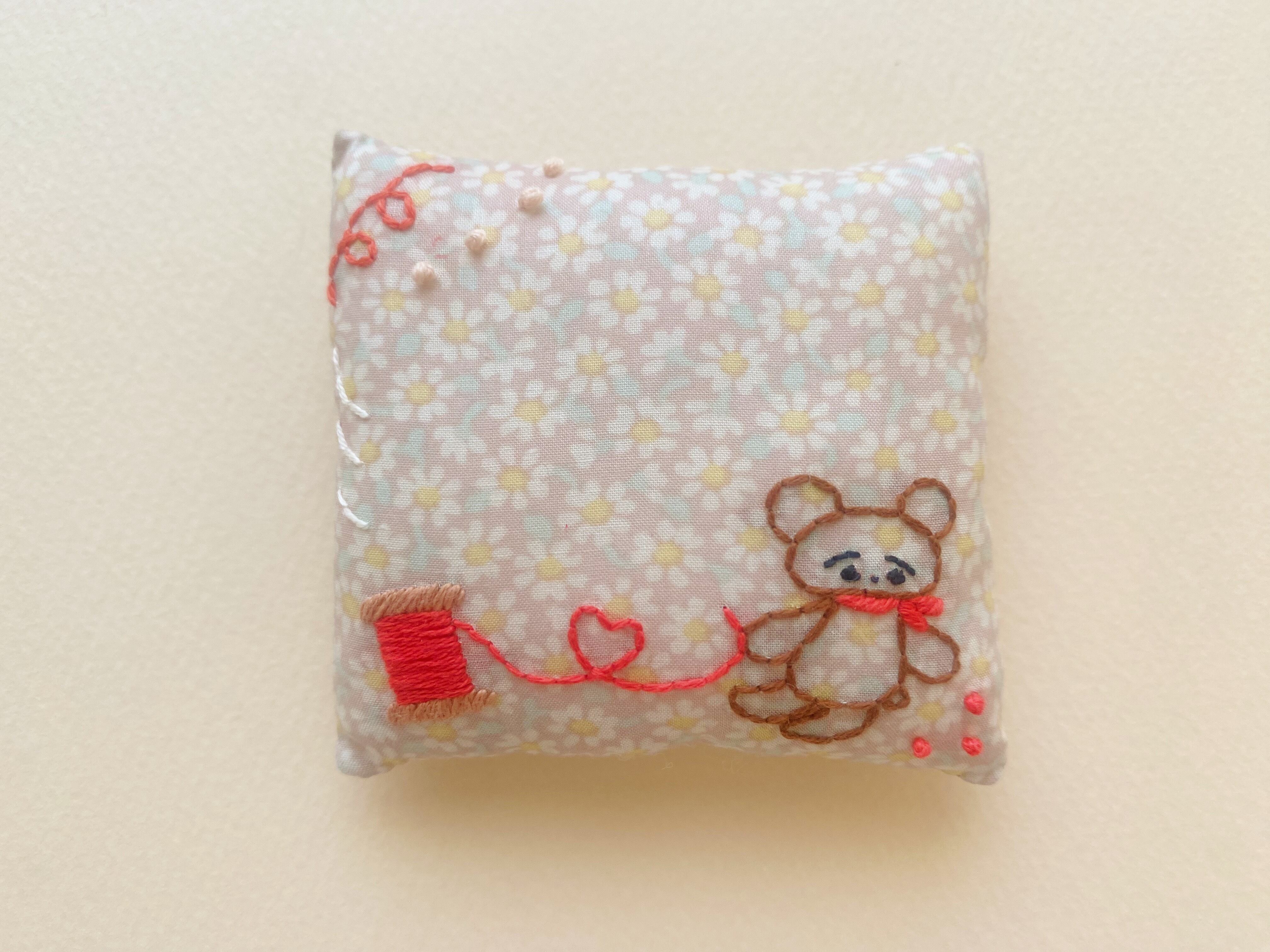 手刺繍の入った小さなピンクッション。これからの刺繍、お裁縫シーズンにお役に立てるといいなと思って作りました。持っているだけで針仕事が楽しくなるような、お道具です。