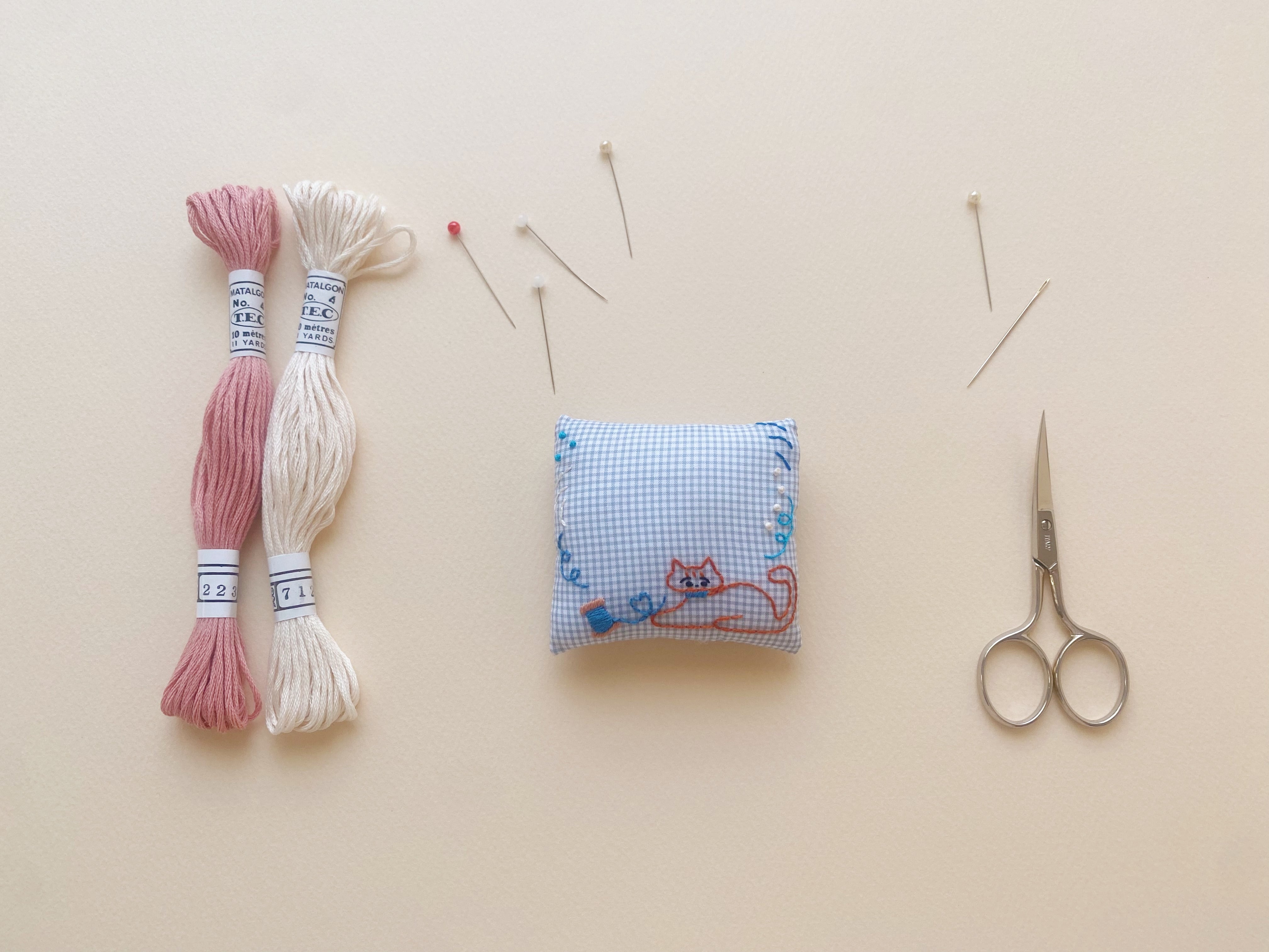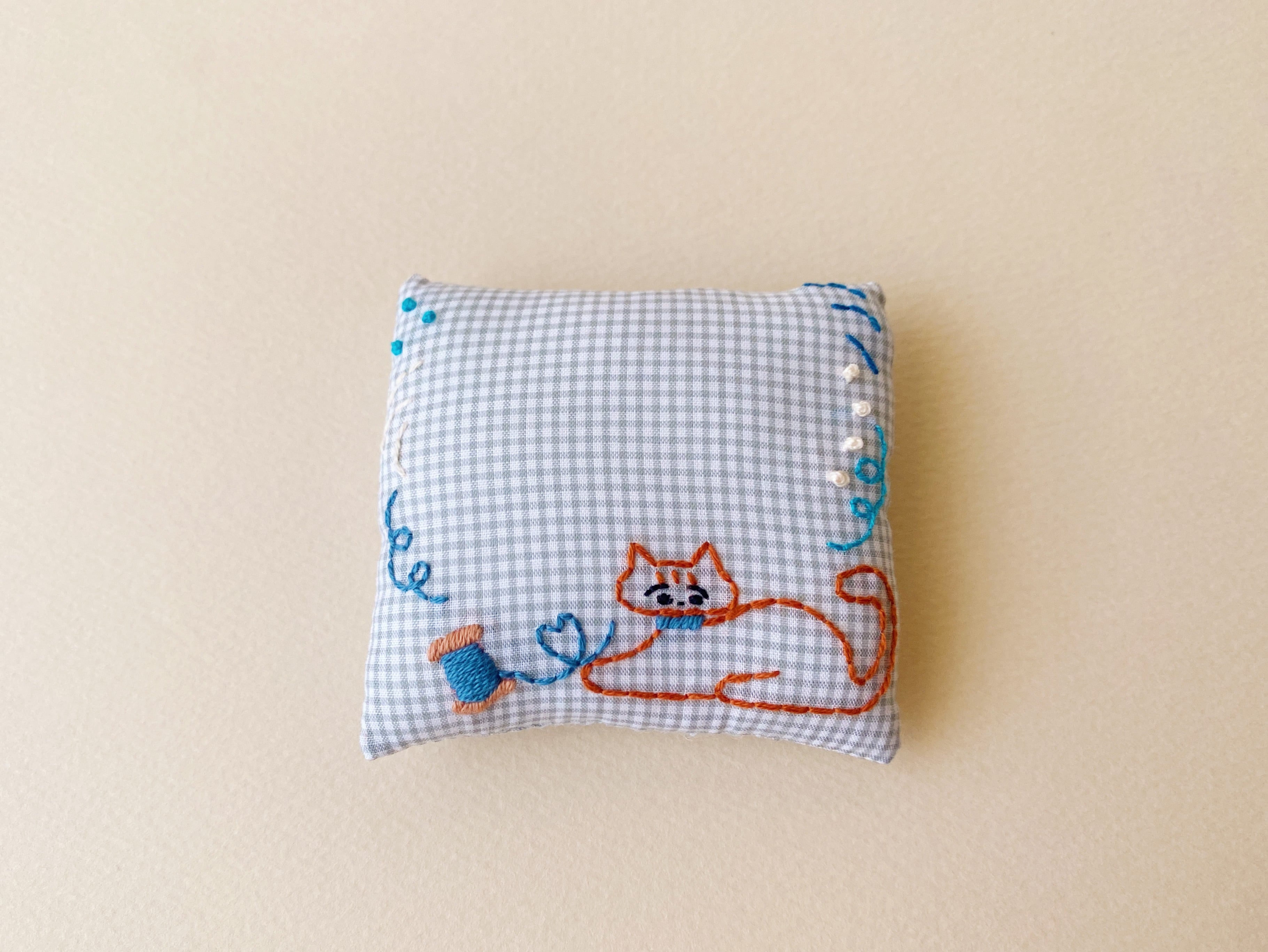 手刺繍の入った小さなピンクッション。これからの刺繍、お裁縫シーズンにお役に立てるといいなと思って作りました。持っているだけで針仕事が楽しくなるような、お道具です。
