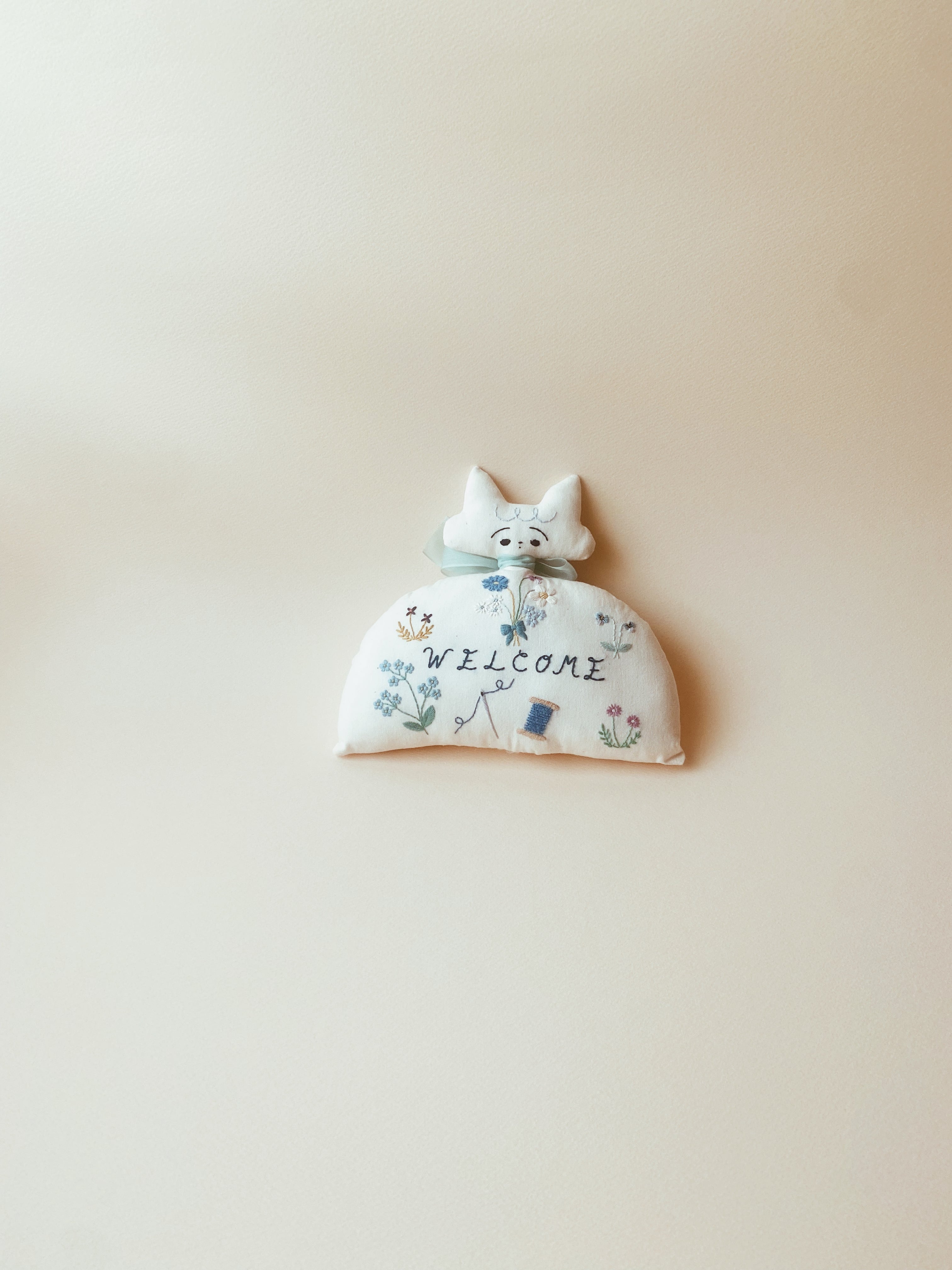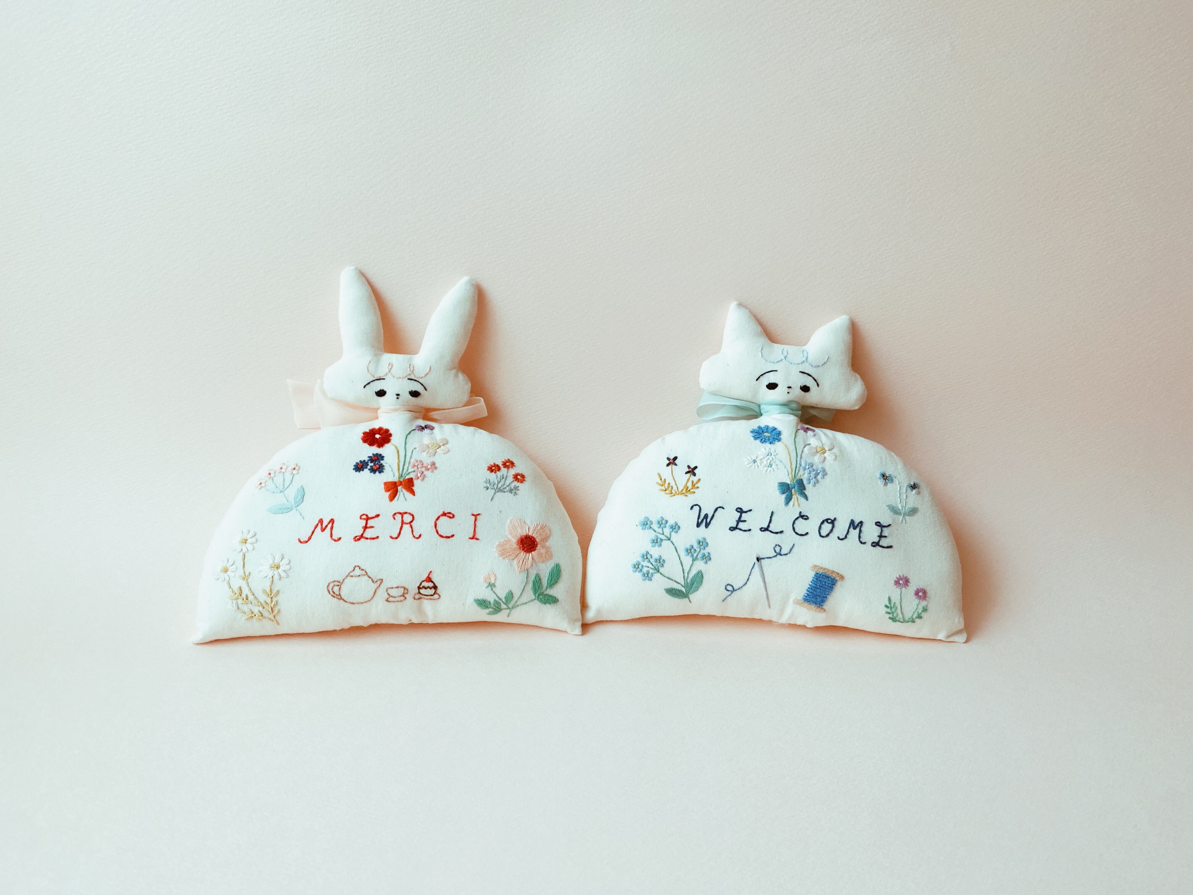 うさぎのメルシーちゃんと、ねこのウェルカムくんがいます。一体で飾っても、二体並べてもかわいいです。