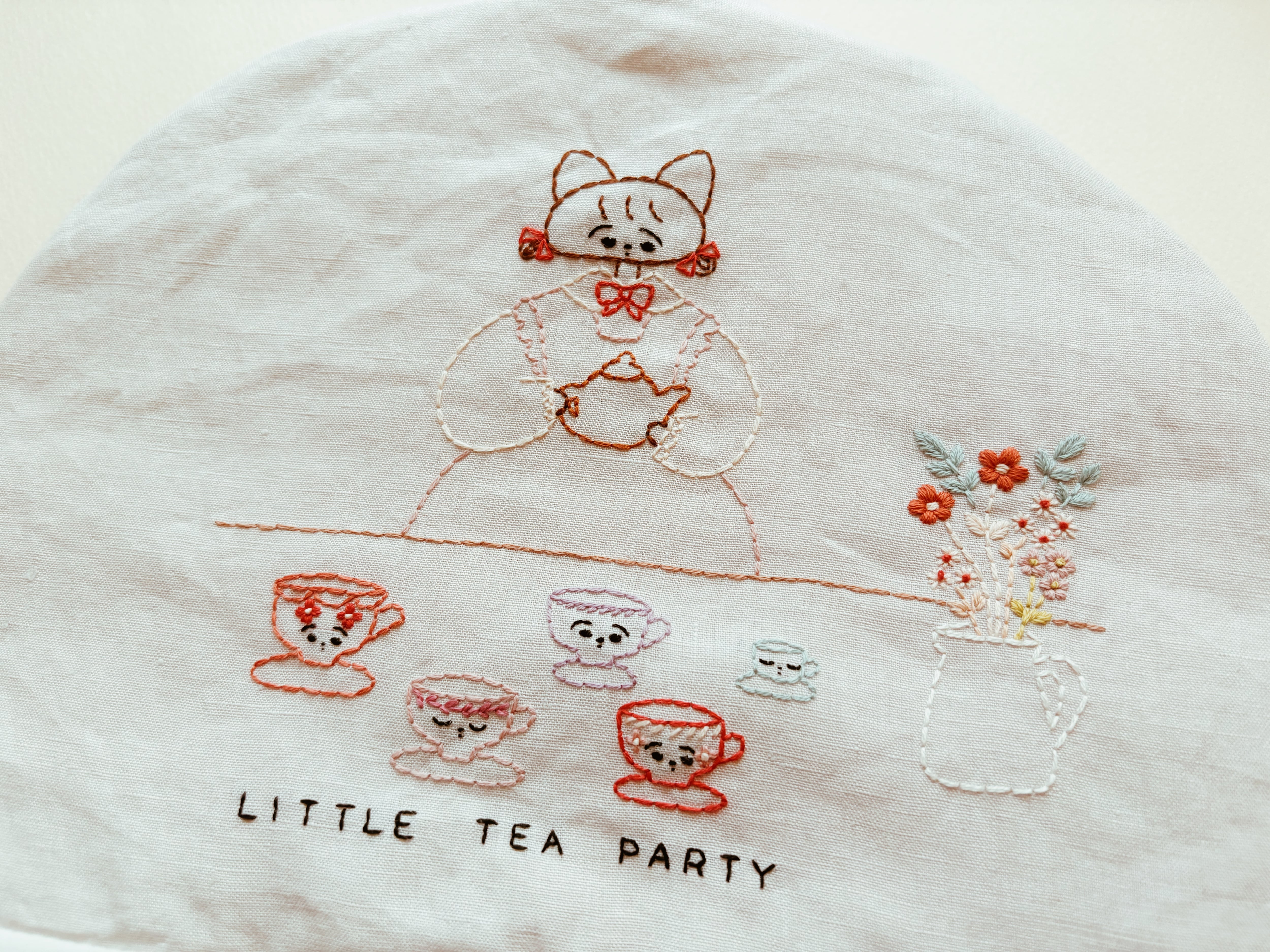 表布は上質なリネンの布に、刺繍しました。下のパイピング部分は、とっておきのリバティーの布でくるんでいます。