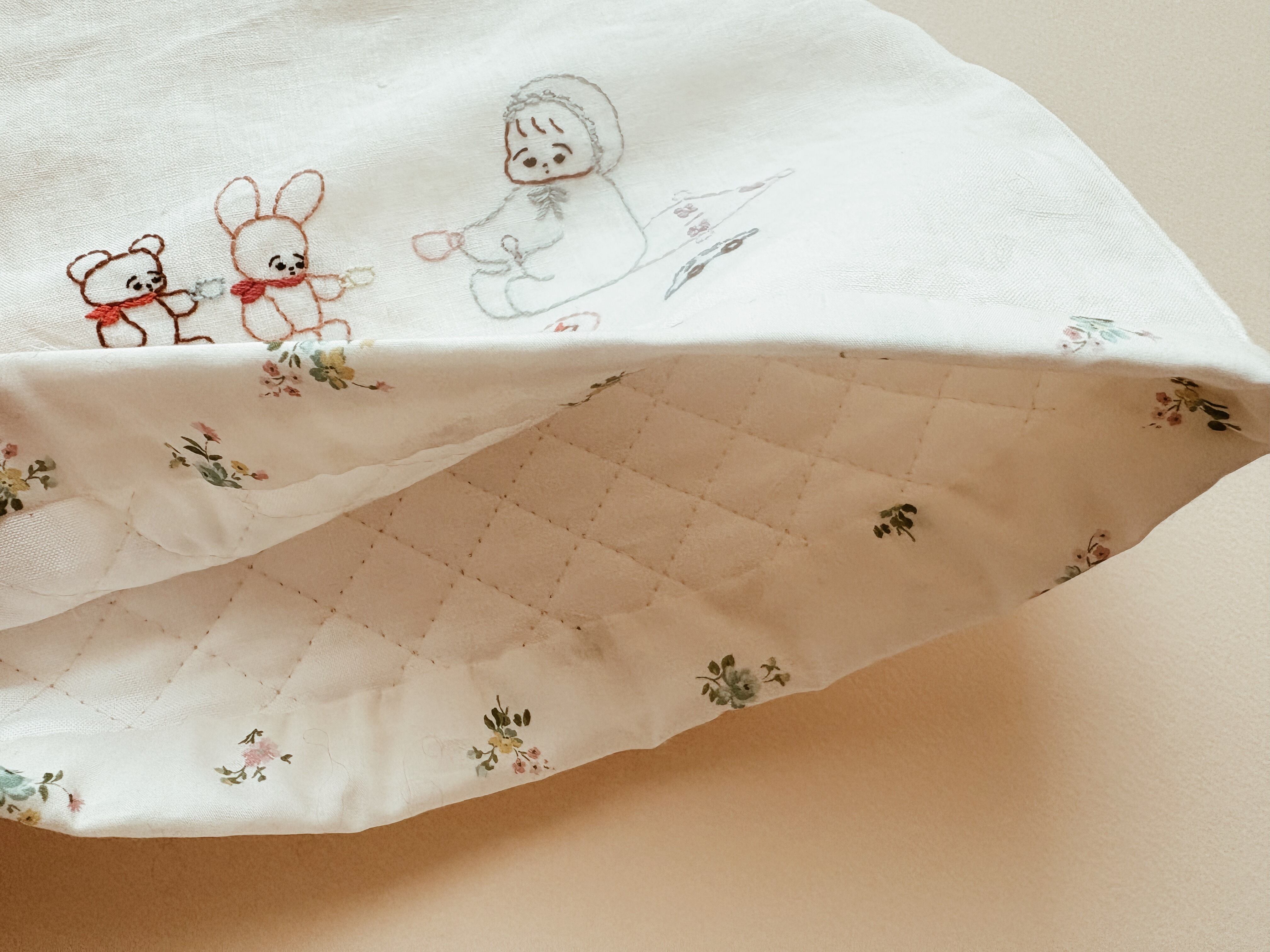 表布は上質なリネンの布に、刺繍しました。下のパイピング部分は、とっておきのリバティーの布でくるんでいます。