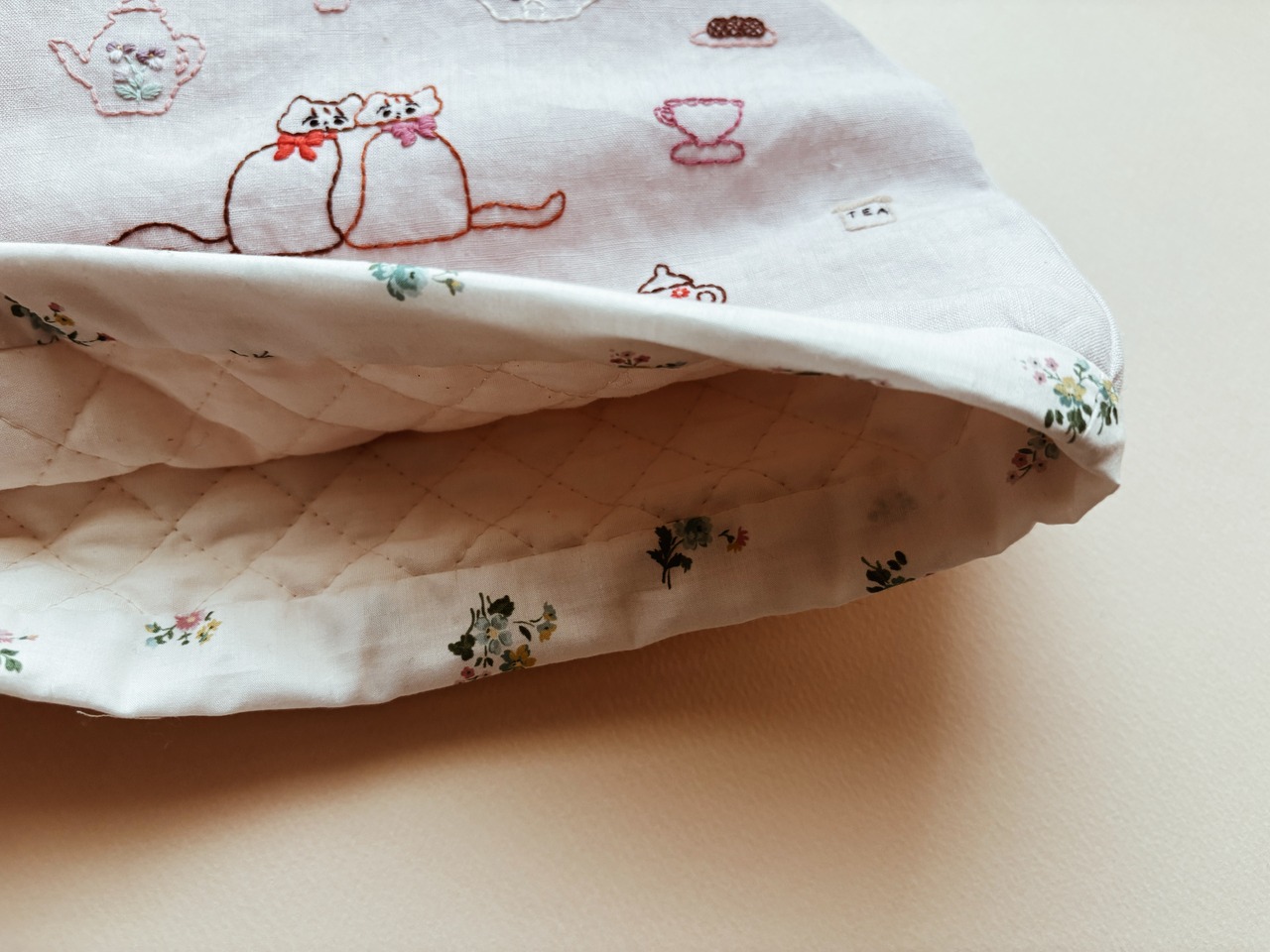表布は上質なリネンの布に、刺繍しました。下のパイピング部分は、とっておきのリバティーの布でくるんでいます。