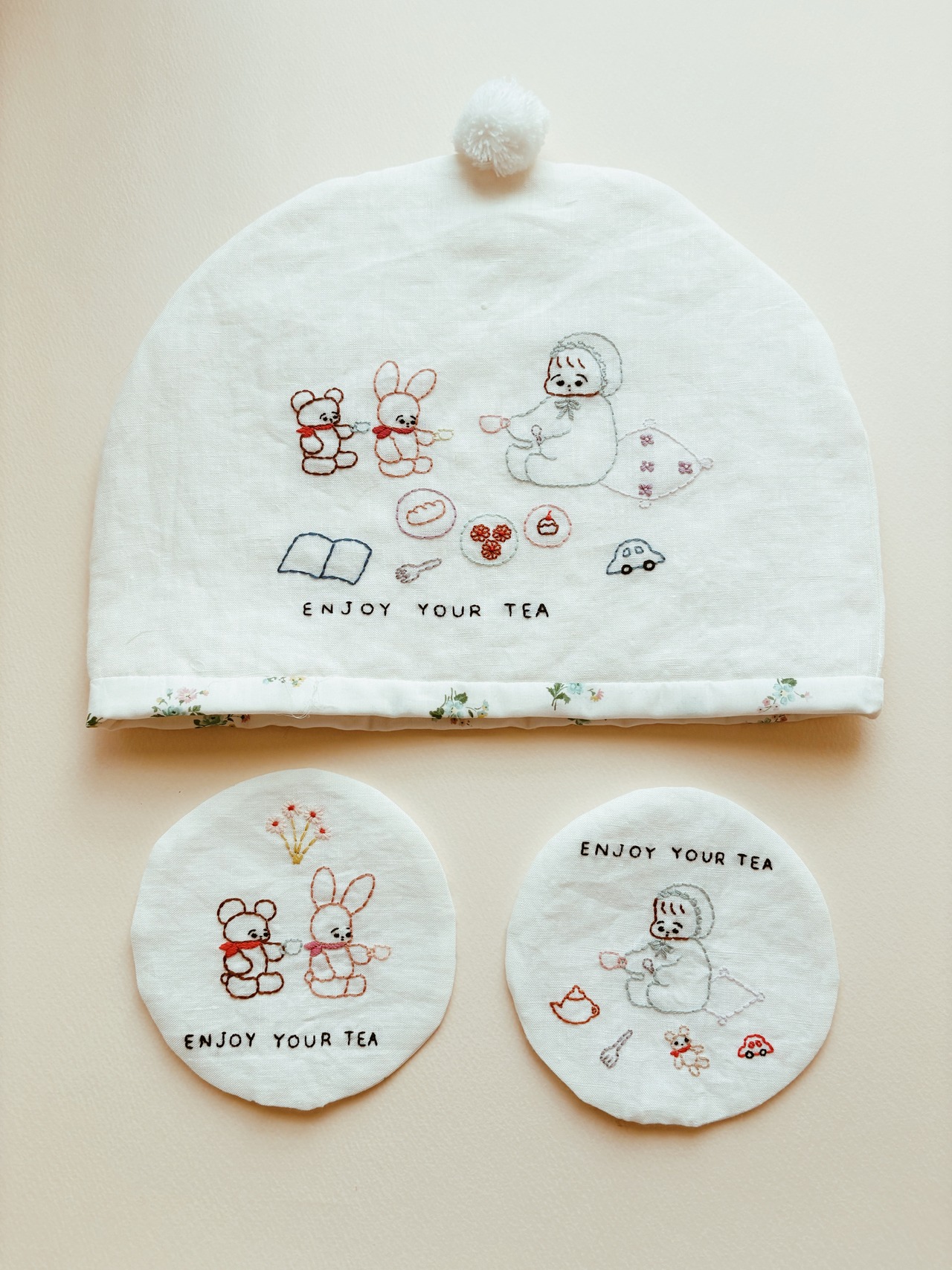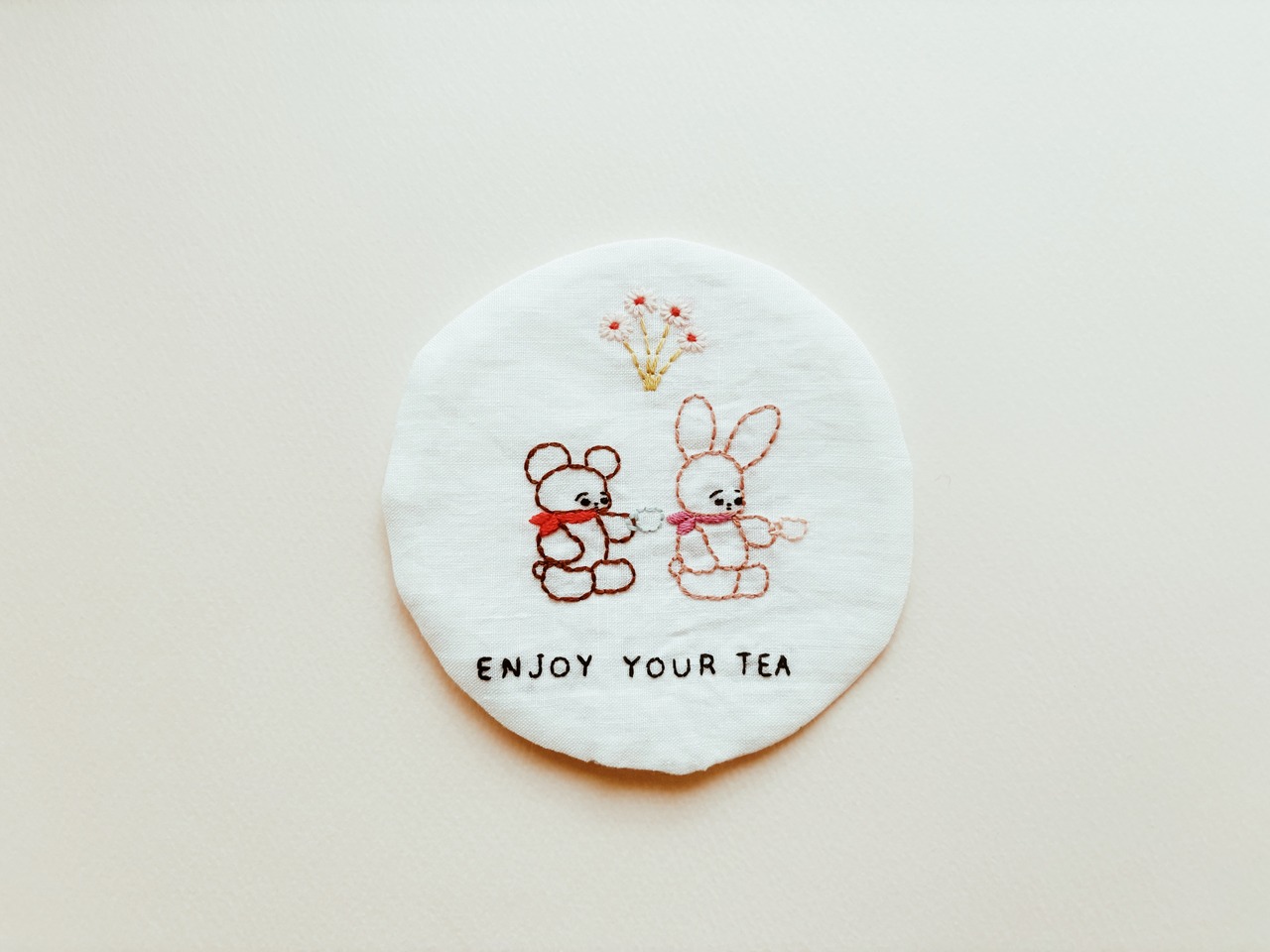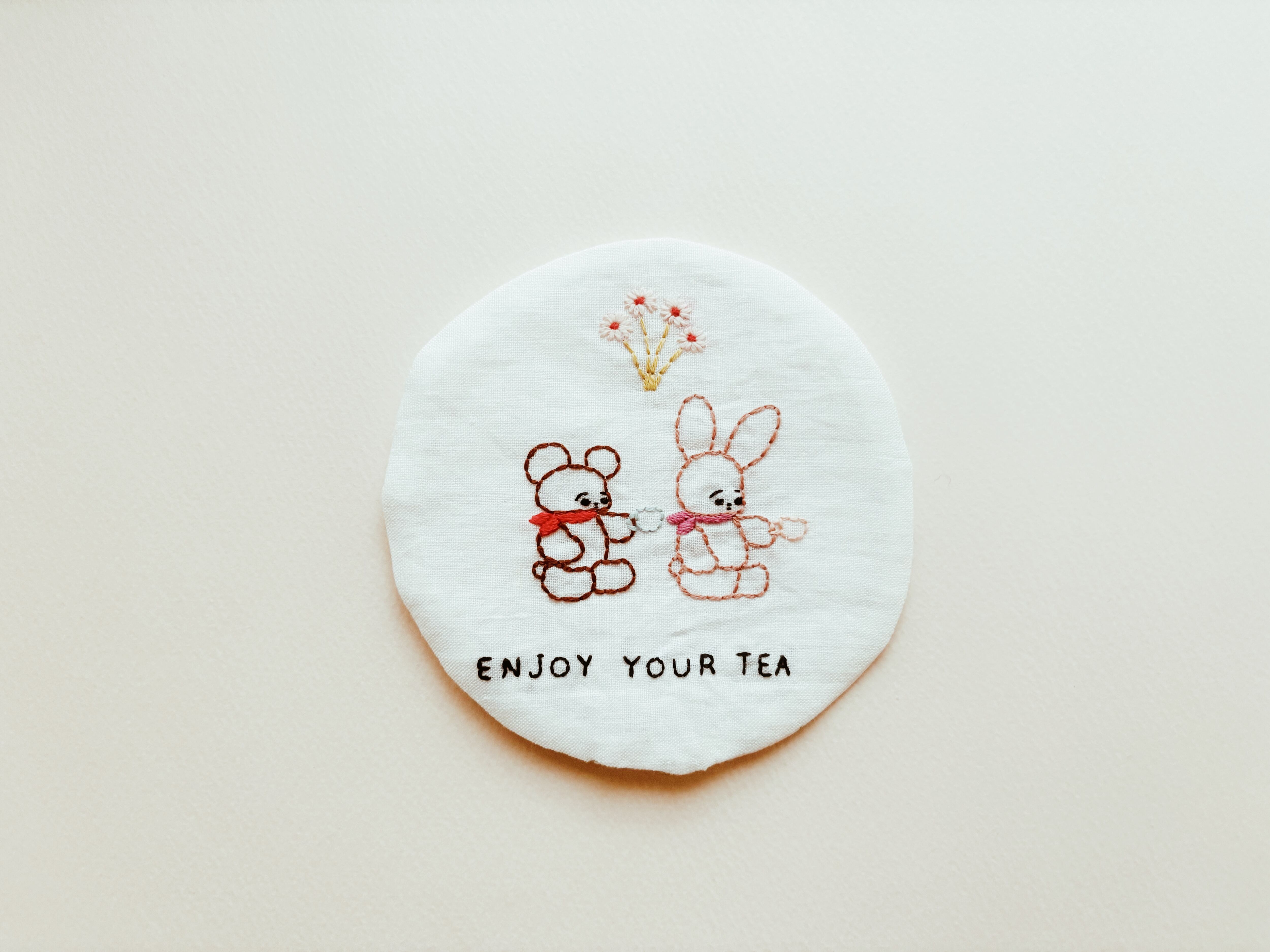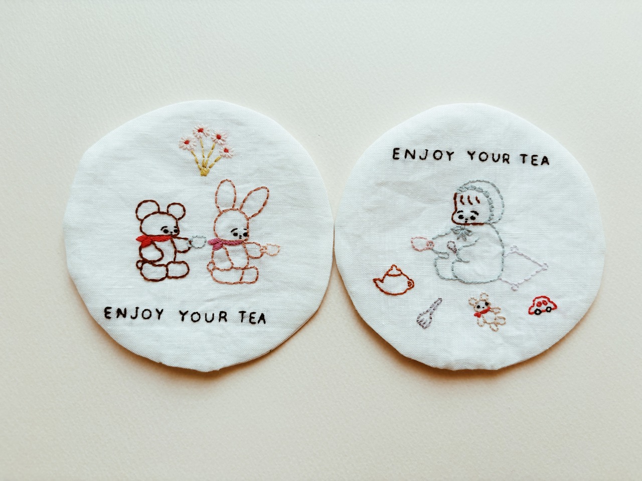 Linen coaster / Enjoy Your Tea / Bear& bunny